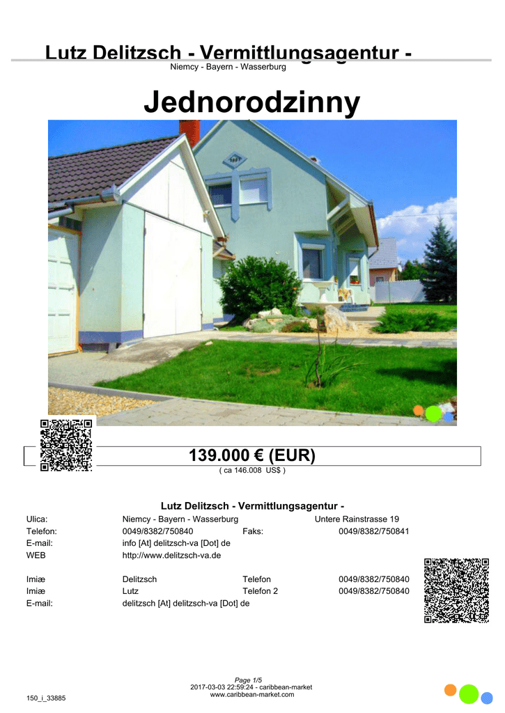 Lutz Delitzsch - Vermittlungsagentur Niemcy - Bayern - Wasserburg Jednorodzinny Poùoýenie obiektu : Úwiat - Europe - Europe 139.000 € (EUR) ( ca 146.008 US$ ) Lutz Delitzsch - Vermittlungsagentur Ulica: Telefon: E-mail: WEB Niemcy - Bayern - Wasserburg 0049/8382/750840 Faks: info [At] delitzsch-va [Dot] de http://www.delitzsch-va.de Imiæ Imiæ E-mail: Delitzsch Telefon Lutz Telefon 2 delitzsch [At] delitzsch-va [Dot] de 150_i_33885 Page 1/5 2017-03-03 22:59:24 - caribbean-market www.caribbean-market.com Untere Rainstrasse 19 0049/8382/750841 0049/8382/750840 0049/8382/750840 Lutz Delitzsch - Vermittlungsagentur Niemcy - Bayern - Wasserburg Numer kodu Typ budynku Poùoýenie Materiaùy Property Address 150_i_33885 Jednorodzinny Zakaz wjazdu Stein Somogyaszalo / Ungarn Numer kodu Nr referencyjny Status objektet Rok HU-11-2208-0 Zakaz wjazdu Zakaz wjazdu Powierzchnia dziaùki Firma Ýycie Kuchnia Sypialnie Zùy Opinie Toaleta 600 m2 Powierzchnia 135 m2 1 Biznes Inne Usùugi Garaý Carport zadaszony taras 2 Akcesoria Dzierýawa Taras Balkon Jetty Pokój Party Klimatyzacja Resort Ogród Pralnia Goràcy zadaszony taras ogrodzony / murem 150_i_33885 Page 2/5 2017-03-03 22:59:24 - caribbean-market www.caribbean-market.com 3 Lutz Delitzsch - Vermittlungsagentur Niemcy - Bayern - Wasserburg 150_i_33885 Page 3/5 2017-03-03 22:59:24 - caribbean-market www.caribbean-market.com Lutz Delitzsch - Vermittlungsagentur Niemcy - Bayern - Wasserburg 150_i_33885 Page 4/5 2017-03-03 22:59:24 - caribbean-market www.caribbean-market.com Lutz Delitzsch - Vermittlungsagentur Niemcy - Bayern - Wasserburg 150_i_33885 Page 5/5 2017-03-03 22:59:24 - caribbean-market www.caribbean-market.com