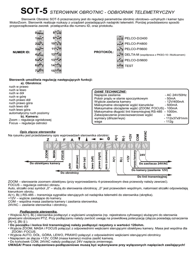 SOT-5 STEROWNIK OBROTNIC - ODBIORNIK TELEMETRYCZNY Sterownik Obrotnic SOT-5 przeznaczony jest do regulacji parametrów obrotnic obrotowo--uchylnych i kamer typu MotorZoom. Sterownik realizuje rozkazy z urządzeń posiadających nadajniki telemetrii. Poniżej przedstawiono sposób przyporządkowania zworek przełącznika dla numeru ID, oraz protokołu. PELCO-D/2400 PELCO-P/4800 PELCO-P/9600 PROTOKÓŁ: NUMER ID: DELTA-M (współpraca z PKSO-10 i Multicamem) PELCO-D/9600 TEST Do obrotnicy 24V/AC COM B(-) +12V masa kamery +12V zero (common) prawo (right) lewo (left) góra (up) dół (down) auto Do obiektywu kamery 0 A FOCUS F MASA ZOOM Z B(-) Opis złącza sterownika Na rysunku jest przedstawiony opis wyprowadzeń sterownika obrotnic: A(+) DANE TECHNICZNE: Napięcie zasilania - AC 24V/50Hz Pobór prądu w stanie spoczynkowym - 50mA Wyjście zasilania kamery - 12V/400mA Maksymalne obciążenie wyjść kierunków - 500mA Maksymalne obciążenie wyjść (ZOOM, FOCUS) - 100mA Maksymalna długość linii transmisyjnej RS-485 – 1000m. Zabezpieczenie przeciwzwarciowe wyjść - tak wymiary (dł/szer/wys) - 112x37x91mm waga - 112g A(+) Sterownik umożliwia regulację następujących funkcji: a). Obrotnica: ruch w prawo ruch w lewo ruch w dół ruch w górę ruch prawo dół ruch prawo góra ruch lewo dół ruch lewo góra automatyczny ruch poziomy b). Kamera: Zoom – regulacja ogniskowej Focus – regulacja ostrości 24V Do zasilacza 24V/AC Do kamery (zasilanie 12V) Do linii transmisyjnej ZOOM – sterowanie zoomem obiektywu (przy wyprowadzeniu 4-przewodowym dwa przewody należy zewrzeć). FOCUS – regulacja ostrości obrazu. Auto, strzałki oraz symbol „0” – służą do sterowania obrotnicą: „0” jest przewodem wspólnym, natomiast strzałki odpowiadają kierunkom obrotu. A(+), B(-) RS-485 – transmisja sygnałów sterujących od nadajnika telemetrii do sterownika (skrętka). +12V – wyjście zasilające do kamery. COM – wspólna masa zasilania kamery i zasilania sterownika. 24VAC – zasilanie sterownika i obrotnicy. Podłączenie sterownika. Wejścia A(+), B(-) sterownika podłączyć z wyjściami urządzenia (np. rejestratora cyfrowego) służącymi do sterownia głowicami obrotowymi PTZ. Przy podłączaniu należy zwrócić uwagę na prawidłową polaryzację (złącza posiadają oznaczenia [A(+)], [B(-)] ). ● Do początku i końca linii transmisyjnej należy podłączyć rezystory o wartości 120ohm. ● Wyjścia ZOOM, MASA i FOCUS połączyć z odpowiednimi wejściami sterującymi obiektywu kamery. Masa jest wspólna dla ZOOM i FOCUS. ● Wyjścia AUTO, DÓŁ, GÓRA, LEWO, PRAWO połączyć z odpowiednimi wejściami sterującymi obrotnicy ● Napięciem ze złącza +12V, COM (masa kamery) można zasilić kamerę. ● Do końcówek COM, 24VAC należy podłączyć 24V napięcia zmiennego. UWAGA! Prace rozłączeniowo-podłączeniowe muszą być wykonywane przy wyłączonych napięciach zasilających! ● Schematy konfiguracyjne koncentryk 75ohm kabel 9 pin obiektyw max 1000m 2-żyłowy kamera skrętka SOT-5 konwerter RS485/232 koncentryk 75ohm sterownik obrotnic 5-żyłowy max 1000m 2-żyłowy kamera skrętka obrotnica obiektyw SOT-5 rejestrator cyfrowy sterownik obrotnic 5-żyłowy obrotnica 3-żyłowy 3-żyłowy zasilacz 24V/AC komputer zasilacz 24V/AC Sposób podłączenia większej ilości obrotnic do jednego systemu: Wyjście RS-485 z urządzenia Terminator120ohm włączany zworką w ostatnim sterowniku (na końcu linii) terminator 120ohm maksymalnie do 16 sterowników zasilacz 24V/AC SOT-5 SOT-5 sterownik obrotnic sterownik obrotnic do obrotnicy zasilacz 24V/AC SOT-5 SOT-5 sterownik obrotnic do obrotnicy zasilacz 24V/AC do obrotnicy sterownik obrotnic zasilacz 24V/AC do obrotnicy Sposób przyporządkowania numeru ID, zmiany protokołu i włączenia rezystora 120ohm za pomocą przełączników i zworek: dioda LED informująca o napięciu zasilania (mruganie: sygnalizacja transmisji) PRZEŁĄCZNIK PROTOKÓŁÓW: NUMER ID: Zworka włączająca rezystor 120ohm do linii transmisyjnej. UWAGA! Początek linii, oraz ostatni sterownik znajdujący się na końcu linii muszą mieć podłączone rezystory 120ohm. - rezystor 120ohm włączony SOT-5 - brak rezystora PROTOKÓŁ: PELCO-D /2400 PELCO-P /4800 Listwa przyłączeniowa PELCO-P /9600 DELTA-M PELCO-D /9600 TEST Producent: P.W. “DELTA” 60-713 Poznań ul.Graniczna 10 tel: 0-61 866-71-48 www.delta.poznan.pl