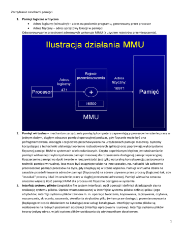 Zarządzanie zasobami pamięci 1. Pamięć logiczna a fizyczna Adres logiczny (wirtualny) – adres na poziomie programu, generowany przez procesor Adres fizyczny – adres sprzętowy lokacji w pamięci Odwzorowywanie przestrzeni adresowych wykonuje MMU (z użyciem rejestrów przemieszczenia). 2. Pamięć wirtualna – mechanizm zarządzania pamięcią komputera zapewniający procesowi wrażenie pracy w jednym dużym, ciągłym obszarze pamięci operacyjnej podczas, gdy fizycznie może być ona pofragmentowana, nieciągła i częściowo przechowywana na urządzeniach pamięci masowej. Systemy korzystające z tej techniki ułatwiają tworzenie rozbudowanych aplikacji oraz poprawiają wykorzystanie fizycznej pamięci RAM w systemach wielozadaniowych. Często popełnianym błędem jest utożsamianie pamięci wirtualnej z wykorzystaniem pamięci masowej do rozszerzenia dostępnej pamięci operacyjnej. Rozszerzenie pamięci na dyski twarde w rzeczywistości jest tylko naturalną konsekwencją zastosowania techniki pamięci wirtualnej, lecz może być osiągnięte także na inne sposoby, np. nakładki lub całkowite przenoszenie pamięci procesów na dysk, gdy znajdują się w stanie uśpienia. Pamięć wirtualna działa na zasadzie przedefiniowania adresów pamięci (fizycznych) na adresy używane przez procesy (logiczne) tak, aby "oszukać" procesy i dać im wrażenie pracy w ciągłej przestrzeni adresowej. Pamięć wirtualna oznacza znacznie większą ilość pamięci RAM dla procesu niż fizycznie dostępna w systemie. 3. Interfejs systemu plików (angielskie file system interface), ogół operacji i definicji składających się na realizację systemu plików. Oprócz wkomponowanej w interfejsie systemu plików definicji pliku i jego atrybutów, interfejs systemu plików zawiera m. in. operacje tworzenia, kopiowania, zapisywania, czytania, rozszerzania, skracania, usuwania, określania atrybutów pliku (w tym praw dostępu), przemianowywania (będącego w istocie działaniem na katalogu) oraz usługi katalogowe. Interfejsy systemu plików są realizowane na różnych poziomach abstrakcji (interfejs opracowany i surowy). Interfejs systemu plików tworzy jedyny obraz, w jaki system plików uwidacznia się użytkownikom docelowym. 1