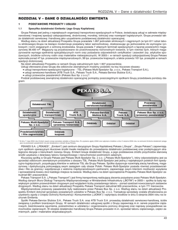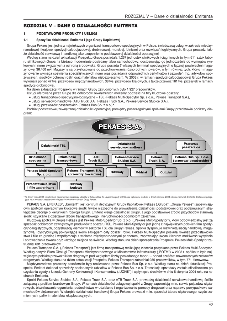 ROZDZIA£ V Dane o dzia³alnoci Emitenta ROZDZIA£ V DANE O DZIA£ALNOCI EMITENTA 1 PODSTAWOWE PRODUKTY I US£UGI 1.1 Specyfika dzia³alnoci Emitenta i jego Grupy Kapita³owej Grupa Pekaes jest jedn¹ z najwiêkszych organizacji transportowo-spedycyjnych w Polsce, wiadcz¹c¹ us³ugi w zakresie miêdzynarodowej i krajowej spedycji ca³opojazdowej, drobnicowej, morskiej, lotniczej oraz rozwi¹zañ logistycznych. Grupa prowadzi tak¿e dzia³alnoæ serwisow¹ i handlow¹ jako uzupe³nienie podstawowej dzia³alnoci operacyjnej. Wed³ug stanu na dzieñ aktualizacji Prospektu Grupa posiada³a 1.267 jednostek silnikowych i ci¹gnionych (w tym 611 sztuk taboru silnikowego).Grupa na bie¿¹co modernizuje posiadany tabor samochodowy, dostosowuj¹c go jednoczenie do wymogów rynkowych i norm zwi¹zanych z ochron¹ rodowiska. Grupa posiada 7 w³asnych terminali spedycyjnych o ³¹cznej powierzchni magazynowej 36.400 m2. Magazyny s¹ przystosowane do przechowywania ró¿norodnych towarów, w tym równie¿ tych, których magazynowanie wymaga spe³nienia specjalistycznych norm oraz posiadania odpowiednich certyfikatów i zezwoleñ (np. artyku³ów spo¿ywczych, rodków ochrony rolin oraz materia³ów niebezpiecznych). W 2003 r. w ramach spedycji ca³opojazdowej Grupa Pekaes wykona³a ponad 47 tys. przewozów miêdzynarodowych, 38 tys. przewozów krajowych, a tak¿e przewóz 161 tys. przesy³ek w ramach spedycji drobnicowej. Na dzieñ aktualizacji Prospektu w ramach Grupy zatrudnionych by³o 1.927 pracowników. Us³ugi oferowane przez Grupê dla odbiorców zewnêtrznych mo¿emy podzieliæ na trzy kluczowe obszary: l us³ugi transportowo-spedycyjno-logistyczne TSL (Pekaes Multi-Spedytor Sp. z o.o., Pekaes Transport S.A.), l us³ugi serwisowo-handlowe (ATB Truck S.A., Pekaes Truck S.A., Pekaes-Service S³ubice S.A.), l us³ugi przewozów pasa¿erskich (Pekaes Bus Sp. z o.o.)*. Podzia³ podstawowej zewnêtrznej dzia³alnoci operacyjnej pomiêdzy poszczególnymi spó³kami Grupy przedstawia poni¿szy diagram: * W dniu 7 maja 2004 roku Emitent zawar³ umowê sprzeda¿y udzia³ów w Pekaes Bus. Po uzyskaniu zgody UOKiK oraz wp³yniêciu rodków w dniu 5 sierpnia 2004 roku na rachunek Emitenta dzia³alnoæ polegaj¹ca na przewozach pasa¿erskich nie jest wiadczona w ramach Grupy Pekaes. PEKAES S.A. (PEKAES, Emitent) jest centrum decyzyjnym Grupy Kapita³owej Pekaes (Grupa, Grupa Pekaes) zapewniaj¹cym spó³kom operacyjnym kluczowe rodki trwa³e niezbêdne do prowadzenia dzia³alnoci podstawowej oraz podejmuj¹cym strategiczne decyzje o kierunkach rozwoju Grupy. Emitent kreuje dzia³alnoæ Grupy, a jego podstawowe ród³o przychodów stanowi¹ rodki uzyskane z dzier¿awy taboru transportowego i nieruchomoci podmiotom zale¿nym. Kluczow¹ spó³k¹ w Grupie Pekaes jest Pekaes Multi-Spedytor Sp. z o.o. (Pekaes Multi-Spedytor), który odpowiedzialny jest za sprzeda¿ odbiorcom zewnêtrznym produktów z obszaru TSL. Pekaes Multi-Spedytor jest jedn¹ z najwiêkszych polskich firm spedycyjno-logistycznych, pozyskuj¹c¹ klientów w sektorze TSL dla Grupy Pekaes. Spó³ka dysponuje rozwiniêt¹ sieci¹ handlow¹, magazynow¹ i dystrybucyjn¹ pokrywaj¹c¹ swym zasiêgiem ca³y obszar Polski. Pekaes Multi-Spedytor posiada równie¿ przedstawicielstwa i filie za granic¹ i wspó³pracuje z wieloma miêdzynarodowymi partnerami, zapewniaj¹c swym klientom mo¿liwoæ wysy³ania i sprowadzania towaru do/z ka¿dego miejsca na wiecie. Wed³ug stanu na dzieñ sporz¹dzenia Prospektu Pekaes Multi-Spedytor zatrudnia³ 691 pracowników. Pekaes Transport S.A. (Pekaes Transport) jest firm¹ transportow¹ realizuj¹c¹ zlecenia pozyskane przez Pekaes Multi-Spedytor. Wed³ug danych Biura Obs³ugi Transportu Miêdzynarodowego w Ministerstwie Infrastruktury (BOTM) w 2003 r. spó³ka ta by³¹ najwiêkszym polskim przewonikiem drogowym pod wzglêdem liczby posiadanego taboru ponad szeæset nowoczesnych zestawów drogowych. Wed³ug stanu na dzieñ aktualizacji Prospektu Pekaes Transport zatrudnia³ 935 pracowników, w tym 771 kierowców. Miêdzynarodowe przewozy pasa¿erskie by³y realizowane przez Pekaes Bus Sp. z o.o. Wed³ug stanu na dzieñ aktualizacji Prospektu Emitent dokona³ sprzeda¿y posiadanych udzia³ów w Pekaes Bus Sp. z o.o. Transakcja sprzeda¿y zosta³a sfinalizowana po uzyskaniu zgody z Urzêdu Ochrony Konkurencji i Konsumentów (UOKiK) i wp³yniêciu rodków w dniu 5 sierpnia 2004 roku na rachunek Emitenta. Spó³ki Pekaes-Service S³ubice S.A., Pekaes Truck S.A. oraz ATB Truck S.A. prowadz¹ dzia³alnoæ serwisowo-handlow¹, cile zwi¹zan¹ z profilem bran¿owym Grupy. W ramach dzia³alnoci us³ugowej spó³ki z Grupy zapewniaj¹ m.in. serwis pojazdów ciê¿arowych, bie¿nikowanie ogumienia, porednictwo w udzielaniu i organizowaniu pomocy drogowej oraz naprawy powypadkowe samochodów ciê¿arowych. W obrêbie dzia³alnoci handlowej Grupa Pekaes prowadzi m.in. sprzeda¿ taboru ciê¿arowego, czêci zamiennych, paliw i materia³ów eksploatacyjnych. 43 ROZDZIA£ V Dane o dzia³alnoci Emitenta Poni¿sza mapa przedstawia lokalizacjê podmiotów Grupy Pekaes oraz ich oddzia³ów i placówek w Polsce w podziale na prowadzon¹ dzia³alnoæ: Kierunek przep³ywu us³ug w ramach Grupy przedstawia poni¿szy schemat. SCHEMAT Na przychody Grupy sk³adaj¹ siê w dominuj¹cym stopniu te ze sprzeda¿y w³asnych produktów oferowanych odbiorcom zewnêtrznym (ich udzia³ w przychodach ogó³em systematycznie ronie) oraz przychody z dzia³alnoci handlowej towarami i materia³ami. Przychody ze sprzeda¿y produktów, towarów i materia³ów Grupy w latach 2001-I po³. 2004 (w tys. z³) Pozycja I po³. 2004 % 2003 % 2002 % 2001 % Produkty i us³ugi Towary i materia³y Razem 246.399 28.886 275.285 89,5% 10,5% 100,0% 456.993 53.081 510.074 89,6% 10,4% 100,0% 430.186 62.943 493.129 87,2% 12,8% 100,0% 473.473 166.441 639.914 74,0% 26,0% 100,0% ród³o: PEKAES S.A. Najwa¿niejszymi us³ugami Grupy, których sprzeda¿ w pierwszym pó³roczu 2