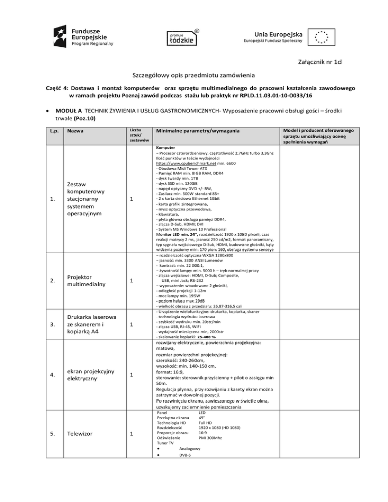Załącznik nr 1d Szczegółowy opis przedmiotu zamówienia Część 4: Dostawa i montaż komputerów oraz sprzętu multimedialnego do pracowni kształcenia zawodowego w ramach projektu Poznaj zawód podczas stażu lub praktyk nr RPLD.11.03.01-10-0033/16 MODUŁ A TECHNIK ŻYWIENIA I USŁUG GASTRONOMICZNYCH- Wyposażenie pracowni obsługi gości – środki trwałe (Poz.10) L.p. Nazwa Liczba sztuk/ zestawów 1. Zestaw komputerowy stacjonarny systemem operacyjnym 1 2. Projektor multimedialny 1 3. Drukarka laserowa ze skanerem i kopiarką A4 1 4. 5. ekran projekcyjny elektryczny Telewizor Minimalne parametry/wymagania Komputer − Procesor czterordzeniowy, częstotliwość 2,7GHz turbo 3,3Ghz Ilość punktów w teście wydajności https://www.cpubenchmark.net min. 6600 - Obudowa Midi Tower ATX - Pamięć RAM min. 8 GB RAM, DDR4 - dysk twardy min. 1TB - dysk SSD min. 120GB - napęd optyczny DVD +/- RW, - Zasilacz min. 500W standard 85+ - 2 x karta sieciowa Ethernet 1Gbit - karta grafiki zintegrowana, - mysz optyczna przewodowa, - klawiatura, - płyta główna obsługa pamięci DDR4, - złącza D-Sub, HDMI; DVI - System MS Windows 10 Professional Monitor LED min. 24”, rozdzielczość 1920 x 1080 pikseli, czas reakcji matrycy 2 ms, jasność 250 cd/m2, format panoramiczny, typ sygnału wejściowego D-Sub, HDMI, budowane głośniki, kąty widzenia poziomy min: 170 pion: 160, obsługa systemu senseye − rozdzielczość optyczna WXGA 1280x800 − jasność: min. 3300 ANSI Lumenów - kontrast: min. 22 000:1, − żywotność lampy: min. 5000 h – tryb normalnej pracy - złącza wejściowe: HDMI, D-Sub; Composite, USB, mini Jack; RS-232 − wyposażenie: wbudowane 2 głośniki, - odległość projekcji 1-12m - moc lampy min. 195W - poziom hałasu max 29dB - wielkość obrazu z przedziału: 26,87-316,5 cali - Urządzenie wielofunkcyjne: drukarka, kopiarka, skaner - technologia wydruku laserowa - szybkość wydruku min. 20str/min - złącza USB, RJ-45, WiFi - wydajność miesięczna min, 2000str - skalowanie kopiarki: 25-400 % 1 rozwijany elektrycznie, powierzchnia projekcyjna: matowa, rozmiar powierzchni projekcyjnej: szerokość: 240-260cm, wysokość: min. 140-150 cm, format: 16:9, sterowanie: sterownik przyścienny + pilot o zasięgu min 50m. Regulacja płynna, przy rozwijaniu z kasety ekran można zatrzymać w dowolnej pozycji. Po rozwinięciu ekranu, zawieszonego w świetle okna, uzyskujemy zaciemnienie pomieszczenia 1 Panel LED Przekątna ekranu 49'' Technologia HD Full HD Rozdzielczość 1920 x 1080 (HD 1080) Proporcje obrazu 16:9 Odświeżanie PMI 300Mhz Tuner TV Analogowy DVB-S Model i producent oferowanego sprzętu umożliwiający ocenę spełnienia wymagań DVB-S2 DVB-T MPEG-2 DVB-T MPEG-4 (H.264) DVB-C Moc głośników sumaryczna 10 W Gniazda we/wy 1 x HDMI 1 x Component (Y, Pb, Pr) 1 x USB 2.0 1 x Gniazdo CI/Cl+ Standard VESA 300 x 300 Pobór mocy 39 W Wysokość 600-700mm Wysokość z podstawą 600-700 mm Szerokość 1000-1200 mm Głębokość 80-85 mm Waga 10-11kg MODUŁ B TECHNIK ŻYWIENIA I USŁUG GASTRONOMICZNYCH- Wyposażenie pracowni planowania żywienia i produkcji gastronomicznej - środki trwałe (poz.12) L.p. Nazwa Liczba sztuk/ zestawów 1. Zestaw komputerowy stacjonarny systemem operacyjnym 1 2. Projektor multimedialny 1 3. Drukarka laserowa ze skanerem i kopiarką A4 1 4. Komputer przenośny 15 Minimalne parametry/wymagania Komputer − Procesor czterordzeniowy, częstotliwość 2,7GHz turbo 3,3Ghz Ilość punktów w teście wydajności https://www.cpubenchmark.net min. 6600 - Obudowa Midi Tower ATX - Pamięć RAM min. 8 GB RAM, DDR4 - dysk twardy min. 1TB - dysk SSD min. 120GB - napęd optyczny DVD +/- RW, - Zasilacz min. 500W standard 85+ - 2 x karta sieciowa Ethernet 1Gbit - karta grafiki zintegrowana, - mysz optyczna przewodowa, - klawiatura, - płyta główna obsługa pamięci DDR4, - złącza D-Sub, HDMI; DVI - System MS Windows 10 Professional Monitor LED min. 24”, rozdzielczość 1920 x 1080 pikseli, czas reakcji matrycy 2 ms, jasność 250 cd/m2, format panoramiczny, typ sygnału wejściowego D-Sub, HDMI, budowane głośniki, kąty widzenia poziomy min: 170 pion: 160, obsługa systemu senseye − rozdzielczość optyczna WXGA 1280x800 − jasność: min. 3300 ANSI Lumenów - kontrast: min. 22 000:1, − żywotność lampy: min. 5000 h – tryb normalnej pracy - złącza wejściowe: HDMI, D-Sub; Composite, USB, mini Jack; RS-232 − wyposażenie: wbudowane 2 głośniki, - odległość projekcji 1-12m - moc lampy min. 195W - poziom hałasu max 29dB - wielkość obrazu z przedziału: 26,87-316,5 cali - Urządzenie wielofunkcyjne: drukarka, kopiarka, skaner - technologia wydruku laserowa - szybkość wydruku min. 20str/min - złącza USB, RJ-45, WiFi - wydajność miesięczna min, 2000str - skalowanie kopiarki: 25-400 % Procesor dwurdzeniowy- czerowątkowy, częstotliwość min. 2,2GHz Ilość punktów w teście wydajności https://www.cpubenchmark.net min. 3480 Pamięć RAM min. 4GB RAM, Wyświetlacz 15,6” – rodzaj wyświetlacza mat Rozdzielczość ekranu min.: 1366x768 Dysk twardy min. 240GB SSD Napęd optyczny DVD +/- RW, Karta sieciowa Ethernet, Karta WiFi IEEE 802.11a/b/g/n/ac Karta grafiki zintegrowana, Model i producent oferowanego sprzętu umożliwiający ocenę spełnienia wymagań • • Bateria min. 4 komorowa; pojemność baterii min. 40Wh Czytnik linii papilarnych Złącza VGA, HDMI 2x USB 3.0 2x USB 2.0 Waga max 2.08kg System Windows Professional 7; 8.1 lub 10 MODUŁ C TECHNIK ŻYWIENIA I USŁUG GASTRONOMICZNYCH Wyposażenie pracowni planowania żywienia i produkcji gastronomicznej (pozostałe wyposażenie) (poz.13) L.p. 1. Nazwa Oprogramowanie biurowe i system antywirusowy Liczba sztuk/ licencji 16 Minimalne parametry/wymagania Model i producent oferowanego sprzętu umożliwiający ocenę spełnienia wymagań Pakiet biurowy Microsoft Office Professional Plus 2016 wersja edukacyjna, Pakiet antywirusowy Antywirus i antyspyware - Wbudowana ochro