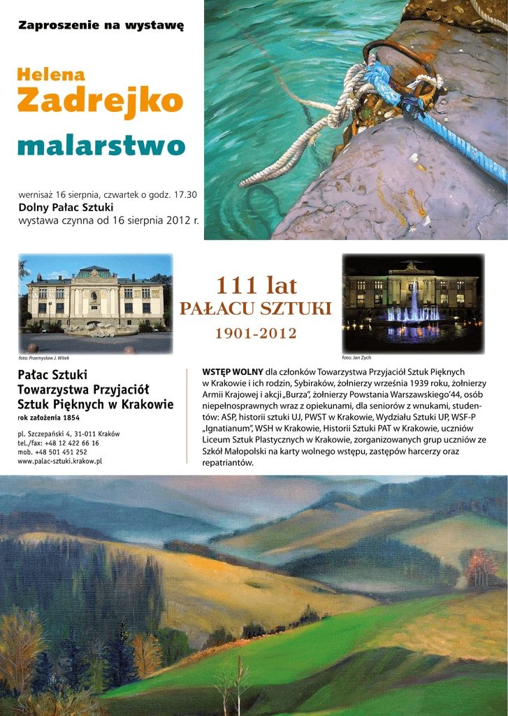 Zaproszenie na wystawę Helena Zadrejko malarstwo wernisaż 16 sierpnia, czwartek o godz. 17.30 Dolny Pałac Sztuki wystawa czynna od 16 sierpnia 2012 r. 111 lat PAŁACU SZTUKI 1901-2012 foto: Przemysław J. Witek foto: Jan Zych WSTĘP WOLNY dla członków Towarzystwa Przyjaciół Sztuk Pięknych w Krakowie i ich rodzin, Sybiraków, żołnierzy września 1939 roku, żołnierzy Armii Krajowej i akcji „Burza”, żołnierzy Powstania Warszawskiego’44, osób niepełnosprawnych wraz z opiekunami, dla seniorów z wnukami, studentów: ASP, historii sztuki UJ, PWST w Krakowie, Wydziału Sztuki UP, WSF-P „Ignatianum”, WSH w Krakowie, Historii Sztuki PAT w Krakowie, uczniów Liceum Sztuk Plastycznych w Krakowie, zorganizowanych grup uczniów ze Szkół Małopolski na karty wolnego wstępu, zastępów harcerzy oraz repatriantów. Zbigniew Kazimierz Witek Prezes Towarzystwa Przyjaciół Sztuk Pięknych w Krakowie Ewa Sadowska i Iwona Siwek-Front Public Relations mają zaszczyt zaprosić na wystawę wernisaż 16 sierpnia 2012 czwartek o godz. 17.30 godziny otwarcia: pon-pt.: 8.15 – 18.00 sob-nd.: 10.00 – 18.00 patronat medialny Wrzesień Heleny Zadrejko malarstwo Urodziła się na Kresach Polski w Dalidowiczach, położonych w byłym województwie nowogródzkim. Jest absolwentką Akademii Sztuk Pięknych w Krakowie, dyplom z Wydziału Malarstwa obroniła w Pracowni Prof. Jerzego Nowosielskiego w 1970 r. Trzykrotna stypendystka Ministerstwa Kultury i Sztuki. Od 29 lat mieszka w Atenach nieustannie pracując artystycznie i społecznie. Zrealizowała 52 wystawy indywidualne w Polsce: od Białegostoku poprzez Warszawę aż po Zieloną Górę i od Szczecina poprzez Kraków aż do Przemyśla oraz w Niemczech, Słowacji, Bułgarii i Grecji (16 wystaw w Atenach i wielu innych miastach na lądzie i na wyspach). Wzięła udział w około 300 wystawach zbiorowych Ogólnopolskich, Pokonkursowych oraz Międzynarodowych w większości krajów Europy i w Azji. Uczestniczyła w ponad 100 Plenerach Malarskich, z których 29 sama zorganizowała przy pomocy sponsorów: 4 w Polsce, 4 we Włoszech i 21 w różnych uroczych miejscowościach Grecji pt. „IMPRESJE GRECKIE”. W 2005 roku stworzyła Międzynarodową Artystyczną Grupę „ARTHOME”, dla której azylem była wyspa Paros w ciągu 6 lat. Za pracę twórczą i działalność kulturalną została nagrodzona i wyróżniona 18 razy. Między innymi otrzymała: 1973 – „Złote Grono”, Nagroda Publiczności na Wystawie Laureatów Ogólnopolskich Konkursów w Zielonej Górze. 1973 – „Srebrny Medal”, 2. Nagroda w Ogólnopolskim Konkursie Malarskim im. J. Spychalskiego w Poznaniu. 1974 – „Brązowy Medal”, 3. Nagroda w Ogólnopolskim Konkursie Malarskim pt. „Bielska Jesień” w Bielsko-Białej. 1976 – „Srebrny Medal” , 2. Nagroda w Ogólnopolskim Konkursie Malarskim pt. „Bielska Jesień” w Bielsko-Białej. 1977 – „Srebrny Krzyż Zasługi”, Odznaczenie Państwowe. 1978 – Dwie Nagrody Fundowane za portrety, Muzeum Portretu Współczesnego, Radom. 1984 – „Medal Galerii BWA” w Radomiu. 1992 – „Złota Plakietka” Związku Dziennikarzy Greckich w Atenach. 2002 – „Złoty Krzyż Zasługi”, Odznaczenie Prezydenta Rzeczypospolitej Polskiej. W 2009 roku otrzymała od Ministerstwa Kultury Grecji Honorową Emeryturę Zasłużonego Artysty Grecji. Ostatnie wystawy indywidualne: 2009, kwiecień – „Urok codzienności” – Galeria ZPAP ”Pod Plafonem”, Wrocław. 2009, maj – „Helena Zadrejko – Malarstwo”, BWA, Olkusz. 2009, wrzesień – „Poemat o Każdej Rzeczy”, BWA, Olsztyn. 2011, lipiec-wrzesień – „Helena Zadrejko – Artystka i Muza”, Muzeum Archeologiczno–Historyczne, Głogów. 2011, listopad-grudzień – „Helena Zadrejko – Artystka i Muza”, Galeria Pro Arte, Zielona Góra. 2012, maj-lipiec – „Helena Zadrejko – Artystka i Muza” – Muzeum Ziemi Lubuskiej, Gorzów Wielkopolski. Prace Heleny Zadrejko znajdują się w zbiorach: Muzeum Ziemi Lubuskiej w Zielonej Górze i Gorzowie, Muzeum Kolorowych w Legnicy, Muzeum Archeologiczno–Historyczne w Głogowie, Muzeum Współczesnego Portretu i Autoportretu w Radomiu, Okręgowego Muzeum w Białymstoku, Okręgowego Muzeum w Słupsku, Okręgowego Muzeum w Siedlcach, Muzeum Sportu w Łodzi a także w zbiorach „CBWA” w Warszawie i Galeriach „BWA” w Olsztynie, Białymstoku, Słupsku, Lesznie, Zielonej Górze, Legnicy, Wrocławiu, Krakowie, Tarnowie, Szczecinie, Siedlcach, Białej Podlaskiej, Częstochowie, Katowicach, Piotrkowie Trybunalskim, Jeleniej Górze; w instytucjach państwowych i społecznych oraz w kolekcjach prywatnych w Polsce, Grecji, Słowacji, Montenegro, Niemczech (w International Club VIP & Frankfurter Bank), Austrii, Belgii, Brazylii, Holandii, Hiszpanii, Francji, Szwecji, Bułgarii, Rosji, Turcji, Jugosławii, Włoszech, Kanadzie, Wielkiej Brytanii i USA.