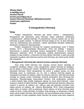 Wiesław Babik [email protected] Karolina Piaśnik [email protected] Instytut Informacji Naukowej i Bibliotekoznawstwa Uniwersytet Jagielloński Kraków O wiarygodności informacji Wstęp Problem wiarygodności informacji jest bardzo złożony i wieloaspektowy. Wiarygodność jest specyficzną cechą informacji, często niesłusznie utożsamianą z prawdziwością1 i jakością informacji. W powszechnym odczuciu sprawia ona, że dane informacje są godne zaufania. Ta własność informacji polega na tym, że dana informacja może być zweryfikowana jako prawdziwa i spełnia odpowiednie standardy dokładności, aktualności, kompletności i bezpieczeństwa. Problem wiarygodności informacji był niedawno prezentowany przez P. Hrabiec [Hrabiec, 2011], J. Boruszewskiego [Boruszewski, 2012] oraz Elżbietę i Grzegorza Kiedrowiczów w aspekcie ilościowego pomiaru wiarygodności informacji w Internecie [Kiedrowicz, Kiedrowicz, 2012]. W opracowaniu zostanie zaprezentowane odmienne podejście do tego problemu, a mianowicie (od strony jakości informacji), a celem jest próba odpowiedzi na pytanie, jakie własności powinna mieć informacja, aby można ją było określić jako wiarygodną. 1. Wiarygodność informacji jako element procesu ewaluacji informacji Duża liczba źródeł informacji oraz znaczący przyrost danych sprawiają, że umiejętność weryfikacji, selekcji i oceny wiarygodności i jakości informacji są niezbędne, aby nie zginąć w informacyjnym chaosie. Określanie jej jakości i wiarygodności to problem akredytacji informacji. Ocena wiarygodności ma pomóc w podjęciu decyzji, czy daną informację uznać za wartościową, czy nie. Gdy w odbiorze informacji pojawia się niespójność komunikatu od nadawcy, wtedy nie wierzymy informacji. Jeśli treść komunikatu przystaje do naszego modelu mentalnego, wówczas akceptujemy daną informację jako wiarygodną. Niewystarczające dopracowanie formalne, brak przejrzystości przekazu, a nawet trywialne błędy potrafią negatywnie wpłynąć na ocenę danej informacji i wręcz zniweczyć zaufanie do takiej informacji. Wiarygodność informacji jest atrybutem relatywnym zarówno w stosunku do nadawcy, jak i odbiorcy, gdyż jest pochodną czynników, które zależą zarówno od nadawcy, jak i odbiorcy [Boruszewski, 2012]. Ocena wiarygodności zależy także od medium, które ją przekazuje. Opinia odbiorcy na temat informacji zależy zwykle od opinii o źródle informacji. Są badania, które pokazują, że współczesny człowiek wyżej ocenia wartość informacji, która pochodzi, czyli jest przekazana przez komputer, niż przez człowieka. W wielu wypadkach młodzi internauci tak wysoko cenią treści znalezione 1 w Internecie i uważają je za tak wyczerpujące, że rezygnują z pozyskiwania i akredytacji informacji w tradycyjnych źródłach informacji [Stankiewicz, 2004]. Gdy chodzi o ocenę wiarygodności informacji, to umiejętność ta jest traktowana jako podstawowa, szczególnie w przypadku osób prowadzących prace naukowe. W ocenie wiarygodności pomaga stopień natężenia innych atrybutów informacji. Akceptując takie założenie ludzie bardziej ufają informacji kompletnej niż niekompletnej, przejrzystej niż nieprzejrzystej, weryfikowalnej niż nie. Uważa się również, że informacja fragmentaryczna nie jest wiarygodna, stąd powinno się dążyć do kompletności i całościowego prezentowania informacji. H. Miller zauważa, że wiarygodność informacji nie jest czynnikiem warunkującym jakość informacji, lecz jej rezultatem. Jakość informacji może być nisko oceniona nawet w sytuacji, gdy dana informacja jest wysoce wiarygodna, a pozostałe atrybuty informacji mają nikły stopień [Miller, 1996]. Podczas, gdy dla jakości informacji kluczowy jest atrybut relewancji, to jej wiarygodność jest tylko efektem jakości informacji, ale jej nie powoduje. Poza tym wiarygodność informacji ma być atrybutem pochodnym względem jej dokładności, aktualności i kompletności, a te atrybuty są zrelatywizowane do odbiorcy informacji [Boruszewski, 2012, s. 245]. Tymczasem wiarygodność jest atrybutem informacji zrelatywizowanym także do jej źródła – nadawcy informacji. Warto też zauważyć, że wiarygodność nadawcy nie jest pojęciem absolutnym, lecz zrelatywizowanym do określonej dziedziny. Poza tym wiarygodność informacji ocenia się na podstawie wiadomości o nadawcy i sytuacji, w jakiej on działał (jego intencji, wiedzy, kompetencji, umiejętności, wykorzystanych środków technicznych, sytuacji, w której działał). Ocena wiarygodności zależy przede wszystkim od krytycyzmu i kompetencji odbiorcy informacji. W procesie oceny wiarygodności informacji często przytacza się opinię, że jeśli nie ma możliwości sprawdzenia prawdziwości informacji w świecie realnym, wówczas nie można mieć pewności, co do jej wiarygodności [Delida, 2011]. Tymczasem treści w Internecie są ciągle płynne i rozproszone, co znacznie utrudnia ich wartościowanie. Ocena wiarygodności źródła (w tym informatora) jest niezbędna w sytuacji, gdy z jakichś powodów nie mamy możliwości oceny wiarygodności samej informacji. Ocena wiarygodności ma charakter subiektywny. Sama cecha „bycia wiarygodną informacją” jest stopniowalna. Stąd błędna ocena wiarygodności informacji może być spowodowana zarówno przez odbiorcę informacji, jak i przez czynniki niezależne od niego. Powodem przekłamań może być na przykład wpływ takich emocji, jak z góry przyjęta niechęć do pewnych źródeł informacji, lub – przeciwnie – nadmierna i niepodważalna sympatia do określonych źródeł, wynikająca z faktu otrzymania dobrej, pożądanej informacji z danego źródła w przeszłości. Dowiedziono w badaniach, że internauci mają skłonność do przejawiania o wiele wyższego stopnia zaufania do informacji pochodzących z Internetu niż do pozostałych, tradycyjnych źródeł informacji [D