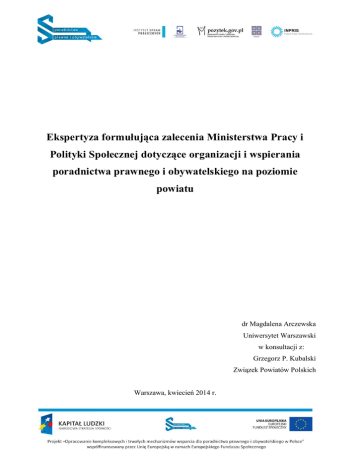 Ekspertyza formułująca zalecenia Ministerstwa Pracy i Polityki Społecznej dotyczące organizacji i wspierania poradnictwa prawnego i obywatelskiego na poziomie powiatu dr Magdalena Arczewska Uniwersytet Warszawski w konsultacji z: Grzegorz P. Kubalski Związek Powiatów Polskich Warszawa, kwiecień 2014 r. 1. Wprowadzenie System prawa w Polsce jest skomplikowany, na co wpływa duża liczba obowiązujących aktów prawnych, ich zawiła treść oraz brak przejrzystości w odniesieniu do stosowania przepisów. Jeśli zatem obywatele nie rozumieją prawa i nie potrafią z niego korzystać w zakresie rozwiązywania swoich problemów, nie mogą czuć się bezpiecznie. Bardzo ważnym narzędziem wychodzącym naprzeciw tym potrzebom jest nieodpłatne poradnictwo prawne i obywatelskie. Poradnictwo to jest rodzajem usług społecznych, polegających na udzielaniu bezpłatnych informacji lub porad, mających na celu rozwiązanie konkretnego problemu prawnego danego podmiotu (przede wszystkim osób fizycznych, ale też grup nieformalnych czy organizacji pozarządowych). Porady w tym zakresie udzielane są systematycznie, przez prawników i/lub osoby do tego przygotowane1. Poradnictwo obejmuje takie usługi jak: informacja prawna, porada prawna, porada obywatelska. Wypada zaznaczyć, że informacja prawna może być definiowana jako opracowanie i dostarczenie informacji o treści obowiązującego prawa, o prawach i obowiązkach wynikających z obowiązujących regulacji prawnych, o instytucjach właściwych do załatwienia sprawy oraz trybie postępowania. Z kolei porada prawna rozumiana jest jako przekazanie dostosowanych do konkretnej sytuacji informacji, odnoszących się do danego problemu prawnego, a w razie potrzeby pomoc w jego rozwiązaniu, na przykład poprzez pomoc w sporządzaniu projektu pisma procesowego lub innego pisma do sądu, organu administracji publicznej lub innego podmiotu bez udzielania pełnomocnictwa dotyczącego danej sprawy. Porada obywatelska to z kolei opracowanie i dostarczanie informacji na temat możliwych sposobów rozwiązania problemu, wspieranie w dokonaniu wyboru sposobu postępowania oraz w razie potrzeby sporządzenie planu działania i pomoc w jego realizacji. Wreszcie, poradnictwo obejmuje też niekiedy usługi dodatkowe, takie jak mediacja, edukacja i rzecznictwo. Celem poradnictwa jest wzmocnienie podmiotowości odbiorców usług, którzy doświadczają problemów życiowych i prawnych, poprzez dostęp do informacji i pomoc w odpowiednim jej wykorzystaniu w celu pomyślnego załatwienia spraw2. 1 A. Peisert, T. Schimanek, M. Waszak, A. Winiarska (red.), Poradnictwo prawne i obywatelskie w Polsce – stan obecny i wizje przyszłości, Instytut Spraw Publicznych, Warszawa 2013, s. 15. 2 System nieodpłatnego poradnictwa prawnego i obywatelskiego w Polsce. Propozycje rozwiązań modelowych i założeń polityki państwa, Ministerstwo Pracy i Polityki Społecznej, Warszawa 2013, s. 9. Usługi w zakresie poradnictwa świadczą w Polsce zarówno podmioty publiczne organizacje pozarządowe oraz korporacje prawnicze i indywidualni prawnicy. Te pierwsze, rozpoczęły swoją działalność w latach 90-tych XX wieku, po transformacji ustrojowej państwa związanej z decentralizacją administracji publicznej, zaspokajając przede wszystkim potrzeby osób wykluczonych lub zagrożonych wykluczeniem na skutek przemian społeczno-gospodarczych. Do podmiotów tych zaliczyć trzeba przede wszystkim ośrodki pomocy społecznej na poziomie gminy i powiatowe centra pomocy rodzinie na poziomie powiatu. Podmiotami poradniczymi o charakterze publicznym są także biura poselskie i senatorskie, Państwowa Inspekcja Pracy czy Rzecznicy konsumentów. Istotne jest jednak, że tylko dla co piątej z takich instytucji poradnictwo jest głównym obszarem aktywności. Natomiast niepubliczne organizacje poradnicze zaczęły powstawać w Polsce kilkanaście lat temu i tylko dla około 1/3 z nich udzielanie porad jest głównym obszarem działalności. Ponadto działalność poradnicza prowadzona przez organizacje pozarządowe jest zwykle zawężona do określonej tematyki. W Polsce działają dwie główne sieci poradnictwa niepublicznego – uniwersyteckie poradnie prawne zrzeszone przez Fundację Uniwersyteckich Poradni Prawnych oraz placówki Związku Biur Porad Obywatelskich. Jak wynika z badań ISP, osoby, które skorzystały z poradnictwa w zdecydowanej większości wysoko oceniają otrzymaną pomoc, wskazując na takie jej zalety jak bezpłatność oraz kompetencje i zaangażowanie osób udzielających porad. Do mocnych stron poradnictwa można zaliczyć także dobrą rozpoznawalność usługodawców w środowisku lokalnym oraz skuteczność i użyteczność poradnictwa. Korzyści płynące z dostępności usług poradniczych można określić, jako indywidualne (poczucie bezpieczeństwa osoby korzystającej, gwarancja otrzymania usługi niezależnie od statusu materialnego, podnoszenie świadomości, poznawanie swoich praw oraz mechanizmów funkcjonowania społeczeństwa, radzenie sobie z sytuacjami trudnymi) oraz społeczne (wyrównywanie nierówności, zmniejszanie poziomu niezadowolenia społecznego, mniejsza ilość konfliktów społecznych, budowanie świadomości obywatelskiej). Ponadto, poradnictwo służy nie tylko rozwiązywaniu indywidualnych problemów beneficjentów, ale może też spełniać funkcję prewencyjną i edukacyjną3. Choć system poradnictwa tworzy dość gęstą sieć, budowaną przez wiele podmiotów to wciąż wyzwaniem jest stworzenie warunków sprzyjających dalszemu rozwojowi bezpłatnego poradnictwa prawnego i obywatelskiego. Trzeba przy tym pamiętać, że poradnictwo prawne 3 A. Peisert, T. Schimanek, M. Waszak, A. Winiarska (red.), Poradnictwo prawne…, op. cit., s. 17. i obywatelskie pełni ważne funkcje z punktu widzenia zarówno obywatela, jak i samorządu terytorialnego. Ułatwia ono poruszanie się w systemie skomplikowanych przepisów pra