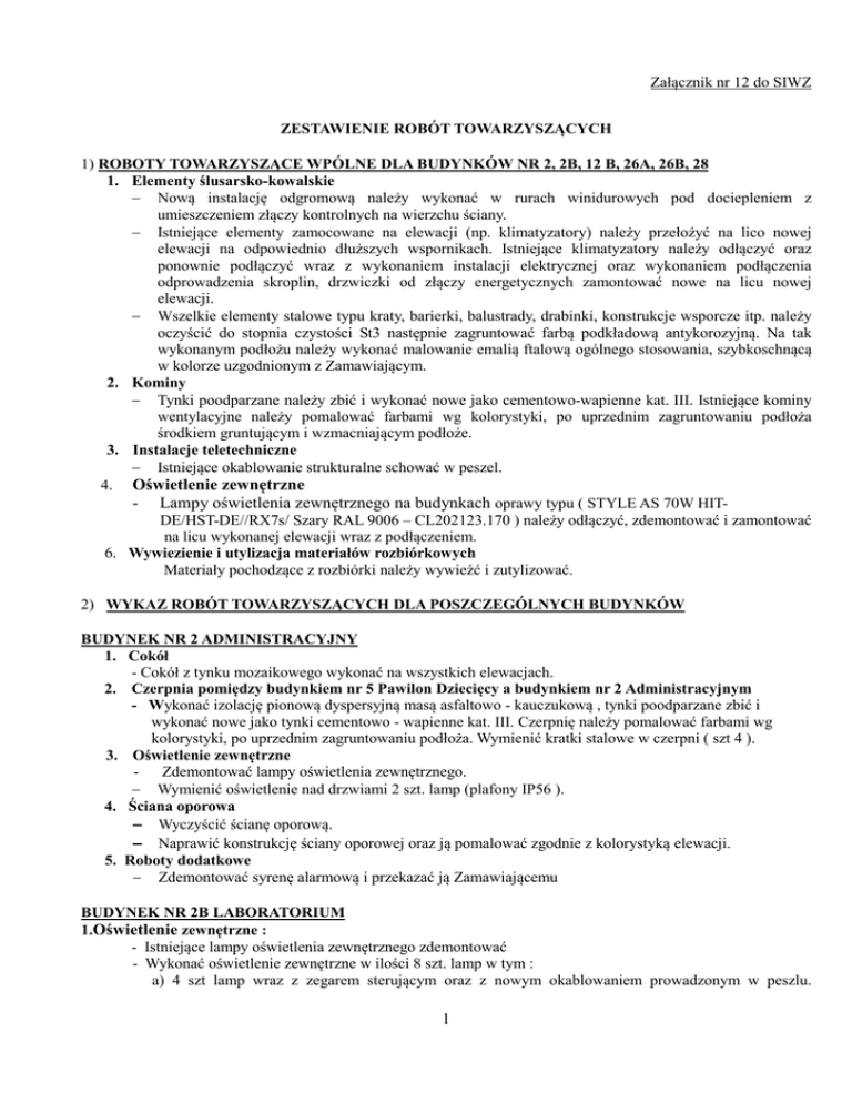 Załącznik nr 12 do SIWZ ZESTAWIENIE ROBÓT TOWARZYSZĄCYCH 1) ROBOTY TOWARZYSZĄCE WPÓLNE DLA BUDYNKÓW NR 2, 2B, 12 B, 26A, 26B, 28 1. Elementy ślusarsko-kowalskie − Nową instalację odgromową należy wykonać w rurach winidurowych pod dociepleniem z umieszczeniem złączy kontrolnych na wierzchu ściany. − Istniejące elementy zamocowane na elewacji (np. klimatyzatory) należy przełożyć na lico nowej elewacji na odpowiednio dłuższych wspornikach. Istniejące klimatyzatory należy odłączyć oraz ponownie podłączyć wraz z wykonaniem instalacji elektrycznej oraz wykonaniem podłączenia odprowadzenia skroplin, drzwiczki od złączy energetycznych zamontować nowe na licu nowej elewacji. − Wszelkie elementy stalowe typu kraty, barierki, balustrady, drabinki, konstrukcje wsporcze itp. należy oczyścić do stopnia czystości St3 następnie zagruntować farbą podkładową antykorozyjną. Na tak wykonanym podłożu należy wykonać malowanie emalią ftalową ogólnego stosowania, szybkoschnącą w kolorze uzgodnionym z Zamawiającym. 2. Kominy − Tynki poodparzane należy zbić i wykonać nowe jako cementowo-wapienne kat. III. Istniejące kominy wentylacyjne należy pomalować farbami wg kolorystyki, po uprzednim zagruntowaniu podłoża środkiem gruntującym i wzmacniającym podłoże. 3. Instalacje teletechniczne − Istniejące okablowanie strukturalne schować w peszel. 4. Oświetlenie zewnętrzne - Lampy oświetlenia zewnętrznego na budynkach oprawy typu ( STYLE AS 70W HITDE/HST-DE//RX7s/ Szary RAL 9006 – CL202123.170 ) należy odłączyć, zdemontować i zamontować na licu wykonanej elewacji wraz z podłączeniem. 6. Wywiezienie i utylizacja materiałów rozbiórkowych Materiały pochodzące z rozbiórki należy wywieźć i zutylizować. 2) WYKAZ ROBÓT TOWARZYSZĄCYCH DLA POSZCZEGÓLNYCH BUDYNKÓW BUDYNEK NR 2 ADMINISTRACYJNY 1. Cokół - Cokół z tynku mozaikowego wykonać na wszystkich elewacjach. 2. Czerpnia pomiędzy budynkiem nr 5 Pawilon Dziecięcy a budynkiem nr 2 Administracyjnym - Wykonać izolację pionową dyspersyjną masą asfaltowo - kauczukową , tynki poodparzane zbić i wykonać nowe jako tynki cementowo - wapienne kat. III. Czerpnię należy pomalować farbami wg kolorystyki, po uprzednim zagruntowaniu podłoża. Wymienić kratki stalowe w czerpni ( szt 4 ). 3. Oświetlenie zewnętrzne - Zdemontować lampy oświetlenia zewnętrznego. − Wymienić oświetlenie nad drzwiami 2 szt. lamp (plafony IP56 ). 4. Ściana oporowa − Wyczyścić ścianę oporową. − Naprawić konstrukcję ściany oporowej oraz ją pomalować zgodnie z kolorystyką elewacji. 5. Roboty dodatkowe − Zdemontować syrenę alarmową i przekazać ją Zamawiającemu BUDYNEK NR 2B LABORATORIUM 1.Oświetlenie zewnętrzne : - Istniejące lampy oświetlenia zewnętrznego zdemontować - Wykonać oświetlenie zewnętrzne w ilości 8 szt. lamp w tym : a) 4 szt lamp wraz z zegarem sterującym oraz z nowym okablowaniem prowadzonym w peszlu. 1 Zamawiający oświadcza, ze na nowo wykonanych budynkach B1 i WZO posiada oprawy typ STYLE AS 70W HIT-DE/HST-DE//RX7s/ Szary RAL 9006 – CL202123.170. b) Wymienić oświetlenie nad schodami 2 szt lamp halogenowych z czujką ruchu (2 szt). c) Wymienić oświetlenie nad drzwiami 1 szt lampa halogenowa, 1 szt. lamp (plafony IP56 ). 2. Roboty dodatkowe − Wykonać nową obudowę przyłącza gazowego wraz z wymianą drzwiczek. − Wymienić wszystkie drzwi wejściowe na aluminiowe profil ciepły o U=2,0 W/m2*K − Wymienić pokrycie daszku nad wejściem z zachowaniem detali i rodzaju materiału. − Wykonać wymianą pokrycia dachu dachówką ceramiczną karpiówką wraz z częściową naprawą konstrukcji dachowej oraz ociepleniem z płyt z wełny mineralnej o łącznej grubości 18 cm wraz z wykonaniem wiatroizolacji i paroizolacji. − Wykonać schody zewnętrzne wraz z murkami, wymienić okładziny stopni na płyty z kamienia płukanego. − Wykonać naprawę izolacji przeciwwilgociowej tarasów wraz z wykonaniem nowego podłoża i nowej okładziny oraz odprowadzeniem wody opadowej z tarasów. − Wymurowanie kominów z cegły pełnej klinkierowej ponad dach. BUDYNEK NR 12 WEWNĘTRZNY „B” 1. Oświetlenie zewnętrzne − Lampy oświetlenia zewnętrznego zdemontować. − Lampę na drzwiami wejściowymi do budynku odrestaurować. − Wykonać oświetlenie zewnętrzne 2 szt lamp wraz z zegarem sterującym oraz z nowym okablowaniem prowadzonym w peszlu. Zamawiający oświadcza, że na nowo wykonanych budynkach B1 i WZO posiada oprawy typ STYLE AS 70W HIT-DE/HST-DE//RX7s/ Szary RAL 9006 – CL202123.170. − Wykonać oświetlenie nad drzwiami w klatce ewakuacyjnej 3 szt lamp wraz z zegarem sterującym oraz z nowym okablowaniem prowadzonym w peszlu. 2. Roboty dodatkowe - Wykonać wymianą pokrycia dachu dachówką ceramiczną karpiówką wraz z częściową naprawą konstrukcji dachowej oraz ociepleniem z płyt z wełny mineralnej o łącznej grubości 18 cm wraz z wykonaniem wiatroizolacji i paroizolacji − Wymienić na nowe moskitiery okienne. − Wymienić wentylatory dachowe.. − Wykonać rozbiórkę wiaty z siatki ogrodzeniowej i dobudówkę (tlenownia) wraz z płytami azbestowocementowymi oraz ich wywiezieniem i utylizacją. − Odrestaurować drzwi wejściowe do budynku (wejście główne). − Zdemontować przyłącze gazowe. − − − − Zamurować okienko piwniczne cegłą budowlaną pełną kl.15 oraz wykonać uzupełnienie tynku zewnętrznego cementowo-wapiennego. Konstrukcję stalową klatki schodowej ewakuacyjnej oczyścić do stopnia St3. Po wykonanym czyszczeniu należy zagruntować farbą podkładową antykorozyjną. Na tak wykonanym podłożu należy wykonać malowanie emalią ftalową ogólnego stosowania, szybkoschnącą w kolorze uzgodnionym z Zamawiającym. Wyczyścić daszek z poliwęglanu. Wymurowanie kominów z cegły pełnej klinkierowej ponad dach. − Miejsce po wykonanej rozbiórce wiaty oczyścić i zniwelow