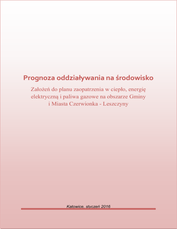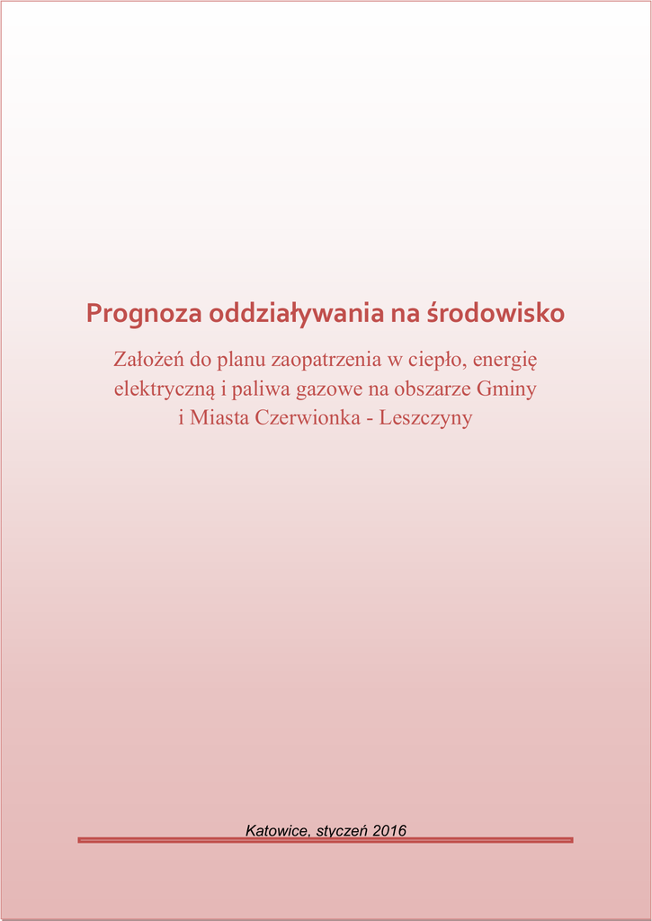 Prognoza oddziaływania na środowisko Założeń do planu zaopatrzenia w ciepło, energię elektryczną i paliwa gazowe na obszarze Gminy i Miasta Czerwionka - Leszczyny Katowice, styczeń 2016 Wykonawcy: • Piotr Kukla – prowadzący • Małgorzata Kocoń- opracowanie prognozy SPIS TREŚCI 1. WSTĘP ........................................................................................................................................... 4 1.1 Podstawy formalno-prawne opracowania dokumentu ................................................................ 4 1.2 Cel i zakres Prognozy ..................................................................................................................... 5 1.3 Informacje o metodach zastosowanych przy sporządzaniu Prognozy ................................... 6 2. STRESZCZENIE W JĘZYKU NIESPECJALISTYCZNYM ........................................................................ 8 3. ZAKRES OCENIANEGO DOKUMENTU .......................................................................................... 11 3.1 Wstęp .......................................................................................................................................... 11 3.2 Projekt „Założeń do planu zaopatrzenia w ciepło, energię elektryczną i paliwa gazowe na obszarze Gminy i Miasta Czerwionka-Leszczyny” – analiza zawartości ......................................... 11 3.3 Cele projektowanego dokumentu ............................................................................................ 13 3.4 Powiązania z innymi dokumentami strategicznymi ............................................................... 14 4. DOTYCHCZASOWE DZIAŁANIA GMINY I MIASTA CZERWIONKA-LESZCZYNY W ZAKRESIE EFEKTYWNOŚCI ENERGETYCZNEJ, GOSPODARKI NISKOEMISYJNEJ ORAZ WYKORZYSTANIA ENERGII ZE ŹRÓDEŁ ODNAWIALNYCH...................................................................................................................... 19 5. STAN ŚRODOWISKA..................................................................................................................... 23 5.1 Położenie geograficzne ............................................................................................................. 23 5.2 Klimat ......................................................................................................................................... 24 5.3 Powierzchnia, krajobraz, złoża naturalne ............................................................................... 25 5.4 Gleby ........................................................................................................................................... 25 5.5 Wody powierzchniowe i podziemne........................................................................................ 25 5.6 Powietrze ................................................................................................................................... 26 5.7 Klimat akustyczny ..................................................................................................................... 26 5.8 Przyroda ..................................................................................................................................... 27 5.9 Formy ochrony przyrody .......................................................................................................... 28 5.10 Zabytki ...................................................................................................................................... 30 5.11 Potencjalne zmiany środowiska w przypadku odstąpienia od realizacji „Założeń do planu zaopatrzenia w ciepło, energię elektryczną i paliwa gazowe na obszarze Gminy i Miasta Czerwionka - Leszczyny”..................................................................................................................... 32 6. PRZEWIDYWANE ODDZIAŁYWANIE NA ŚRODOWISKO W WYNIKU REALIZACJI ZAPISÓW „ZAŁOŻEŃ DO PLANU ZAOPATRZENIA W CIEPŁO, ENERGIE ELEKTRYCZNĄ I PALIWA GAZOWE NA OBSZARZE GMINY I MIASTA CZERWIONKA-LESZCZYNY” ...................................................................... 35 6.1 Stan środowiska na obszarach objętych przewidywanym znaczącym oddziaływaniem na środowisko ........................................................................................................................................... 35 6.2 Przewidywane znaczące oddziaływania na środowisko, w tym na obszary Natura 2000 . 36 6.3 Propozycje rozwiązań mających na celu zapobieganie, ograniczanie lub kompensację przyrodniczą negatywnych oddziaływań na środowisko, mogących być rezultatem realizacji projektowanego dokumentu............................................................................................................... 50 6.4 Informacje o możliwym transgranicznym oddziaływaniu na środowisko związanym z realizacją „Założeń do planu zaopatrzenia w ciepło, energię elektryczną i paliwa gazowe na obszarze Gminy i Miasta Czerwionka-Leszczyny” ............................................................................ 51 6.5 Niedostatki i braki materiałów utrudniające ocenę szkodliwego oddziaływania na środowisko ustaleń projektowanego dokumentu ............................................................................ 52 7. PROPOZYCJE DOTYCZĄCE METOD ANALIZY SKUTKÓW REALIZACJI POSTANOWIEŃ PROJEKTOWANEGO DOKUMENTU........................................................................................................ 53 SPIS TABEL Tabela 4-1 Wykaz zabytków na terenie Gminy i Miasta Czerwionka - Leszczyny ................................. 30 Tabela 6-1. Zidentyfikowane znaczące oddziaływania na środowisko ................................................. 37 Tabela 6-2 Przewidywane znaczące oddziaływania „Założeń do planu zaopatrzenia w ciepło, energię elektryczną i paliwa gazowe na obszarze Gminy i Miasta Czerwionka-Leszczyny” ....