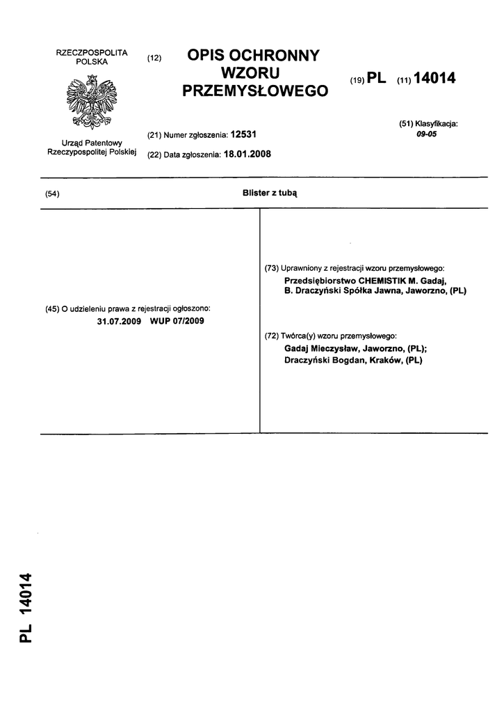 (12) OPI S OCHRONN Y WZORU PRZEMYSŁOWEGO (19) PL (11 ) 14014 (51) Klasyfikacja : 09-05 (21) Nume r zgłoszenia : 1 2 5 3 1 (22) Dat a zgłoszenia : 1 8 . 0 1 . 2 0 0 8 (54) Bliste r z tubą (73) Uprawnion y z rejestracj i wzoru przemysłowego : Przedsiębiorstwo CHEMISTI K M . Gadaj, B. Draczyński Spółka Jawna, Jaworzno, (PL) (45) O udzieleni u praw a z rejestracj i ogłoszono : 31.07.2009 WU P 07/200 9 (72) Twórca(y ) wzor u przemysłowego : Gadaj Mieczysław, Jaworzno, (PL) ; Draczyński Bogdan , Kraków, (PL) Blister z tubą Przedmiotem wzonj przemysłowego Jest Mister z tubą d o kleju Przedmiot wzoru przemysłowego przedstawiony jest na ilustracji, n a której: fig. 1 przedstawi a blister z tubą w pierwszej odmianie, fig. 1a przedstawi a samą tubę w pierwszej odmianie, fig. 2 przedstawi a blister z tubą w drugiej odmianie, fig. 2a przedstawi a samą tubę w drugiej odmianie. Wykaz odmian wzoru: a) odmian a 1 - przedstawion a jest na figurach 1 i 1a b) odmian a 2 - przedstawion a jest na figurach2i 2a Jak pokazan o n a ilustracji , bliste r w ob u odmianac h stanow i prostokątny kartonik, d o któreg o w częśc i środkowe j przytwierdzon a jes t trwal e podłużn a kopulka, wykonan a z przeźroczysteg o sztywneg o materiału , a po d ni ą umieszczona jes t tub a d o kleju . W częśc i górne j kartoni k zaopatrzon y jest w podłużne wycięci e d o zawieszani a n a odpowiedni m wysięgnik u w punkci e sprzedaży. W pierwsze j odmiani e wzoru , n a niebieski m pasku , umieszczony m prz y górnej krawędzi kartonika, jest z lewe j strony delikatny biały ornament z białym podpisem: original , za ś z e stron y prawe j jest drobn y wyraz w kolorz e złotym: CHEMI, a z a ni m biał y napi s w dwóc h wierszach: SU K SYSTEM. Poniże j niebieskiego paska jest niebieskie tło z motywe m półcieni, na którym po prawej stronie jest fotografi a końcó w palcó w dłoni , trzymającyc h konie c tubk i z biał ą pipetą. Przy końcu pipety jest mał a kropla płynu, oraz szereg jaśniejszych od tta współokręgów. N a pozostałe j częśc i niebieskieg o ta położon e jes t ukośni e podłużne pol e stylizowanego rombu w kolorz e złotym , prz y czy m lew y bo k i część dolneg o bok u rombu obwiedzione s ą zamknięt ą lini ą w kolorz e złotym , natomiast prawy bok łączy się z okręgiem w kolorze złotym, wewnątrz którego jest litera E w również kolorze złotym. W polu rombu wycięte są litery, które wraz z prześwitującym fragmentem ta, pomiędz y rombe m i jego obwiedni ą w postaci zamkniętej złote j linii , tworz ą stylizowan y napis : CYJANOPAN . Tł o centralne j części kartonik a skład a si ę z naprzemiennyc h i zazębionyc h z e sob ą lini i czerwonych i niebieskich , i zmienia swój kolor z dominująceg o czerwonego na dominujący niebieski poprzez stopniowe wygaszanie tych linii. Po prawej stronie przeźroczystej kopuiki z tubą znajdują się kolejno jeden nad drugim trzy kwadraty w obrysie czarno-białym, przy czym nad górnym kwadratem jest niebiesko-biały napis w czarnym obrysie: Do połączeń elastycznych, zaś pod dolnym kwadratem jest żółt e koł o z cerrtryczny m czerwony m okręgiem . Kwadrat y wypełnione s ą niebieskim tam, n a któr e nałożon e s ą fotografi e różnyc h przedmiotów do klejenia, którymi kolejno są: but, cukiernica z oderwanym uchem oraz samochód zabawka. Wewnątrz czerwonego okręgu - n a żółtym kole jest napis: 20 LAT , a wokół niego owinięty jest pas w kolorze szarym z napisem: NA RYNKU. Po lewej stronie przeźroczystej kopula z tubą, na dominującym czerwonym tle jest pionowo usytuowany biał y prostokąt , wewnątr z któreg o znajduj e si ę niebiesk i napi s w czarnym obrysie : SEKUNDOW O ŁĄCZĄCY , a dale j n a mały m czarny m prostokącie jes t równie ż usytuowan y pionow o biał y wyraz : KLEJ , natomias t poniżej jes t oznaczeni e w kolorz e białym : 2g . N a niebieski m pasku , umieszczonym przy dolnej krawędzi kartonika jest drobny napis w kolorze białym: WWW.chemistik.pl. Umieszczon a po d przeźroczyst ą kopułk ą tub a skład a si ę kolejno z niebiesko-czerwonego zbiornika, niebieskiego pierścienia dystansowego, białego kołnierz a pipet y ora z nakrętk i motylkowe j w kolorz e niebieskim . N a niebieskiej powierzchn i zbiornika , wzdłu ż jeg o praweg o kontur u boczneg o jest położone ukośni e podłużn e pol e stylizowanego romb u w kolorz e złotym, prz y czym lew y bo k i częś ć dolneg o bok u romb u obwiedzion e s ą zamknięt ą Unią w kolorze złotym, natomias t prawy bok rombu łączy się z okręgie m również w kolorze złotym, wewnątrz którego na białym tiejest litera E w koknze niebieskim. Na polu rombu znajdują się czarne litery, które wraz z zaczernionym fragmentom powierzchni pomiędzy rombem i jego obwiednią w postaci zamkniętej złotej linii tworzą stylizowan y napis : CYJANOPAN . N a mniejsze j czerwone j powierzchn i zbiornika, znajdującej się przy lewym konturze zbiornika, naniesiony jest drobny napis w kolorze białym: sekundowo - łączący , zaś na dole zbiornika jest drobny napis w kolorze białym: WWW.chemistik.pl . W drugiej odmianie wzoru, na czerwonym pasku, umieszczonym przy górnej krawędzi kartonika, jest z lewej strony delikatny biały ornament z białym podpisem: original, zaś ze strony prawej jest drobny wyraz w kolorze złotym: CHEMI, a za nim biały napis w dwóch wierszach: STIK SYSTEM. Poniże j czerwonego paska jest czerwone tł o z motywe m półcieni , n a który m p o prawe j stroni e jest fotografi a końców palców dłoni, trzymających koniec tubki z białą pipetą. Pizy końcu pipety jest mał a kropl a płynu , ora z szere g jaśniejszyc h o d tł a wspótokręgów . N a pozostałej częśc i czerwoneg o tł a położon e jes t skośni e podłużn e poł ę stylizowanego rombu w kolorze złotym, przy czym lewy bok i część dolnego boku rombu obwiedzion e s ą zamknięt ą Uni ą w koknz e