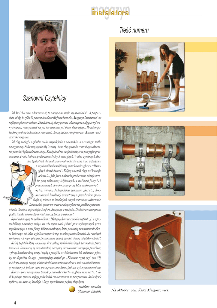 TreÊç numeru Szanowni Czytelnicy Jak ktoÊ chce mnie zdenerwowaç, to zaczyna mi swoje sny opowiadaç... Á propos Êni∏o mi si´, ˝e tylko 99 procent instalatorskiej braci uzna∏o „Magazyn Instalatora“ za najlepsze pismo bran˝owe. Zbudzi∏em si´ zlany potem i odetchnà∏em z ulgà: to by∏ senny koszmar, rzeczywistoÊç nie jest tak straszna, jest du˝o, du˝o lepiej... Po takim pobudkowym doÊwiadczeniu chce si´ wstaç, chce si´ ˝yç, chce si´ pracowaç. A nawet - walczyç! Na ring wi´c... Jak ring to ring! - napisa∏ w swoim artykule jeden z uczestników. A nasz ring to walka na argumenty. Zobaczmy, z jakà si∏à (ssawnà - bo to ring systemów centralnego odkurzania przecie˝) b´dà zadawane ciosy: „Ka˝dy detal ma swojà histori´ oraz precyzyjne przeznaczenie. Prosta budowa, pozbawiona zb´dnych, awaryjnych i trudno wymiennych uk∏adów (gad˝etów), doÊwiadczenie konstruktorskie oraz Êcis∏a wspó∏praca z u˝ytkownikami umo˝liwiajà zniwelowanie zg∏oszeƒ reklamacyjnych niemal do zera“. Kolejny uczestnik ringu zaÊ kontruje: „Firma (...) jako jeden z niewielu producentów, oferuje szerokà gam´ odkurzaczy trójfazowych, z turbinami firmy (...), przeznaczonych do jednoczesnej pracy kilku u˝ytkowników“. Sà te˝ i ciosy bez zb´dnego ha∏asu zadawane: „Rury (...) do niskoszumowej kanalizacji wewn´trznej z powodzeniem sprawdzajà si´ równie˝ w instalacjach ssàcych centralnego odkurzania. JednoczeÊnie system ten stwarza niespotykane na polskim rynku w∏aÊciwoÊci t∏umiàce, zapewniajàc komfort akustyczny w budynku. Dodatkowo wewn´trzna g∏adka Êcianka uniemo˝liwia osadzanie si´ kurzu w instalacji“. Rynek instalacyjny to walka o klienta. Dlatego jeden z uczestników napisa∏: „(...) wprowadziliÊmy procedury majàce na celu wymuszenie jakoÊci prac wykonywanych przez wspó∏pracujàce z nami firmy. Eliminowanie tych, które powodujà niezadowolenie klienta koƒcowego, ale tak˝e wyjàtkowe wsparcie (np. przekazywanie klientów) dla rzetelnych partnerów - te rygorystycznie przestrzegane zasady zwielokrotniajà satysfakcj´ klienta“. Ka˝dy pope∏nia b∏´dy - instalacje nie uzyskujà swoich najwy˝szych parametrów pracy, trwa∏oÊci. Inwestorzy sà niezadowoleni, zarzàdcy nieruchomoÊci zaczynajà przeklinaç, a firmy handlowe liczà straty i myÊlà o przejÊciu na dziewiarstwo lub malowanie pejza˝y. nie dopuÊçmy do tego - przeczytajmy artyku∏ pt. „Klarowne regu∏y gry“ (str. 34), w którym autorzy, majàcy wieloletnie doÊwiadczenie zawodowe z zakresu technik instalacji miedzianych, poka˝à, czym gro˝à pewne zaniedbania podczas wykonywania monta˝u. Koƒcz´ - pora na wyznanie (senne): „Czas odkryç karty - w g∏owie mam narty...“. JeÊli kogoÊ tym (stanem mojego posiadania) rozczarowa∏em, to przepraszam. Snów si´ nie wybiera, one same si´ instalujà. Mi∏ego wyczekiwania pi´knej zimy ˝yczy redaktor naczelny S∏awomir Bibulski 4 Na ok∏adce: coll. Karol Ma∏gorzewicz.