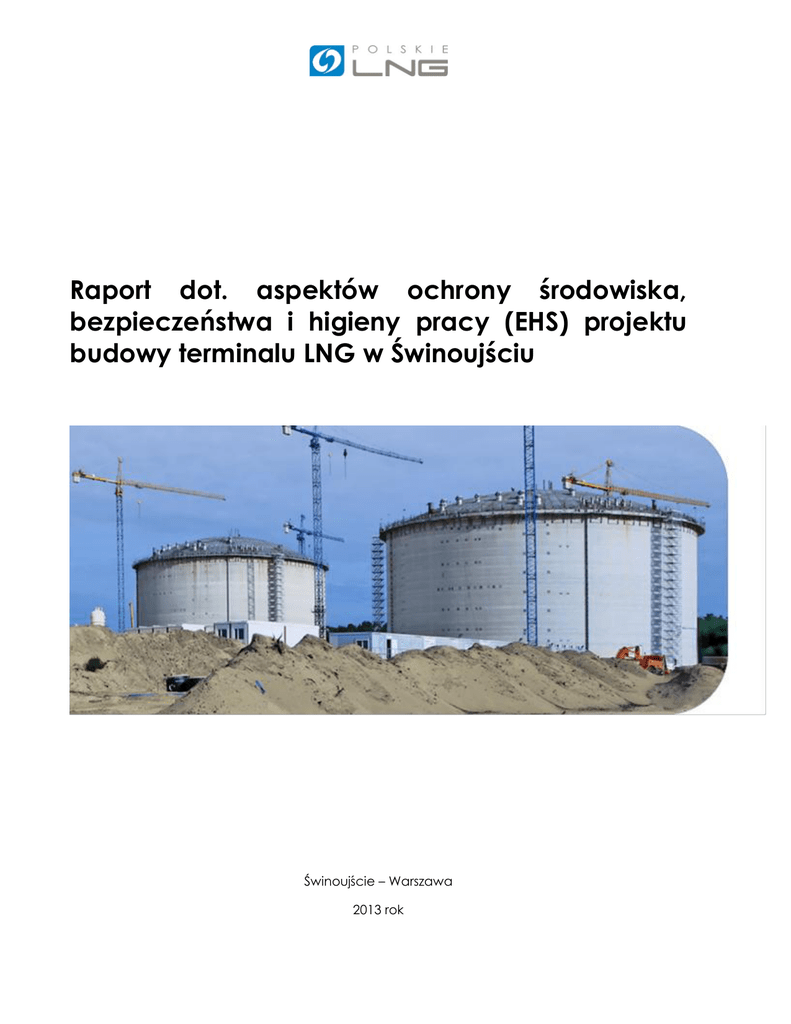 Raport dot. aspektów ochrony środowiska, bezpieczeństwa i higieny pracy (EHS) projektu budowy terminalu LNG w Świnoujściu Świnoujście – Warszawa 2013 rok Spis treści Strona 3 Informacje o inwestycji Strona 4 Terminal a środowisko Strona 4 Raport oddziaływania przedsięwzięcia na środowisko Strona 5 Decyzja Środowiskowa Strona 6 Monitoring oddziaływania inwestycji na środowisko Strona 6 Działania proekologiczne Spółki Polskie LNG Strona 7 Działania Spółki Polskie LNG w zakresie Bezpieczeństwa i Higieny Pracy Strona 12 Informacje przedstawione w Rocznym Sprawozdaniu Środowiskowo – Społecznym dla Europejskiego Banku Odbudowy i Rozwoju 2 Informacje o inwestycji Polskie LNG S.A. jest spółką celową powołaną w 2007 roku do budowy i eksploatacji terminalu LNG w Świnoujściu, czyli instalacji do odbioru i regazyfikacji skroplonego gazu ziemnego (ang. LNG – Liquefied Natural Gas) dostarczanego drogą morską praktycznie z dowolnego kierunku na świecie. Powstający w Świnoujściu Terminal LNG jest pierwszym tego typu projektem infrastrukturalnym nie tylko w Polsce, ale także w Europie Środkowo-Wschodniej, który ma na celu dywersyfikację źródeł dostaw gazu do kraju oraz poprawę bezpieczeństwa energetycznego całego regionu. Z tego względu inwestycja została uznana przez Rząd za strategiczną dla polskiej gospodarki. W pierwszym etapie eksploatacji terminal LNG pozwoli na odbiór 5 mld m³ gazu ziemnego rocznie. W kolejnym etapie, w zależności od wzrostu zapotrzebowania na surowiec, możliwe będzie zwiększenie zdolności regazyfikacyjnej do 7,5 mld m³, co stanowi około 50% obecnego rocznego zapotrzebowania na gaz w Polsce (obecnie nasz kraj zużywa ok. 14 mld m³ gazu rocznie). Oprócz spółki Polskie LNG, która odpowiada za budowę lądowej części terminalu LNG, składającej się z urządzeń rozładunkowych, zbiorników magazynujących skroplony gaz ziemny oraz instalacji do regazyfikacji, w realizację inwestycji zaangażowane są trzy inne podmioty: Urząd Morski w Szczecinie, Zarząd Morskich Portów Szczecin i Świnoujście S.A. oraz Operator Gazociągów Przesyłowych GAZ-SYSTEM S.A., który jest również właścicielem PLNG S.A. Budowa terminalu LNG jest współfinansowana z Programu Operacyjnego Infrastruktura i Środowisko oraz z Europejskiego programu energetycznego na rzecz naprawy gospodarczej. Fot. 1 Terminal LNG widok z falochronu 3 Terminal LNG a środowisko Ochrona przyrody ma duże znaczenie dla Świnoujścia jako miasta uzdrowiskowo-turystycznego. Dlatego spółka Polskie LNG przygotowując się do realizacji inwestycji budowy terminalu LNG, wybrała najkorzystniejszy wariant dla środowiska naturalnego, tak aby funkcjonowanie instalacji nie wpływało negatywnie na walory uzdrowiskowe miasta. Cała inwestycja zostanie Dla zachowania zabytkowych odsunięty o ok. 750 metrów na terenie przemysłowym – przeznaczonym pod rozwój. zrealizowana z fortów i bunkrów od linii brzegowej obszarze Zespołu poszanowaniem środowiska naturalnego. oraz wydm szarych, terminal LNG zostanie i powstanie w części wolińskiej Świnoujścia Portów Szczecin-Świnoujście – od dawna Terminal położony będzie w odległości ok. 1 km od granicy strefy uzdrowiskowej "C". Lokalizacja ta jest korzystna pod względem "róży wiatrów” i zgodnie z przeprowadzonymi obliczeniami rozprzestrzeniania się zanieczyszczeń w atmosferze będą dotrzymane wszelkie standardy jakości powietrza określone obowiązującymi przepisami prawa. Spółka Polskie LNG uzyskała certyfikat „Systemu zarządzania środowiskowego ISO 14001:2004” wg międzynarodowych standardów ISO, oznacza to, że pierwszy polski terminal LNG jest budowany zgodnie z wszelkimi wymogami w zakresie jakości, bezpieczeństwa, z uwzględnieniem wpływu inwestycji na jakość życia mieszkańców w sąsiedztwie inwestycji oraz środowiska naturalnego. Raport oddziaływania przedsięwzięcia na środowisko Raport (ocena) o oddziaływaniu przedsięwzięcia na środowisko jest opracowaniem technicznoprzyrodniczym. Pozwala on przeanalizować możliwości realizacji inwestycji w taki sposób, by była ona bezpieczna dla środowiska i nie stwarzała zagrożenia dla przyrody. Zawiera informacje zgodne z art. 52. Ustawy Prawo ochrony środowiska z 2001 r. Wniosek o wydanie decyzji środowiskowej został złożony do Wojewody Zachodniopomorskiego w dniu 9 czerwca 2008 r. W zależności od rodzaju inwestycji może być on dokumentem obowiązkowym (dla inwestycji z tzw. I. grupy przedsięwzięć) lub fakultatywnym (dla inwestycji z II. grupy przedsięwzięć). Inwestycja „Terminal regazyfikacyjny skroplonego gazu ziemnego w Świnoujściu” została zakwalifikowana do II. grupy przedsięwzięć, w myśl regulacji zawartych w Rozporządzeniu Rady Ministrów z dnia 9 listopada 2004 r. Gotowy Raport o oddziaływaniu przedsięwzięcia na środowisko Polskie LNG sp. z o.o. złożyła 17 grudnia 2008 r. do Regionalnej Dyrekcji Ochrony Środowiska w Szczecinie i Prezydenta Miasta Świnoujście. Raport dostępny jest na stronie internetowej spółki pod adresem: http://www.polskielng.pl/terminal-a-srodowisko/konsultacje-wynikow-audytu-srodowiskowegodue-diligence/ 4 Fot 2 Widok plaży przy terminalu LNG w Świnoujściu Decyzja Środowiskowa W dniu 12 lutego 2009 roku spółka Polskie LNG otrzymała decyzję środowiskową dla części morskiej terminalu LNG, wydaną przez Regionalnego Dyrektora Ochrony Środowiska w Szczecinie, a w dniu 4 marca 2009 roku decyzję środowiskową dotyczącą części lądowej, wydaną przez Prezydenta Miasta Świnoujście. Uzyskanie Decyzji o środowiskowych uwarunkowaniach zgody na realizację inwestycji (zwanej w skrócie – decyzją środowiskową) jest informacją, że przedsięwzięcie jest możliwe do realizacji w występującym na terenie przyszłej inwestycji otoczeniu przyrodniczym, przy uwzględnieniu określonych warunków oraz wymagań dotyczących oc