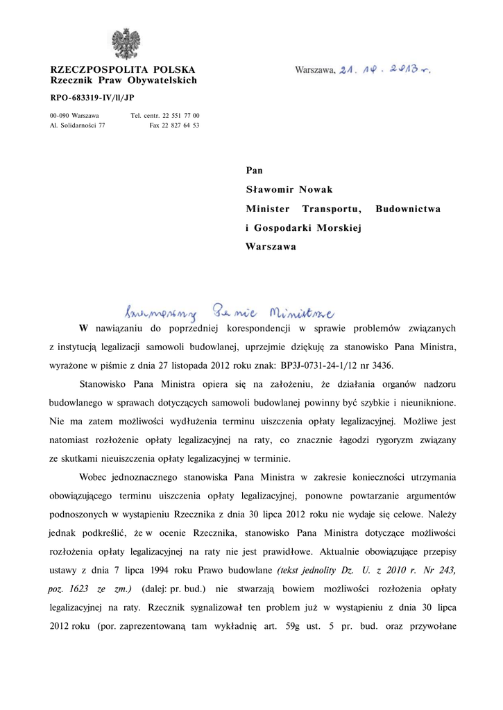 legalizacyjnej na raty. Rzecznik sygnalizował ten problem już w wystąpieniu z dnia 30 lipca