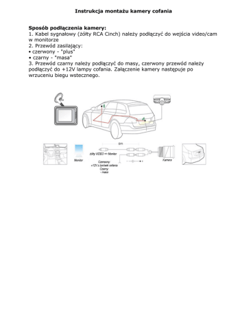 Instrukcja montażu kamery cofania Sposób podłączenia kamery: 1. Kabel sygnałowy (żółty RCA Cinch) należy podłączyć do wejścia video/cam w monitorze 2. Przewód zasilający: • czerwony - "plus" • czarny - "masa" 3. Przewód czarny należy podłączyć do masy, czerwony przewód należy podłączyć do +12V lampy cofania. Załączenie kamery następuje po wrzuceniu biegu wstecznego.