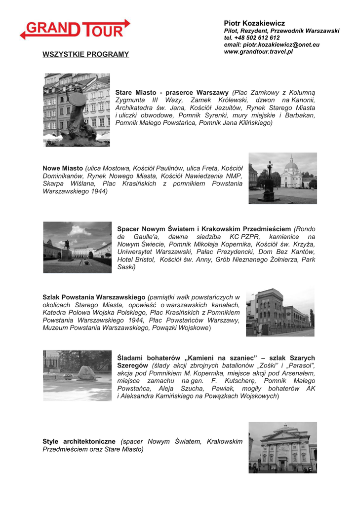 Piotr Kozakiewicz WSZYSTKIE PROGRAMY Pilot, Rezydent, Przewodnik Warszawski tel. +48 502 612 612 email: [email protected] www.grandtour.travel.pl Stare Miasto - praserce Warszawy (Plac Zamkowy z Kolumną Zygmunta III Wazy, Zamek Królewski, dzwon na Kanonii, Archikatedra św. Jana, Kościół Jezuitów, Rynek Starego Miasta i uliczki obwodowe, Pomnik Syrenki, mury miejskie i Barbakan, Pomnik Małego Powstańca, Pomnik Jana Kilińskiego) Nowe Miasto (ulica Mostowa, Kościół Paulinów, ulica Freta, Kościół Dominikanów, Rynek Nowego Miasta, Kościół Nawiedzenia NMP, Skarpa Wiślana, Plac Krasińskich z pomnikiem Powstania Warszawskiego 1944) Spacer Nowym Światem i Krakowskim Przedmieściem (Rondo de Gaulle'a, dawna siedziba KC PZPR, kamienice na Nowym Świecie, Pomnik Mikołaja Kopernika, Kościół św. Krzyża, Uniwersytet Warszawski, Pałac Prezydencki, Dom Bez Kantów, Hotel Bristol, Kościół św. Anny, Grób Nieznanego Żołnierza, Park Saski) Szlak Powstania Warszawskiego (pamiątki walk powstańczych w okolicach Starego Miasta, opowieść o warszawskich kanałach, Katedra Polowa Wojska Polskiego, Plac Krasińskich z Pomnikiem Powstania Warszawskiego 1944, Plac Powstańców Warszawy, Muzeum Powstania Warszawskiego, Powązki Wojskowe) Śladami bohaterów „Kamieni na szaniec” – szlak Szarych Szeregów (ślady akcji zbrojnych batalionów „Zośki” i „Parasol”, akcja pod Pomnikiem M. Kopernika, miejsce akcji pod Arsenałem, miejsce zamachu na gen. F. Kutscherę, Pomnik Małego Powstańca, Aleja Szucha, Pawiak, mogiły bohaterów AK i Aleksandra Kamińskiego na Powązkach Wojskowych) Style architektoniczne (spacer Nowym Światem, Krakowskim Przedmieściem oraz Stare Miasto) Tajemnice Łazienek Królewskich i ich właściciele (historia powstania, nieznane fakty i architektura klasycystyczna) Pałac w Wilanowie i postać Jana III Sobieskiego (fakty, tajemnice, historyczne kontrowersje i architektura baroku) Getto - Muranów (Plac Grzybowski i Synagoga Nożyków, spacer uliczkami w obrębie dawnego getta, kopiec Mordechaja Anielewicza przy Miłej, Pomnik Bohaterów Getta, Muzeum Historii Żydów Polskich – z zewnątrz, Umschlagplatz, Cmentarz Żydowski) Warszawskie nekropolie – wspomnienie tych, którzy odeszli (do wyboru: Stare Powązki, Cmentarz Wojskowy na Powązkach, Cmentarz Żydowski, Cmentarz Ewangelicko – Augsburski, Cmentarz Ewangelicko - Reformowany) Szlak Czekoladowy (historia rodziny Wedlów i zwiedzanie Fabryki Wedla, kamienica E. Wedla, grobowiec rodzinny Wedlów na Cmentarzu Ewangelicko - Augsburskim) Baśnie i legendy warszawskie (legenda o Warsie i Sawie, opowieść o Bazyliszku, legenda o Syrence, śpiący KsiążęNiedźwiedź pod Kościołem Jezuitów, historia o demonicznym Czarnym Kocie, legenda o Złotej Kaczce) Czar PRL (dawna siedziba KC PZPR, Marszałkowska Dzielnica Mieszkaniowa i Plac Konstytucji, Pałace Józefa Stalina, Marszałkowska – Ściana Wschodnia, historia PKiN i wjazd na taras widokowy, bar mleczny) Władza – jak to działa? (uwaga: do wejścia konieczna jest wcześniejsza rezerwacja terminu; siedziba Prezydenta m.st. Warszawy, Pałac Prezydencki, Sejm i Senat, ambasady, Kancelaria Prezesa Rady Ministrów) Szlak Fryderyka Chopina (Pomnik F. Chopina w Łazienkach Królewskich, Trakt Królewski i ławki chopinowskie, Kościół św. Krzyża z sercem kompozytora, Uniwersytet Warszawski, Muzeum Fryderyka Chopina, groby rodziny kompozytora na Powązkach, możliwość wzbogacenia wycieczki o wyjazd do Żelazowej Woli) Śladami Jana Pawła II (Aleja Jana Pawła II, Plac Piłsudskiego, Pałac Prezydencki, Kościół św. Anny, Zamek Królewski, Dom sióstr urszulanek, ulica Miodowa, Archikatedra św. Jana Chrzciciela, Centrum Myśli Jana Pawła II, Kościół Wszystkich Świętych przy Placu Grzybowskim, Sejm Rzeczpospolitej Polskiej, Belweder, możliwość rozbudowania wycieczki o Wadowice) Warszawska Praga (sekrety Szmulowizny – Michałów, fabryka PPG – Fabryka Trzciny, Bazylika na Kawęczyńskiej, zabytkowy drewniany dom z XVIIIw, zajezdnia tramwajowa na Kawęczyńskiej, Dworzec Wschodni, główne arterie komunikacyjne Pragi i ich historia, Bazar Różyckiego, Pomnik „Czterech Śpiących”, Cerkiew Marii Magdaleny, trasa W-Z, Katedra Praska, Pomnik ks. Skorupki, warszawskie ZOO) Warszawskie „drapacze chmur” (Warsaw Trade Tower budynek Daewoo, Hotel Hilton, Millenium Plaza, Warta Tower, Wieża Ciśnień Filtrów Lindleya, budynek Rondo 1, Warsaw Financial Center, Orco Tower, Hotel InterContinental, Złota 44, Złote Tarasy, Oxford Tower, Centrum LIM – Hotel Marriott, Pałac Kultury i Nauki – wjazd na 33 piętro i oglądanie panoramy Warszawy, Prudential, budynek PASTy) Nowoczesne oblicze Warszawy (Stadion Narodowy, Centrum Nauki Kopernik, Most Świętokrzyski, budynek Biblioteki Uniwersytetu Warszawskiego, budynek Metropolitan, gmach Sądu Najwyższego w Warszawie, metro warszawskie, Złote Tarasy i Złota 44, podziemia Dworca Centralnego) Warszawskie mosty – spacer Skarpą Wiślaną (mosty pontonowe i tymczasowe, Most Siekierkowski, Most Łazienkowski, Most Mikołajewski - Poniatowskiego, Most Syreny, most średnicowy kolejowy, Most Świętokrzyski, Most Zygmunta Augusta, Most Aleksandryjski – Kierbedzia, Most Śląsko - Dąbrowski, Most Gdański) Zielony zakątek (spacer po Parku Skaryszewskim i odkrywanie jego tajemnic – rosarium, Pomnik I.J. Paderewskiego, miejsce rozbicia Liberatora, jedyny warszawski pomnik ofiar WTC, Pomnik Żołnierzy Radzieckich, historia Fabryki Wedla, Park Skaryszewski planem filmowym) Warszawskie drużyny (stadion Legii Warszawa, grób Kazimierza Deyny i innych słynnych sportowców na Powązkach Wojskowych, stadion Polonii Warszawa, Stadion Narodowy) Rejs tramwajem wodnym (opowieści o historii miasta oraz tajemnicach związanych z jego założeniem; Warszawa lewobrzeżna kontra prawobrzeżna; następnie spacer Krakowskim Przedmieściem i Stare Miasto) Śladami wybitnych oso