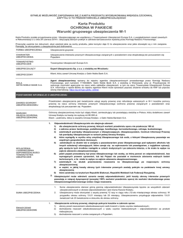 ISTNIEJE MOŻLIWOŚĆ ZAPOZNANIA SIĘ Z KARTĄ PRODUKTU WYDRUKOWANĄ WIĘKSZĄ CZCIONKĄ. ZAPYTAJ O TO PRZEDSTAWICIELA UBEZPIECZAJĄCEGO Karta Produktu OCHRONA W PAKIECIE Warunki grupowego ubezpieczenia W-1 Karta Produktu została przygotowana przez Ubezpieczającego we współpracy z Towarzystwem Ubezpieczeń Europa S.A. z uwzględnieniem zasad zawartych w Rekomendacji U z dnia 24 czerwca 2014 r. dotyczącej dobrych praktyk w zakresie bancassurance wydanej przez Komisję Nadzoru Finansowego. Przeczytaj uważnie ten dokument, abyś wiedział jakie są cechy produktu, jakie korzyści daje Ci to ubezpieczenie oraz jakie obowiązki są z nim związane. Pamiętaj, że skorzystanie z ubezpieczenia jest dobrowolne. FORMA UBEZPIECZENIA Ubezpieczenie grupowe CHARAKTER UBEZPIECZENIA Ubezpieczenie interesów prawnych Ubezpieczonego związanych z posiadaniem oraz eksploatacją lub poruszaniem się Pojazdem TOWARZYSTWO UBEZPIECZEŃ Towarzystwo Ubezpieczeń Europa S.A. UBEZPIECZAJĄCY Expert Ubezpieczenia Sp. z o.o. z siedzibą we Wrocławiu UBEZPIECZONY ROLA GETIN NOBLE BANK S.A. Klient, który zawarł Umowę Kredytu z Getin Noble Bank S.A. Agent ubezpieczeniowy wpisany do rejestru agentów ubezpieczeniowych prowadzonego przez Komisję Nadzoru Finansowego, pod numerem 11165368/A. Getin Noble Bank S.A. z siedzibą w Warszawie, przy ul. Przyokopowej 33 wykonuje czynności agencyjne na rzecz wielu zakładów ubezpieczeń, w tym na rzecz Towarzystwa Ubezpieczeń Europa S.A. Informacje o wpisie Banku do rejestru agentów Klient może sprawdzić poprzez złożenie wniosku do KNF lub poprzez stronę internetową: https://au.knf.gov.pl/Au_online/. PODSTAWOWE INFORMACJE O UBEZPIECZENIU ZAKRES OCHRONY UBEZPIECZENIOWEJ Przedmiotem ubezpieczenia jest świadczenie usługi asysty prawnej oraz refundacja wskazanych w W-1 kosztów pomocy prawnej na rzecz ochrony interesów prawnych Ubezpieczonego (ochrona prawna) związanych z posiadaniem oraz eksploatacją lub poruszaniem się Pojazdem. WARUNKI OBJĘCIA OCHRONĄ UBEZPIECZENIOWĄ Ochroną ubezpieczeniową może być objęty Klient, zamieszkujący lub posiadający siedzibę w Polsce, który dodatkowo zawarł Umowę Kredytu na kwotę nie wyższą niż 80.000 zł. Klient – podmiot/y, który/-e zawarł/y Umowę Kredytu z Getin Noble Bankiem S.A. 1. Odpowiedzialność Ubezpieczyciela nie obejmuje zdarzeń: 1) 2) 3) 4) 5) WYŁĄCZENIA I OGRANICZENIA ODPOWIEDZIALNOŚCI TOWARZYSTWA UBEZPIECZEŃ 6) 7) 8) dla ubezpieczenia ochrony prawnej, których wartość przedmiotu sporu nie przekracza 100 zł; z zakresu prawa: bankowego, podatkowego, handlowego, karnoskarbowego, celnego, budowlanego; zaistniałych pomiędzy Ubezpieczonym a Ubezpieczającym, Ubezpieczycielem, Centrum Informacji Prawnej lub pomiędzy Ubezpieczonymi w ramach jednej Umowy Kredytu; które wystąpiły w wyniku winy umyślnej Ubezpieczonego lub osób, z którymi Ubezpieczony pozostaje we wspólnym gospodarstwie domowym; zaistniałych na skutek lub w związku z pozostawaniem przez Ubezpieczonego pod wpływem alkoholu lub innych substancji odurzających, które uznaje się za wykroczenie lub przestępstwo, z wyjątkiem sytuacji, gdy spożycie tych środków nastąpiło w celach medycznych i po zaleceniu lekarza, o ile miało to wpływ na zajście zdarzenia ubezpieczeniowego; jeżeli pojazd prowadzony był przez Ubezpieczonego lub osobę, za którą ponosi on odpowiedzialność, bez wymaganych prawem uprawnień, lub też Pojazd nie posiadał w momencie zdarzenia ważnych badań technicznych, o ile miało to wpływ na zajście zdarzenia ubezpieczeniowego; zaistniałych na skutek przeniesienia roszczenia na Ubezpieczonego po rozpoczęciu ochrony ubezpieczeniowej; w części, w jakiej koszty obrony tych interesów prawnych zostały pokryte na podstawie innej umowy ubezpieczenia; które zaistniały na terytorium Republiki Białorusi, Republiki Mołdawii lub Federacji Rosyjskiej. 9) 2. Ubezpieczyciel może odmówić uznania swojej odpowiedzialności, jeśli koszty obrony interesów prawnych pozostają w rażącej dysproporcji (powyżej 150% wartości przedmiotu sporu) do wartości dochodzonego przez Ubezpieczonego/skierowanego wobec niego roszczenia. 1. 2. SUMA UBEZPIECZENIA 1. ŚWIADCZENIE UBEZPIECZENIOWE Suma ubezpieczenia stanowi górną granicę odpowiedzialności Ubezpieczyciela łącznie ze wszystkich zdarzeń ubezpieczeniowych w okresie odpowiedzialności i jest równa Kwocie Kredytu. Ubezpieczony może skorzystać z asysty prawnej 12 razy w ciągu roku (12-sto miesięcznego okresu ochrony). W przypadku okresu ochrony 13-21 miesięcy lub 23 miesięcy, Ubezpieczonemu przysługuje odpowiednio 13-21 świadczeń lub 23 świadczenia w stosunku do okresu ochrony. Ubezpieczenie ochrony prawnej, obejmuje pokrycie kosztów w zakresie spraw: 1) obrony przed roszczeniami odszkodowawczymi osób trzecich z tytułu czynów niedozwolonych; 2) dochodzenia roszczeń odszkodowawczych z tytułu czynów niedozwolonych i odpowiedzialności za produkt niebezpieczny 3) dochodzenia roszczeń z umów związanych z Pojazdem; sporów z zakresu spadków; sporów z zakresu prawa administracyjnego, związanych z prawem jazdy Ubezpieczonego lub dowodem rejestracyjnym Pojazdu; 6) obrony w sprawach z zakresu prawa: o ruchu drogowym, wykroczeń i prawa karnego, 7) obrony przed egzekucją komorniczą z Pojazdu; 8) praw rzeczowych Ubezpieczonego na wydzielonych nieruchomościach Ubezpieczonego służących wyłącznie parkowaniu (miejsce parkingowe, garaż, wiata itp.). Ubezpieczyciel w ramach W-1 zobowiązuje się pokryć następujące koszty pomocy prawnej Ubezpieczonego: 1) wynagrodzenie adwokata lub radcy prawnego z tytułu zastępstwa procesowego; 2) koszty i opłaty sądowe wszystkich instancji; 3) koszty procesu strony przeciwnej, jeżeli Ubezpieczony został prawomocnie zobowiązany do ich pokrycia; 4) poręczenia majątkowego, do wysokości 100% sumy ubezpieczenia z zastrzeżeniem zwrotu w razie zniesienia środka zapobiegawczego lub w