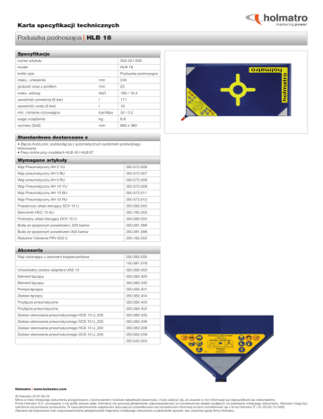Karta specyfikacji technicznych Poduszka podnosząca | HLB 18 Specyfikacje numer artykułu 350.321.009 model HLB 18 krótki opis Poduszka podnosząca maks.. uniesienie mm 240 grubość wraz z profilem mm 25 maks. udźwig kN/t 180 / 18.4 zawartość powietrza (8 bar) l 171 zawartość wody (8 bar) l 19 min. ciśnienie rozrywające bar/Mpa 32 / 3.2 waga urządzenia kg 6.8 wymiary (DxS) mm 660 x 360 Standardowo dostarczane z • Złącza AutoLock; szybkozłącza z automatycznym systemem podwójnego blokowania • Pasy nośne przy modelach HLB 40 i HLB 67 Wymagane artykuły Wąż Pneumatyczny AH 5 YU 350.572.006 Wąż pneumatyczny AH 5 BU 350.572.007 Wąż pneumatyczny AH 5 RU 350.572.008 Wąż Pneumatyczny AH 10 YU 350.572.009 Wąż Pneumatyczny AH 10 BU 350.572.011 Wąż Pneumatyczny AH 10 RU 350.572.012 Pojedynczy uklad sterujący SCV 10 U 350.582.042 Sterownik HDC 10 AU 350.182.003 Podwójny uklad sterujący DCV 10 U 350.582.034 Butla ze sprężonym powietrzem, 200 barów 350.581.086 Butla ze sprężonym powietrzem 300 barów 350.581.096 Reduktor Ciśnienia PRV 823 U 350.182.002 Akcesoria Wąż odcinający z zaworem bezpieczeństwa 350.582.035 150.581.078 Uniwersalny zestaw adaptera UAS 10 350.582.050 Element łączący 350.582.420 Element łączący 350.582.430 Pompa łącząca 350.582.401 Zestaw łączący 350.582.404 Przyłącze pneumatyczne 350.582.403 Przyłącze pneumatyczne 350.582.402 Zestaw sterowania pneumatycznego HCS 10 U_200 350.582.435 Zestaw sterowania pneumatycznego DCS 10 U_200 350.582.436 Zestaw sterowania pneumatycznego HCS 10 U_300 350.582.038 Zestaw sterowania pneumatycznego DCS 10 U_300 350.582.039 350.542.003 Holmatro | www.holmatro.com © Holmatro 2016-08-23 Mimo iż treść niniejszego dokumentu przygotowano z dochowaniem możliwie największej staranności, może zdarzyć się, że zawarte w nim informacje są nieprawidłowe lub niekompletne. Firma Holmatro N.V. i powiązane z nią spółki (zwane dalej: Holmatro) nie ponoszą jakiejkolwiek odpowiedzialności za konsekwencje działań podjętych na podstawie niniejszego dokumentu. Wartości mogą być odmienne od pomiarów producenta. W razie jakichkolwiek wątpliwości dotyczących prawidłowości lub kompletności informacji prosimy kontaktować się z firmą Holmatro (T +31 (0)162-751500). Zabrania się kopiowania i/lub rozpowszechniania jakiegokolwiek fragmentu niniejszego dokumentu w jakikolwiek sposób, bez wyraźnej zgody firmy Holmatro.