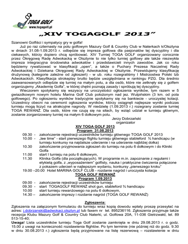 „XIV TOGAGOLF 2013” Szanowni Golfiści i sympatycy gry w golfa! Już po raz czternasty na polu golfowym Mazury Golf & Country Club w Naterkach k/Olsztyna w dniach 31.08-1.09.2013 r. odbędzie się impreza golfowa dla pasjonatów tej dyscypliny i dla ciekawych, którzy dopiero chcą spróbować. XIV Turniej TOGA GOLF organizowany corocznie przez Okręgową Radę Adwokacką w Olsztynie to nie tylko turniej golfowy ale także niezwykła impreza integracyjna środowiska adwokatów i przedstawicieli innych zawodów. Jak co roku będziemy rywalizować w klasyfikacji „open”, a także o Puchary Prezesa Naczelnej Rady Adwokackiej i Dziekana Okręgowej Rady Adwokackiej w Olsztynie. Przewidujemy klasyfikację drużynową (kategorie zależne od zgłoszeń) - w ub. roku rozegraliśmy I Mistrzostwa Polski Izb Adwokackich. Klasyfikacja strokeplay brutto będzie uwzględniana w rankingu PZG. Dla średnio zaawansowanych odbędzie się turniej na małym polu, a dla osób, które nie zetknęły się z golfem organizujemy „Akademię Golfa”, w której chętni poznają zasady i spróbują tej dyscypliny. Wieczorem spotykamy się wszyscy na uroczystości ogłoszenia wyników, tym razem w 5 gwiazdkowym nowym hotelu Marina Golf Club położonym nad jez. Wulpińskim (3 km. od pola golfowego). Po ogłoszeniu wyników tradycyjnie spotykamy się na bankiecie - uroczystej kolacji. Uczestnicy obecni na ceremonii ogłoszenia wyników, którzy osiągnęli najlepsze wyniki podczas turnieju mogą liczyć na atrakcyjne nagrody. W niedzielę (1.09.2013 r.) rozegrany zostanie turniej TOGA REWANŻ. Dla osób, które nie czują się na siłach, by wziąć udział w turnieju głównym, zostanie zorganizowany turniej na małym 6 dołkowym polu. Jerzy Dobrzański organizator XIV TOGA GOLF 2013 Program 31.08.2013 09.30 - zakończenie rejestracji uczestników turnieju głównego TOGA GOLF 2013 10.00 - „tee time” - start pierwszego flightu turnieju głównego stableford ¾ handicapu (w turnieju konkursy na najdalsze uderzenie i na uderzenie najbliżej dołka) 10.30 zakończenie przyjmowania zgłoszeń do turnieju na polu 6 dołkowym i do Kliniki Golfa 11.00 start I turnieju na polu 6 dołkowym, 11.30 Klinika Golfa (dla początkujących). W programie m.in. zapoznanie z regułami i etykietą golfa, z „wyposażeniem” golfisty, nauka i praktyczne ćwiczenia połączone z pokazem uderzeń w najlepszym wydaniu, konkursy „pierwszego kroku” 19.00 –20.00 Hotel MARINA GOLF CLUB - rozdanie nagród i uroczysta kolacja TOGA GOLF REWANŻ Program 1.09.2013 09.00 - zakończenie rejestracji uczestników turnieju 09.30 - start TOGAGOLF REWANŻ shot gun, stableford ¾ handicapu 10.00 start turnieju rewanżowego na polu 6 dołkowym, 14.30 – zakończenie imprezy i rozdanie nagród (TOGA GOLF REWANŻ) Zgłoszenia: Zgłoszenia na załączonym formularzu do turnieju wraz kopią dowodu wpłaty proszę przesyłać na adres: [email protected] lub faxem nr tel. 895236116. Zgłoszenia przyjmuje także recepcja Klubu Mazury Golf & Country Club Naterki, ul. Golfowa 20A, 11-036 Gietrzwałd, tel. 89 513-15-40; Uwaga! Lista uczestników turnieju Toga Golf zostanie zamknięta w dniu 29.08.2013 r. o godz. 15.00 z uwagi na konieczność rozstawienia flightów. Po tym terminie (nie później niż do godz. 9.30 w dniu 30.08.2013 r.) zgłoszenia będą przyjmowane na listę rezerwową – rozstawienie w dniu turnieju. Niezwłocznie po przyjeździe, proszę zgłosić się do recepcji MG&CC celem rejestracji, a osoby nie zgłoszone wcześniej także do dokonania opłat turniejowych. Brak opłaty i rejestracji co najmniej na 45 min. przed zaplanowanym startem może spowodować zmianę w rozstawieniu uczestnika. Te same zasady obowiązują w turnieju w niedzielę. Opłaty 1 2 3 4 5 6 7 promocja: w cenie: 2 dni dni turniejowe, 2x lunch, uroczysta kolacja (w 5 gwiazdkowym hotelu) 2 dni dni turniejowe, 2x lunch jeden dzień turnieju 1x lunch uroczysta kolacja turniej na 6 dołkowym polu (2 rundy 12 dołków) +bar kawowy sobota turniej na 6 dołkowym polu (2 rundy 12 dołków) +bar kawowy niedziela Klinika Golfa - sobota A adwokaci/apl adwokaccy wpłata do wpłata po 9.08.2013 9.08.2013 350/ 270 470/370 B opłata normalna wpłata do wpłata po 9.08.2013 9.08.2013 450 550 C członkowie MG&CC wpłata do wpłata po 9.08.2013 9.08.2013 300 350 x 130 130 20 x 180 150 40 x 180 130 20 x 200 150 40 170 100 130 x 200 100 150 x 20 40 20 40 x x dla początkujących bez opłat (minimum 10 osób) Uwaga: Uczestnicy turnieju TOGA GOLF (członkowie MG&CC na zasadach klubowych) mają możliwość treningu w dniu 30.08.2013 r. (piątek). green fee - cena 100 zł./os; Wpłat za turniej proszę dokonywać na konto Stowarzyszenia Wspierania Inicjatyw Lokalnych „TOMASZKOWO” ( www.tomaszkowo.com.pl ) nr. 73 1910 1048 2120 0053 2208 0001 z podaniem imienia i nazwiska uczestnika i dopiskiem ”TOGAGOLF 2013”. Dowód wpłaty należy niezwłocznie przesłać wraz ze zgłoszeniem na podany wyżej mail lub faxem. Oryginał należy posiadać przy rejestracji w dniu imprezy. Noclegi Proponujemy zakwaterowanie w 5 gwiazdkowym nowym hotelu Marina Golf Club, Siła 100, 11-036 Gietrzwałd, w którym odbędzie się też uroczysta kolacja. Uzyskaliśmy super promocyjną ofertę – zgłoszeni uczestnicy turnieju TOGAGOLF 2013 rezerwujący pokoje do dnia 9.08.2013 mają gwarantowaną cenę: 280 zł. za pokój 2 osobowy, 220 zł. za pokój jednoosobowy; Oferta dotyczy noclegów 30/31.08.2013 i 31.08/1.09.2013; Liczba miejsc ograniczona; w cenie: parking, śniadanie, nielimitowany wstęp do strefy Wellness (basen, baseny mineralne ,jakuzzi, łaźnia, słoneczna łąka (delikatne solarium), rabat 10% na zabiegi w spa i 20 % na masaże. Rezerwacja indywidualna nie w recepcji lecz na adres mailowy: [email protected]. Rezerwując pokój na zalączonym formularzu należy dokonać przedpłaty (zadatek) w wysokości 50% ceny pokoju (140 zł. lub 110 zł.) tytułem „TOGAGOLF” na konto: 07 