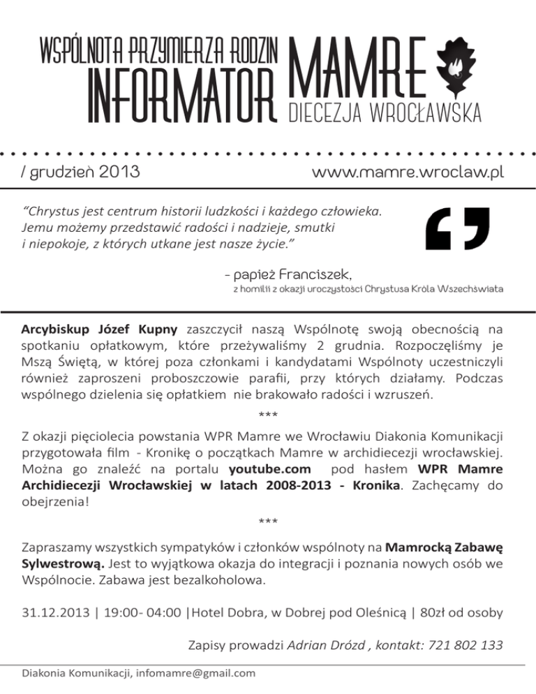 MAMRE INFORMATOR diecezja wroclawska I Wspolnota Przymierza Rodzin , / grudzien 2013 www.mamre.wroclaw.pl “Chrystus jest centrum historii ludzkości i każdego człowieka. Jemu możemy przedstawić radości i nadzieje, smutki i niepokoje, z których utkane jest nasze życie.” - papiez Franciszek, z homilii z okazji uroczystosci Chrystusa Krola Wszechswiata I I I Arcybiskup Józef Kupny zaszczycił naszą Wspólnotę swoją obecnością na spotkaniu opłatkowym, które przeżywaliśmy 2 grudnia. Rozpoczęliśmy je Mszą Świętą, w której poza członkami i kandydatami Wspólnoty uczestniczyli również zaproszeni proboszczowie parafii, przy których działamy. Podczas wspólnego dzielenia się opłatkiem nie brakowało radości i wzruszeń. *** Z okazji pięciolecia powstania WPR Mamre we Wrocławiu Diakonia Komunikacji przygotowała film - Kronikę o początkach Mamre w archidiecezji wrocławskiej. Można go znaleźć na portalu youtube.com pod hasłem WPR Mamre Archidiecezji Wrocławskiej w latach 2008-2013 - Kronika. Zachęcamy do obejrzenia! *** Zapraszamy wszystkich sympatyków i członków wspólnoty na Mamrocką Zabawę Sylwestrową. Jest to wyjątkowa okazja do integracji i poznania nowych osób we Wspólnocie. Zabawa jest bezalkoholowa. 31.12.2013 | 19:00 - 04:00 |Hotel Dobra, w Dobrej pod Oleśnicą | 80zł od osoby Zapisy prowadzi Adrian Drózd , kontakt: 721 802 133 Diakonia Komunikacji, [email protected] 2 informator / świadectwo Nie bój się, swoje życie oddaj Panu! Jestem Bartosz, mam 21 lat. Pan Bóg obecny był w moim życiu zawsze, lecz nie do końca o tym wiedziałem. Utrata wiary nastąpiła w wieku 14 lat, gdy wstąpiłem w mury jednego z gimnazjów. Wydawało mi się, że zjadłem wszystkie rozumy i jestem człowiekiem dorosłym. Sięgnąłem po alkohol, papierosy, nałogowo oglądałem pornografię, a także towarzyst- wo zaraziło mnie fanatycznym kibicowaniem. Wychowałem się w blokowisku, ławka była moim drugim domem. Szukałem wzorca, mężczyzny, którego będę mógł naśladować. Początkowo byli to różni muzycy, później łysi goście, umięśnieni, najlepiej tacy, się na łyso, założyłem dresy, którzy zabiliby jednym ciosem. Ogoliłem bluzę z kapturem, do ręki wziąłem butelkę z piwem i myślałem, że jestem kimś. Spotkałem nowych kolegów, przy których czułem się bezpiecznie. Nie myślałem do jakiego chcę iść liceum, jakie później podjąć studia, chciałem być jak oni, budzić respekt, być silnym fizycznie i psychicznie, pokonać wszystko, co stanie mi na drodze. Po co miałbym szukać Pana Boga? Przemiana mojego życia rozpoczęła się, gdy spotkania dla bierzmowanych, na które w wolności postanowiłem uczęszczać, przejął nowy kapłan Grzegorz. Byłem w szoku. Podciągał się na dwóch palcach, robił mnóstwo pompek i do tego pasjonował się górami. Zdobywał szczyty i jaskinie. To było niesamowite. Budził uznanie, a nie miał w ręku piwa, nie był agresywny. Po prostu był uśmiechnięty, radosny, spokojny i emanował miłością. Konfrontowałem tę siłę, którą poznałem u moich łysych kolegów, z tą, którą on miał. Kolejnym kapłanem, którego Bóg postawił na mojej drodze, był ksiądz Łukasz. Na pierwszym spotkaniu powiedział do chłopaków, że Pan Bóg potrzebuje mężczyzn, żołnierzy, którzy będą apostołami. Ksiądz Łukasz związany był ze Wspólnotą Przymierza Rodzin Mamre i zaproponował nam wyjazd do Częstochowskiej Katedry, gdzie Wspólnota prowadziła misje. Spotkałem tam żywego Pana Boga, przyszedł do mnie i powiedział : „Bartoszu, jesteś, czekałem na Ciebie”. Czułem to w sercu, które biło bardzo mocno. Moi niektórzy koledzy płakali, klękali, modlili się. Pan Bóg zdemaskował te pozorną siłę, pokazał że On jest i to On chce wkroczyć w nasze życie. Modlitwa wstawiennicza, do której przystąpiłem była bardzo przemieniająca, gdyż poczułem jak Pan Bóg zabiera ode mnie wszelkie zranienia, problemy, a także daje mi dar spoczynku, gdzie czuje się jak opadający liść. Następnego dnia 12 chłopaków stawiło się w zakrystii i dzielnie włożyło na siebie białe alby, gotowi, by stać się Armią Pana. To było wspaniałe przeżycie i radykalna zmiana. Porzucenie bezcelowego szukania przygód, by odtąd szukać Miłości na Ołtarzu Chrystusa. Nic nie przyszło łatwo, bo Pan Bóg wymagał też wiele pracy, cierpliwości do walki z nałogami i wadami, ale działał w Sakramentach: Eucharystii i Pokuty. Poukładał plany, zagospodarował życie, ale zostawił też miejsce na przygodę, tyle, że przygodę z Nim. Jestem teraz szczęśliwy, mam dobrych przyjaciół, kochaną wspólnotę, odnowione relacje w rodzinie. Pan Bóg mnie podtrzymuje, doświadcza, ale dzielnie kroczę za nim. Obecnie jestem na 3 roku studiów, a co mnie czeka dalej? Nie wiem, ale jestem pełen ufności, że krzywda mi się nie stanie, bo Pan jest przy mnie. Nie bój się, oddaj swoje życie Panu! mamre z watykanu wzięte / 3 Papież Franciszek: Zostaliśmy wybrani, aby żyć życiem świętym Maryja podtrzymuje nas w naszej wędrówce do Bożego Narodzenia, ponieważ uczy nas jak przeżywać obecny okres Adwentu w oczekiwaniu na Pana. (…) Drodzy bracia i siostry! Druga niedziela Adwentu przypada w dniu uroczystości Niepokalanego Poczęcia Najświętszej Maryi Panny i nasze spojrzenie pociąga piękno Matki Jezusa, naszej Matki! Z wielką radością Kościół kontempluje “pełną łaski” (Łk 1,28), tak jak Bóg na nią spojrzał od pierwszej chwili w swoim planie miłości. Maryja podtrzymuje nas w naszej wędrówce do Bożego Narodzenia, ponieważ uczy nas jak przeżywać obecny okres Adwentu w oczekiwaniu na Pana. Ewangelia św. Łukasza przedstawia nam dziewczynę z Nazaretu, małej miejscowości w Galilei, na peryferiach imperium rzymskiego, a także na peryferiach Izraela. Mimo to na nią skierowało się spojrzenie Pana, który ją wybrał, aby stała 