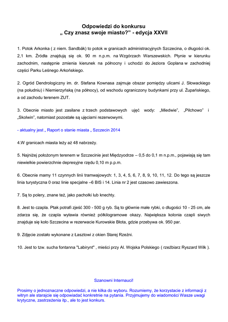 Odpowiedzi do konkursu „ Czy znasz swoje miasto?” - edycja XXVII 1. Potok Arkonka ( z niem. Sandbäk) to potok w granicach administracyjnych Szczecina, o długości ok. 2,1 km. Źródła znajdują się ok. 90 m n.p.m. na Wzgórzach Warszewskich. Płynie w kierunku zachodnim, następnie zmienia kierunek na północny i uchodzi do Jeziora Goplana w zachodniej części Parku Leśnego Arkońskiego. 2. Ogród Dendrologiczny im. dr. Stefana Kownasa zajmuje obszar pomiędzy ulicami J. Słowackiego (na południu) i Niemierzyńską (na północy), od wschodu ograniczony budynkami przy ul. Żupańskiego, a od zachodu terenem ZUT. 3. Obecnie miasto jest zasilane z trzech podstawowych ujęć wody: „Miedwie”, „Pilchowo” i „Skolwin”, natomiast pozostałe są ujęciami rezerwowymi. - aktualny jest „ Raport o stanie miasta „ Szczecin 2014 4.W granicach miasta leży aż 48 nabrzeży. 5. Najniżej położonym terenem w Szczecinie jest Międzyodrze – 0,5 do 0,1 m n.p.m., pojawiają się tam niewielkie powierzchnie depresyjne rzędu 0,10 m p.p.m. 6. Obecnie mamy 11 czynnych linii tramwajowych: 1, 3, 4, 5, 6, 7, 8, 9, 10, 11, 12. Do tego są jeszcze linia turystyczna 0 oraz linie specjalne –6 BIS i 14. Linia nr 2 jest czasowo zawieszona. 7. Są to polery, znane też, jako pachołki lub knechty. 8. Jest to czapla. Ptak potrafi zjeść 300 - 500 g ryb. Są to głównie małe rybki, o długości 10 - 25 cm, ale zdarza się, że czapla wyławia również półkilogramowe okazy. Największa kolonia czapli siwych znajduje się koło Szczecina w rezerwacie Kurowskie Błota, gdzie przebywa ok. 950 par. 9. Zdjęcie zostało wykonane z Łasztowi z okien Starej Rzeźni. 10. Jest to tzw. sucha fontanna "Labirynt" , mieści przy Al. Wojska Polskiego ( rzeźbiarz Ryszard Wilk ). Szanowni Internauci! Prosimy o jednoznaczne odpowiedzi, a nie kilka do wyboru. Rozumiemy, że korzystacie z informacji z witryn ale starajcie się odpowiadać konkretnie na pytania. Przyjmujemy do wiadomości Wasze uwagi krytyczne, zastrzeżenia itp., ale to jest konkurs.