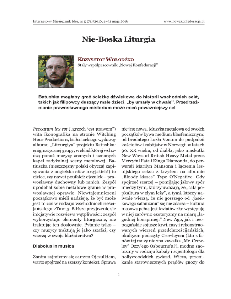 Internetowy Miesięcznik Idei, nr 5 (71)/2016, 4–31 maja 2016 www.nowakonfederacja.pl Nie-Boska Liturgia Krzysztof WołodźKo Stały współpracownik „Nowej Konfederacji” Batushka mogłaby grać ścieżkę dźwiękową do historii wschodnich sekt, takich jak filipowcy duszący małe dzieci, „by umarły w chwale”. Przedrzeźnianie prawosławnego misterium może mieć poważniejszy cel Peccatum lex est („grzech jest prawem”) wita ikonografika na stronie Witching Hour Productions, białostockiego wydawcy albumu „Litourgiya” projektu Batushka: enigmatycznej grupy, w skład której wchodzą ponoć muzycy znanych i uznanych kapel radykalnej sceny metalowej. Batiuszka (nieszczęsny polski obyczaj zapisywania z angielska słów rosyjskich!) to ojciec, czy nawet poufalej: ojczulek – prawosławny duchowny lub mnich. Zespół upodobał sobie metalowe granie w prawosławnej oprawie. Niewtajemniczeni początkowo mieli nadzieję, że być może jest to coś w rodzaju wschodniochrześcijańskiego 2Tm2,3. Bliższe przyjrzenie się inicjatywie rozwiewa wątpliwości: zespół wykorzystuje elementy liturgiczne, nie traktując ich dosłownie. Pytanie tylko – czy muzycy traktują je jako sztafaż, czy wierzą w swoje bluźnierstwa? nie jest nowa. Muzyka metalowa od swoich początków bywa medium blasfemicznym: od brodatego kozła Venom do podpaleń kościołów i zabójstw w Norwegii w latach 90. XX wieku, od diabła, jako maskotki New Wave of British Heavy Metal przez Mercyful Fate i Kinga Diamonda, do perwersji Marilyn Mansona i łączenia lesbijskiego seksu z krzyżem na albumie „Bloody kisses” Type O’Negative. Gdy spojrzeć szerzej – pomijając jałowy spór między tymi, którzy uważają, że „cała popkultura w złym leży”, a tymi, którzy naiwnie wierzą, że nic gorszego od „jasełkowego satanizmu” się nie zdarza – kultura masowa pełna jest kwiatów zła: występują w niej zarówno ezoteryzmy na miarę „łagodnej konspiracji” New Age, jak i neopogańskie sojusze krwi, rasy i rekonstruowanych wierzeń przedchrześcijańskich, okultyzm podszyty Crowleyem (kto z fanów tej muzy nie zna kawałka „Mr. Crowley” Ozzy’ego Osbourne’a?), modne snobizmy w rodzaju kabały i scjentologii dla hollywoodzkich gwiazd, Wicca, przenikanie starowiecznych prądów gnozy do Diabolus in musica Zanim zajmiemy się samym Ojczulkiem, warto spojrzeć na szerszy kontekst. Sprawa 1 Internetowy Miesięcznik Idei, nr 5 (71)/2016, 4–31 maja 2016 kasowego kina, satanizm jako eudajmonizm hedonistycznego materializmu, odrzucający „restryktywność” i „antywitalizm” chrześcijańskich norm etycznych, wreszcie satanizm, jako rzeczywisty kult i cześć dla upadłego anioła. Czasem te nieporządki perwersyjnie się mieszają, niekiedy przeczą własnym tożsamościom, choć równocześnie epatują symbolami, w których motywy odwróconych krzyży i pentagramów ukazują jeśli nie duchowość, to estetykę przekroczenia i przewartościowania tradycyjnego porządku dobra i zła, albo uznania prymatu zła nad dobrem. W przypadku black metalu możemy mówić o programowym zjawisku. Pomijam rzecz jasna kontrapunkt, czyli kompletną niszę – pochodzący ze Skandynawii chrześcijański black metal. Ale gdy czytamy na stronie wydawcy Batushki, WHP, informacje w rodzaju: „Po czterech latach od wydania »Nocturn« z nowym materiałem powraca CHRIST AGONY!”, dopełnione wzmianką, że nagrań dokonano w Studio666, to warto zapytać, co kryje się za tak przystrojonym w znaki i treści horyzontem? Jeśli kogoś uspokajają słowa, że to tylko sztafaż, to znaczy, że nic nie wie o tym, jak słowa i symbole kreują świat wyobrażeń społecznych, jak determinują sposoby przeżywania rzeczywistości w jej holistycznym ujęciu. www.nowakonfederacja.pl żeby odnieść się do tego, co w nowoczesności skierowane przeciw chrześcijaństwu, katolicyzmowi, ludziom, instytucji, wierze Kościoła. Teoretycznie są to języki, które spełniają swoje zadanie: ostrzegają, informują, tworzą linie demarkacyjne w uniwersum symbolicznym i społecznym. Z tym, że chrystofobia to przecież w swoim „fobicznym” dookreśleniu kalka z licznych języków poprawności politycznej, z ich zwyczajowym „subiektywizmem walczącym”, tyle że ze znakiem przeciwnie skierowanym. to fascynujące, że Białystok to równocześnie miasto projektu pokroju Batushka, która redefiniuje prawosławną tożsamość polskiego wschodu w duchu blasfemii i silnych wpływów radykalnego obozu narodowego Z kolei w sformułowaniu „obraza uczuć religijnych” brzmią dalekim echem teorie z końca wieku XIX i początku XX stulecia. To koncepcje z pogranicza ówczesnych nauk humanistycznych i protestanckiej teologii. Na gruncie filozofii religii i religioznawstwa jedną z lepiej znanych interpretacji sacrum, pojmowanego właśnie jako nieredukowalne do niczego głębokie i wymykające się racjonalności uczucie (mysterium tremendum et mysterium fascinans), przedstawiono w książce „Świętość. Elementy irracjonalne w pojęciu bóstwa i ich stosunek do elementów racjonalnych” Rudolfa Otto. Bluźnierstwo – czy obraza? W naszych czasach świecki język, nierzadko język doktryn przetłumaczonych na „katolicyzm po polsku”, łagodzi charakter sporów wokół wiary/religii, w tym tego, co odnosi się do zderzenia sacrum i blasfemii. Posługujemy się takimi terminami, jak „chrystofobia” czy nader szerokie określenie „obraza uczuć religijnych”, 2 Internetowy Miesięcznik Idei, nr 5 (71)/2016, 4–31 maja 2016 Określenia w rodzaju „chrystofobia” czy „obraza uczuć religijnych” po części spełniają swoje zadanie. A jednak bez nazwania bluźnierstwa wprost bluźnierstwem, czyli diabolicznym wyzwaniem rzuconym w twarz Bogu Jedynemu w Trójcy – pewne określenia łatwo się rozmywają i nie sięgają sedna rzeczy, a ujęcie problemów traci swoje katolickie „ratio” na rzecz hi