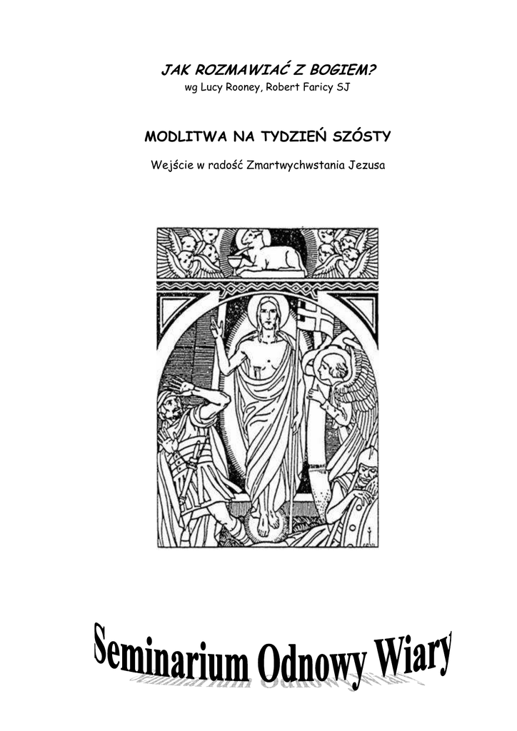 JAK ROZMAWIAĆ Z BOGIEM? wg Lucy Rooney, Robert Faricy SJ MODLITWA NA TYDZIEŃ SZÓSTY Wejście w radość Zmartwychwstania Jezusa Dzień pierwszy Modlitwa przed rozmyślaniem Boże, mój Ojcze! Ty jesteś światłem dla niewidomych. Odkryj przede mną tajemnicę Twego słowa. Duchu Święty, otwórz moje serce, bym poznał Jezusa, mocniej Go ukochał i gorliwiej naśladował. 1. BIERZ - CZYTAJ Przeczytaj ze zrozumieniem fragment Pisma Świętego: Łk 24, 1-12 2. UWAŻNIE ROZMYŚLAJ o tym co przeczytałeś, co może oznaczać to słowo, ale i sercem zasmakuj w tym, co cię szczególnie poruszyło; wszystko co rodzi się w twoim sercu zapisuj na drugiej stronie; pomocne punkty: „Nagle stanęło przed nimi dwóch mężczyzn w lśniących szatach. Przestraszone pochyliły twarze ku ziemi, lecz tamci rzekli do nich: «Dlaczego szukacie żyjącego wśród umarłych? Nie ma Go tutaj; zmartwychwstał. Przypomnijcie sobie jak wam mówił, będąc jeszcze w Galilei: Syn Człowieczy musi być wydany w ręce grzeszników i ukrzyżowany, lecz trzeciego dnia zmartwychwstanie” „I wróciły od grobu, oznajmiły to wszystko Jedenastu i wszystkim pozostałym” „Lecz słowa te wydały im się czczą gadaniną i nie dali im wiary” 3. ROZMAWIAJ Z BOGIEM o tym, co ci w sercu utkwiło, rozmawiaj z Nim jak z przyjacielem 4. WZNIEŚ SERCE SWOJE KU BOGU Odpocznij w Bogu, w pokornym i ufnym oddaniu się Jemu, uwielbiaj Go, a przepełniony miłością, raduj się Nim jak dziecko, gdy szuka i odnajduje matkę. Możesz posłużyć się tą modlitwą: Panie Jezu, powstałeś z martwych i jesteś tu przy mnie. Pozwól mi dzielić Twoją radość, uczyń mnie szczęśliwym, pociesz mnie. Daj mi Twoje pocieszenie. Wielbię Cię, Panie w Twoim Zmartwychwstaniu. Tobie chwała i moc i cześć. Amen. 5. IDŹ I CZYŃ Z tego spotkania zabierz to słowo, które Bóg skierował do Ciebie i żyj nim w codzienności. Nieś w sobie miłość, radość, pokój, a przez to będziesz świadczył o Bogu, gdziekolwiek się znajdziesz. Od czasu do czasu w ciągu dnia możesz zwrócić się do Boga: Tobie chwała i cześć Jezu!. Albo: Wesoły nam dzień dziś nastał lub refren jakiejś radosnej pieśni wielkanocnej Dzień drugi Modlitwa przed rozmyślaniem Boże, mój Ojcze! Ty jesteś światłem dla niewidomych. Odkryj przede mną tajemnicę Twego słowa. Duchu Święty, otwórz moje serce, bym poznał Jezusa, mocniej Go ukochał i gorliwiej naśladował. 1. BIERZ - CZYTAJ Przeczytaj ze zrozumieniem fragment Pisma Świętego: Łk 24, 13-29 2. UWAŻNIE ROZMYŚLAJ o tym co przeczytałeś, co może oznaczać to słowo, ale i sercem zasmakuj w tym, co cię szczególnie poruszyło; wszystko co rodzi się w twoim sercu zapisuj na drugiej stronie; pomocne punkty: „Gdy tak rozmawiali i rozprawiali z sobą, sam Jezus przybliżył się i szedł z nimi” „Na to On rzekł do nich: «O nierozumni, jak nieskore są wasze serca do wierzenia we wszystko, co powiedzieli prorocy! Czy Mesjasz nie miał tego cierpieć, aby wejść do swej chwały?» I zaczynając od Mojżesza poprzez wszystkich proroków wykładał im, co we wszystkich Pismach odnosiło się do Niego” „Lecz przymusili Go, mówiąc: «Zostań z nami, gdyż ma się ku wieczorowi i dzień się już nachylił». Wszedł więc aby zostać z nimi” 3. ROZMAWIAJ Z BOGIEM o tym, co ci w sercu utkwiło, rozmawiaj z Nim jak z przyjacielem 4. WZNIEŚ SERCE SWOJE KU BOGU Odpocznij w Bogu, w pokornym i ufnym oddaniu się Jemu, uwielbiaj Go, a przepełniony miłością, raduj się Nim jak dziecko, gdy szuka i odnajduje matkę. Możesz posłużyć się tą modlitwą: Panie Jezu, przybliżyłeś się do mnie i jesteś przy mnie teraz, na modlitwie. Objaw mi, Panie, znaczenie Pisma, znaczenie tego tekstu dla mnie, dla nas obojga - dla Ciebie i dla mnie. Panie Jezu, krocz zawsze przy mnie. Dozwól mi iść przy Tobie. Pozostań ze mną, Panie. Amen. IDŹ I CZYŃ Z tego spotkania zabierz to słowo, które Bóg skierował do Ciebie i żyj nim w codzienności. Nieś w sobie miłość, radość, pokój, a przez to będziesz świadczył o Bogu, gdziekolwiek się znajdziesz. Od czasu do czasu w ciągu dnia możesz zwrócić się do Boga: Pozostań ze mną Jezu. Dzień trzeci Modlitwa przed rozmyślaniem Boże, mój Ojcze! Ty jesteś światłem dla niewidomych. Odkryj przede mną tajemnicę Twego słowa. Duchu Święty, otwórz moje serce, bym poznał Jezusa, mocniej Go ukochał i gorliwiej naśladował. 1. BIERZ - CZYTAJ Przeczytaj ze zrozumieniem fragment Pisma Świętego: Łk 24, 30-35 2. UWAŻNIE ROZMYŚLAJ o tym co przeczytałeś, co może oznaczać to słowo, ale i sercem zasmakuj w tym, co cię szczególnie poruszyło; wszystko co rodzi się w twoim sercu zapisuj na drugiej stronie; pomocne punkty: „Gdy zajął z nimi miejsce u stołu, wziął chleb, odmówił błogosławieństwo, połamał go i dawał im. Wtedy oczy im się otworzyły i poznali Go” „I mówili nawzajem do siebie: «Czy serce nie pałało w nas, kiedy rozmawiał z nami w drodze i Pisma nam wyjaśniał?»” „Oni również opowiadali, co ich spotkało w drodze, i jak Go poznali przy łamaniu chleba” 3. ROZMAWIAJ Z BOGIEM o tym, co ci w sercu utkwiło, rozmawiaj z Nim jak z przyjacielem 4. WZNIEŚ SERCE SWOJE KU BOGU Odpocznij w Bogu, w pokornym i ufnym oddaniu się Jemu, uwielbiaj Go, a przepełniony miłością, raduj się Nim jak dziecko, gdy szuka i odnajduje matkę. Możesz posłużyć się tą modlitwą: Panie Jezu, powstałeś z martwych i jesteś teraz tutaj przy mnie. Zasiadasz ze mną ,,przy stole" mojej modlitwy. Objaw mi się. Daj mi się poznać. Spraw bym Cię lepiej poznał przez miłość, abym świadczył moim życiem, że Cię znam i prowadził innych do lepszego poznania Ciebie. Amen. 5. IDŹ I CZYŃ Z tego spotkania zabierz to słowo, które Bóg skierował do Ciebie i żyj nim w codzienności. Nieś w sobie miłość, radość, pokój, a przez to będziesz świadczył o Bogu, gdziekolwiek s