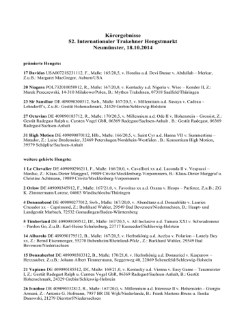 Körergebnisse 52. Internationaler Trakehner Hengstmarkt Neumünster, 18.10.2014 prämierte Hengste: 17 Davidas USA00721S231112, F., Maße: 165/20,5, v. Horalas a.d. Devi Danae v. Abdullah – Merkur, Z.u.B.: Margaret MacGregor, Auburn/USA 20 Niagara POL732010058912, R., Maße: 167/20,0, v. Kentucky a.d. Nigeria v. Wiec – Kondor II, Z.: Marek Przeczewski, 14-310 Milakowo/Polen, B.: Mythos Trakehnen, 07318 Saalfeld/Thüringen 23 Sir Sansibar DE 409090300512, Swb., Maße: 167/20,5, v. Millennium a.d. Susuya v. Cadeau – Lehndorff’s, Z.u.B.: Gestüt Hohenschmark, 24329 Grebin/Schleswig-Holstein 27 Octavian DE 409090185712, R., Maße: 170/20,5, v. Millennium a.d. Ode II v. Hohenstein – Grossist, Z.: Gestüt Radegast Ralph u. Carsten Vogel GbR, 06369 Radegast/Sachsen-Anhalt , B.: Gestüt Radegast, 06369 Radegast/Sachsen-Anhalt 31 High Motion DE 409090070112, Hlb., Maße: 166/20,5, v. Saint Cyr a.d. Hanna VII v. Summertime – Matador, Z.: Luise Bredemeier, 32469 Petershagen/Nordrhein-Westfalen , B.: Konsortium High Motion, 39579 Schäplitz/Sachsen-Anhalt weitere gekörte Hengste: 1 Le Chevalier DE 409090296211, F., Maße: 166/20,0, v. Cavallieri xx a.d. Laconda II v. Vespucci – Marduc, Z.: Klaus-Dieter Marggraf, 19089 Crivitz/Mecklenburg-Vorpommern, B.: Klaus-Dieter Marggraf u. Christine Achtmann, 19089 Crivitz/Mecklenburg-Vorpommern 2 Orlow DE 409090345912, F., Maße: 167/21,0, v. Favoritas xx a.d. Oxana v. Heops – Parforce, Z.u.B.: ZG K. Zimmermann/Lorenz, 04603 Windischleuba/Thüringen 4 Donauabend DE 409090277012, Swb., Maße: 167/20,0, v. Abendtanz a.d. Donaublüte v. Lauries Crusador xx – Caprimond, Z.: Burkhard Wahler, 29549 Bad Bevensen/Niedersachsen, B.: Haupt- und Landgestüt Marbach, 72532 Gomadingen/Baden-Württemberg 5 Timberland DE 409090189512, Df., Maße: 167/20,5, v. All Inclusive a.d. Tamara XXI v. Schwadroneur – Pardon Go, Z.u.B.: Karl-Heinz Schulenburg, 23717 Kasseedorf/Schleswig-Holstein 14 Albarolo DE 409090179512, B., Maße: 167/20,5, v. Herbstkönig a.d. Acelya v. Polarion – Lonely Boy xx, Z.: Bernd Eisenmenger, 55270 Bubenheim/Rheinland-Pfalz , Z.: Burkhard Wahler, 29549 Bad Bevensen/Niedersachsen 15 Donauherbst DE 409090383312, B., Maße: 170/21,0, v. Herbstkönig a.d. Donauried v. Kasparow – Herzzauber, Z.u.B.: Johann Albert Timmermann, Seggerweg 40, 22869 Schenefeld/Schleswig-Holstein 21 Vapiano DE 409090185512, Df., Maße: 169/21,0, v. Kentucky a.d. Vienna v. Easy Game – Tanzmeister I, Z.: Gestüt Radegast Ralph u. Carsten Vogel GbR, 06369 Radegast/Sachsen-Anhalt, B.: Gestüt Hohenschmark, 24329 Grebin/Schleswig-Holstein 26 Ivanhoe DE 409090332812, R., Maße: 167/20,0, v. Millennium a.d. Interesse II v. Hohenstein – Giorgio Armani, Z.: Antonie G. Hofmann, 7957 BR DE Wijk/Niederlande, B.: Frank Martens-Bruns u. Ilonka Danowski, 21279 Dierstorf/Niedersachsen 29 Sir Oliver DE 409090054012, B., Maße: 167/21,0, v. Oliver Twist a.d. Shakira v. Biotop – Königspark xx, Z.u.B.: Gestüt Heinen-Issum, 47661 Issum/Nordrhein-Westfalen 30 Greenwich Park DE 409090190412, R., Maße: 166/21,0, v. Saint Cyr a.d. Grace Note v. Alter Fritz – Kostolany, Z.u.B.: Bernhard Langels, 39579 Schäplitz/Sachsen-Anhalt 37 Tudor DE 409090180111, F., Maße: 168/21,0, v. Iskander a.d. Tugga v. Sixtus – Condus, Z.: Familie Gellhaar, 36396 Steinau/Hessen, B.: Konsortium Tudor, 39579 Schäplitz/Sachsen-Anhalt
