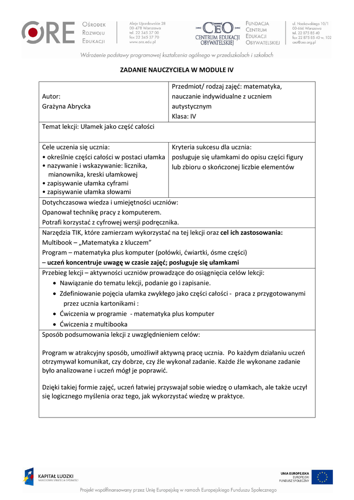 ZADANIE NAUCZYCIELA W MODULE IV Autor: Grażyna Abrycka Przedmiot/ rodzaj zajęć: matematyka, nauczanie indywidualne z uczniem autystycznym Klasa: IV Temat lekcji: Ułamek jako część całości Cele uczenia się ucznia: Kryteria sukcesu dla ucznia: • określnie części całości w postaci ułamka posługuje się ułamkami do opisu części figury • nazywanie i wskazywanie: licznika, lub zbioru o skończonej liczbie elementów mianownika, kreski ułamkowej • zapisywanie ułamka cyframi • zapisywanie ułamka słowami Dotychczasowa wiedza i umiejętności uczniów: Opanował technikę pracy z komputerem. Potrafi korzystać z cyfrowej wersji podręcznika. Narzędzia TIK, które zamierzam wykorzystać na tej lekcji oraz cel ich zastosowania: Multibook – „Matematyka z kluczem” Program – matematyka plus komputer (połówki, ćwiartki, ósme części) – uczeń koncentruje uwagę w czasie zajęć; posługuje się ułamkami Przebieg lekcji – aktywności uczniów prowadzące do osiągnięcia celów lekcji: Nawiązanie do tematu lekcji, podanie go i zapisanie. Zdefiniowanie pojęcia ułamka zwykłego jako części całości - praca z przygotowanymi przez ucznia kartonikami : Ćwiczenia w programie - matematyka plus komputer Ćwiczenia z multibooka Sposób podsumowania lekcji z uwzględnieniem celów: Program w atrakcyjny sposób, umożliwił aktywną pracę ucznia. Po każdym działaniu uczeń otrzymywał komunikat, czy dobrze, czy źle wykonał zadanie. Każde źle wykonane zadanie było analizowane i uczeń mógł je poprawić. Dzięki takiej formie zajęć, uczeń łatwiej przyswajał sobie wiedzę o ułamkach, ale także uczył się logicznego myślenia oraz tego, jak wykorzystać wiedzę w praktyce.