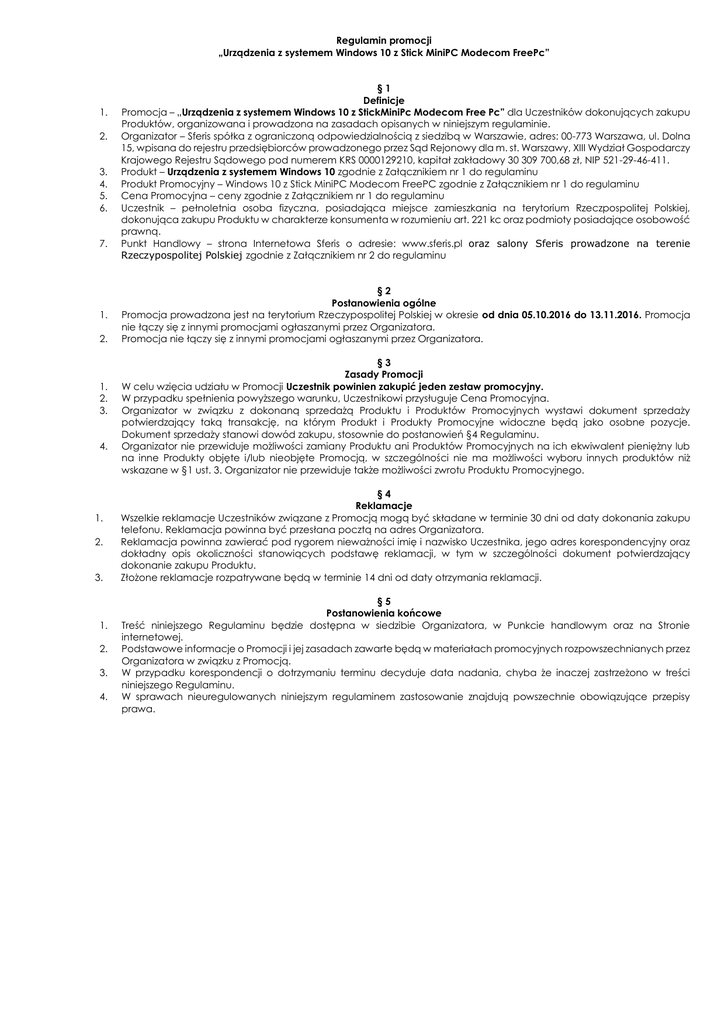 Regulamin promocji „Urządzenia z systemem Windows 10 z Stick MiniPC Modecom FreePc” 1. 2. 3. 4. 5. 6. 7. 1. 2. 1. 2. 3. 4. 1. 2. 3. 1. 2. 3. 4. §1 Definicje Promocja – „Urządzenia z systemem Windows 10 z StickMiniPc Modecom Free Pc” dla Uczestników dokonujących zakupu Produktów, organizowana i prowadzona na zasadach opisanych w niniejszym regulaminie. Organizator – Sferis spółka z ograniczoną odpowiedzialnością z siedzibą w Warszawie, adres: 00-773 Warszawa, ul. Dolna 15, wpisana do rejestru przedsiębiorców prowadzonego przez Sąd Rejonowy dla m. st. Warszawy, XIII Wydział Gospodarczy Krajowego Rejestru Sądowego pod numerem KRS 0000129210, kapitał zakładowy 30 309 700,68 zł, NIP 521-29-46-411. Produkt – Urządzenia z systemem Windows 10 zgodnie z Załącznikiem nr 1 do regulaminu Produkt Promocyjny – Windows 10 z Stick MiniPC Modecom FreePC zgodnie z Załącznikiem nr 1 do regulaminu Cena Promocyjna – ceny zgodnie z Załącznikiem nr 1 do regulaminu Uczestnik – pełnoletnia osoba fizyczna, posiadająca miejsce zamieszkania na terytorium Rzeczpospolitej Polskiej, dokonująca zakupu Produktu w charakterze konsumenta w rozumieniu art. 221 kc oraz podmioty posiadające osobowość prawną. Punkt Handlowy – strona Internetowa Sferis o adresie: www.sferis.pl oraz salony Sferis prowadzone na terenie Rzeczypospolitej Polskiej zgodnie z Załącznikiem nr 2 do regulaminu §2 Postanowienia ogólne Promocja prowadzona jest na terytorium Rzeczypospolitej Polskiej w okresie od dnia 05.10.2016 do 13.11.2016. Promocja nie łączy się z innymi promocjami ogłaszanymi przez Organizatora. Promocja nie łączy się z innymi promocjami ogłaszanymi przez Organizatora. §3 Zasady Promocji W celu wzięcia udziału w Promocji Uczestnik powinien zakupić jeden zestaw promocyjny. W przypadku spełnienia powyższego warunku, Uczestnikowi przysługuje Cena Promocyjna. Organizator w związku z dokonaną sprzedażą Produktu i Produktów Promocyjnych wystawi dokument sprzedaży potwierdzający taką transakcję, na którym Produkt i Produkty Promocyjne widoczne będą jako osobne pozycje. Dokument sprzedaży stanowi dowód zakupu, stosownie do postanowień §4 Regulaminu. Organizator nie przewiduje możliwości zamiany Produktu ani Produktów Promocyjnych na ich ekwiwalent pieniężny lub na inne Produkty objęte i/lub nieobjęte Promocją, w szczególności nie ma możliwości wyboru innych produktów niż wskazane w §1 ust. 3. Organizator nie przewiduje także możliwości zwrotu Produktu Promocyjnego. §4 Reklamacje Wszelkie reklamacje Uczestników związane z Promocją mogą być składane w terminie 30 dni od daty dokonania zakupu telefonu. Reklamacja powinna być przesłana pocztą na adres Organizatora. Reklamacja powinna zawierać pod rygorem nieważności imię i nazwisko Uczestnika, jego adres korespondencyjny oraz dokładny opis okoliczności stanowiących podstawę reklamacji, w tym w szczególności dokument potwierdzający dokonanie zakupu Produktu. Złożone reklamacje rozpatrywane będą w terminie 14 dni od daty otrzymania reklamacji. §5 Postanowienia końcowe Treść niniejszego Regulaminu będzie dostępna w siedzibie Organizatora, w Punkcie handlowym oraz na Stronie internetowej. Podstawowe informacje o Promocji i jej zasadach zawarte będą w materiałach promocyjnych rozpowszechnianych przez Organizatora w związku z Promocją. W przypadku korespondencji o dotrzymaniu terminu decyduje data nadania, chyba że inaczej zastrzeżono w treści niniejszego Regulaminu. W sprawach nieuregulowanych niniejszym regulaminem zastosowanie znajdują powszechnie obowiązujące przepisy prawa. Załącznik nr 1 – lista Produktów i Produktów Promocyjnych Produkt Nazwa Cena promocyjna brutto Tablet LENOVO MIIX 700 80QL00HPPB M56Y54/12WQHD/8GB/256GB/HD515/USB3.0/uHDMI/BT/Win10 Pro" 4900 Tablet LENOVO MIIX 700 80QL00J0PB M76Y75/12WQHD/8GB/256GB/HD515/USB3.0/uHDMI/BT/Win10 Pro" 5800 Tablet LENOVO MIIX 700 80QL00H0PB M56Y54/12WQHD/4GB/128GB/HD515/USB3.0/uHDMI/BT/Win10 Pro" 4100 2w1 Dell Inspiron 11 3158 i3-6100U/11,6/4GB/500GB/NoODD/Win10 2400 - Złoty 2w1 Dell Inspiron 11 3158 i3-6100U/11,6/4GB/500GB/NoODD/Win10 2400 - Czerwony 2w1 Lenovo Yoga 700 i7-6500U/14/8GB/500GB/GT940M_2gb/Win10 3380 - Biały 2w1 Lenovo Yoga 700 i7-6500U/14/8GB/500GB/GT940M_2gb/Win10 3380 - Czarny 2w1 Lenovo Yoga 700 i5-6200U/14/4GB/500GB/GT940M_2gb/Win10 2920 - Biały 2w1 Lenovo Yoga 700 i5-6200U/14/4GB/500GB/GT940M_2gb/Win10 2920 - Srebrny 2w1 Lenovo Yoga 700 i5-6200U/14/4GB/500GB/GT940M_2gb/Win10 2920 - Czarny 2W1 Lenovo YOGA 500-14 I3-5005U/14FHD/4GB/1TB/INT/WIN10 Biały 2350 2W1 Lenovo YOGA 500-14 i76500u/14FHD/8GB/1TB/GT940m/WIN10 - Biały 3100 2W1 Lenovo YOGA 500-14 i76500u/14FHD/8GB/1TB/GT940m/WIN10 - Czerwony 3100 2w1 Lenovo YOGA 900 i7-6500U/13,3/8GB/SSD512/INT/Win10 Szampańska 5100 2w1 Lenovo YOGA 900 i7-6500U/13,3/8GB/SSD512/INT/Win10 Pomarańczowa 5100 2w1 Lenovo YOGA 900 i7-6500U/13,3/8GB/SSD512/INT/Win10 Srebrny 5100 2w1 Lenovo YOGA 900 i5-6200U/13,3/8GB/SSD512/INT/Win10 Pomarańczowy 4900 2w1 Lenovo YOGA 900 i5-6200U/13,3/8GB/SSD512/INT/Win10 Srebrna 4900 2w1 Lenovo YOGA 900 i5-6200U/13,3/8GB/SSD512/INT/Win10 Szampańska 4900 2w1 Lenovo Yoga 700 i76500U/14/8GB/SSD256/GT940M_2gb/Win10 - Pomarańczowy 3700 2w1 Lenovo Yoga 700 i76500U/14/8GB/SSD256/GT940M_2gb/Win10 - Srebrny 3700 2w1 Lenovo Yoga 700 i76500U/14/8GB/SSD256/GT940M_2gb/Win10 - Czarny 3700 2w1 Lenovo Yoga 700 i76500U/14/8GB/SSD256/GT940M_2gb/Win10 - Biały 3700 Laptop DELL Inspiron 7559-8705 i56300HQ/15,6FHD/8GB/1TB/GTX960m/NoODD/NoOS 3799 Tablet LENOVO MIIX 700 80QL00HPPB M56Y54/12WQHD/8GB/256GB/HD515/USB3.0/uHDMI/BT/Win10 Pro" 4900 Produkt Promocyjny Nazwa Cena promocyjna brutto Komputer MiniPC Modecom FreePc Portable Windows Stick 32 GB G1 Windows 10 99,00 zł Załacznik nr 2 – Lista salonów stacjonarnych Sferis Salon Centrum handlowe Adres Kod Bielsko-Biała CH Auchan Bohaterów Monte Casino 421 42-382 Białystok C