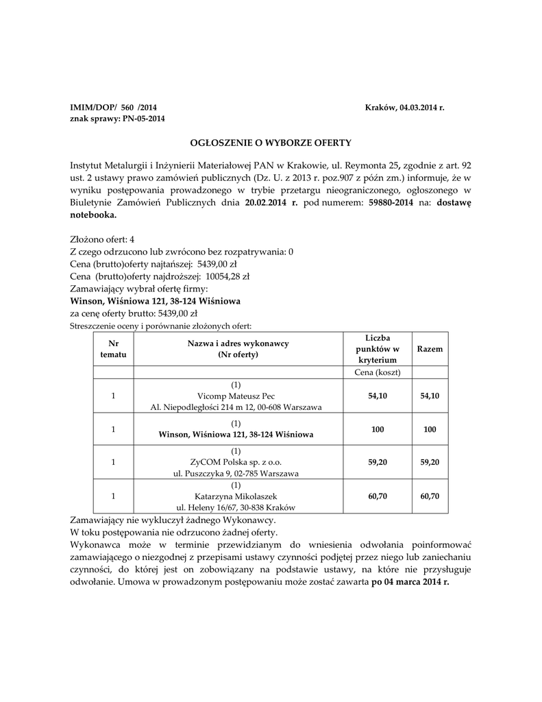 IMIM/DOP/ 560 /2014 znak sprawy: PN-05-2014 Kraków, 04.03.2014 r. OGŁOSZENIE O WYBORZE OFERTY Instytut Metalurgii i Inżynierii Materiałowej PAN w Krakowie, ul. Reymonta 25, zgodnie z art. 92 ust. 2 ustawy prawo zamówień publicznych (Dz. U. z 2013 r. poz.907 z późn zm.) informuje, że w wyniku postępowania prowadzonego w trybie przetargu nieograniczonego, ogłoszonego w Biuletynie Zamówień Publicznych dnia 20.02.2014 r. pod numerem: 59880-2014 na: dostawę notebooka. Złożono ofert: 4 Z czego odrzucono lub zwrócono bez rozpatrywania: 0 Cena (brutto)oferty najtańszej: 5439,00 zł Cena (brutto)oferty najdroższej: 10054,28 zł Zamawiający wybrał ofertę firmy: Winson, Wiśniowa 121, 38-124 Wiśniowa za cenę oferty brutto: 5439,00 zł Streszczenie oceny i porównanie złożonych ofert: Liczba punktów w kryterium Cena (koszt) Nr tematu Nazwa i adres wykonawcy (Nr oferty) 1 (1) Vicomp Mateusz Pec Al. Niepodległości 214 m 12, 00-608 Warszawa 54,10 54,10 1 (1) Winson, Wiśniowa 121, 38-124 Wiśniowa 100 100 59,20 59,20 60,70 60,70 1 1 (1) ZyCOM Polska sp. z o.o. ul. Puszczyka 9, 02-785 Warszawa (1) Katarzyna Mikolaszek ul. Heleny 16/67, 30-838 Kraków Razem Zamawiający nie wykluczył żadnego Wykonawcy. W toku postępowania nie odrzucono żadnej oferty. Wykonawca może w terminie przewidzianym do wniesienia odwołania poinformować zamawiającego o niezgodnej z przepisami ustawy czynności podjętej przez niego lub zaniechaniu czynności, do której jest on zobowiązany na podstawie ustawy, na które nie przysługuje odwołanie. Umowa w prowadzonym postępowaniu może zostać zawarta po 04 marca 2014 r.
