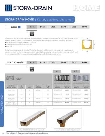 HOME STORA-DRAIN HOME | Kanały z polimerobetonu A15 HOME B125 C250 D400 E600 F900 Najnowszy system odwadniania przydomowych powierzchni dla pieszych STORA-HOME łączy lekkość, praktyczność zastosowania oraz nowoczesny wygląd. W skład systemu wchodzą: • kanał standardowy lub kanał z króćcem • ścianka czołowa z króćcem lub bez • osadnik Dodatkowo dostępne są kanały 0,5m standardowy lub krzyżowy (do połączeń krzyżowych). Uzupełnieniem systemu są wycieraczki, wpust podwórzowy, który stosuje się w ogrodach pod krany oraz osadniki rynnowe do odprowadzania wody deszczowej z rynny. KORYTKO + RUSZT A15 B125 C250 D400 E600 B H D F900 A15 A15 LIGHT 100 KORYTKO + RUSZT STORA-DRAIN HOME zamocowanie na zatrzask ruszt ocynkowany szcz. 10mm LIGHT 100 B=100 D=120 L (mb) H (mm) Wyjście pionowe Waga (kg) Numer artykułu Cena netto zł/szt. Numer artykułu Cena netto zł/szt. Kanał 1,0m 1 90 ∅ 100 7,0 SE10091100S 84,00 SE10091102S 88,00 kanał 0,5m standard 0,5 90 - 3,7 SE10095101S 55,00 SE10095103S 57,00 kanał 0,5m krzyżowy 0,5 90 ∅ 110 3,9 SE10095101U 59,00 SE10095103U 61,00 kanał 1,0m z króćcem ∅ 110 1 90 ∅ 110 7,5 SE10091100P 115,00 SE10091102P 119,00 * w jednym opakowaniu połowa ilości kanałów posiada możliwość wybicia otworu w dnie kanał HOME B=100 H=90 standard 4 zamocowanie na zatrzask ruszt ocynkowany szcz. 6mm Stora-Drain | Odwodnienia liniowe z polimerobetonu kanał HOME B=100 H=90 z króćcem HOME OSADNIK PIASKU Typ L (mb) H (mm) Waga (kg) Wyjście Numer artykułu Cena netto zł/szt. B=100 0,5 250 13,1 ∅ 110 AU10011101 350,00 Osadnik + kuweta + ruszt ocynk ŚCIANKI CZOŁOWE Typ Wysokość (mm) Waga (kg) Wbudowane wyjście Numer artykułu Cena netto zł/szt. 100 90 0,6 - AE10072000 15,00 100 90 0,8 ∅ 110 AE10082000 27,00 Ścianka czołowa bez wyjścia Ścianka czołowa z króćcem TYP Średnica Do korytka Numer artykułu Cena netto zł/szt. Dwuczęściowe zasyfonowanie pionowe ∅ 110 B=100 AS10400000 36,00 TYP Kolor Pojemność (masa) Numer artykułu Cena netto zł/szt. Poliuretanowy klej do uszczelnienia połączeń biały 310 ml PUP0000310 56,00 USZCZELNIACZ Stora-Drain | Odwodnienia liniowe z polimerobetonu STORA-DRAIN HOME SYFON 5 HOME WYCIERACZKI Wycieraczka z rusztem ocynkowanym kratowym Waga (kg) Numer artykułu Cena netto zł/szt. rozmiar 60x40cm 26,0 SW60400802 390,00 rozmiar 75x50cm 28,0 SW75500803 590,00 Wycieraczka z rusztem kratowym Wycieraczka z rusztem ocynkowanym siatkowym Waga (kg) Numer artykułu Cena netto zł/szt. rozmiar 75x50cm 18,2 SW75500801 550,00 Wycieraczka z rusztem siatkowym WPUST PODWÓRZOWY Waga (kg) Wysokość (cm) Numer artykułu Cena netto zł/szt. rozmiar 27x27cm 16,0 36,7 SG25251711 540,00 STORA-DRAIN HOME Wpust podwórzowy Wpust podwórzowy 6 Kuweta ocynkowana Stora-Drain | Odwodnienia liniowe z polimerobetonu HOME OSADNIKI RYNNOWE Wymiar A długość Wymiar B wysokość Wymiar C szerokość Średnica rury wejściowej Średnica rury wyjściowej Materiał Opakowanie zbiorcze Cena netto zł/szt. 325 mm 259 mm 160 mm 50-125 mm 110/125 mm PP z UV; ABS 6 szt./ kolor 47,00 brązowy 1 Korpus osadnika rynnowego 2 Pokrywa osadnika rynnowego 3 Pokrywa rewizyjna osadnika rynnowego 4 Klapka osadnika rynnowego ABS 5 Koszyczek osadnika rynnowego 6 Zaczep osadnika rynnowego 7 Krążek/pokrywa osadnika rynnowego 8 Rączka osadnika rynnowego szary STORA-DRAIN HOME czarny *sprzedaż w opakowaniach zbiorczych 6 szt./jednego koloru Stora-Drain | Odwodnienia liniowe z polimerobetonu 7
