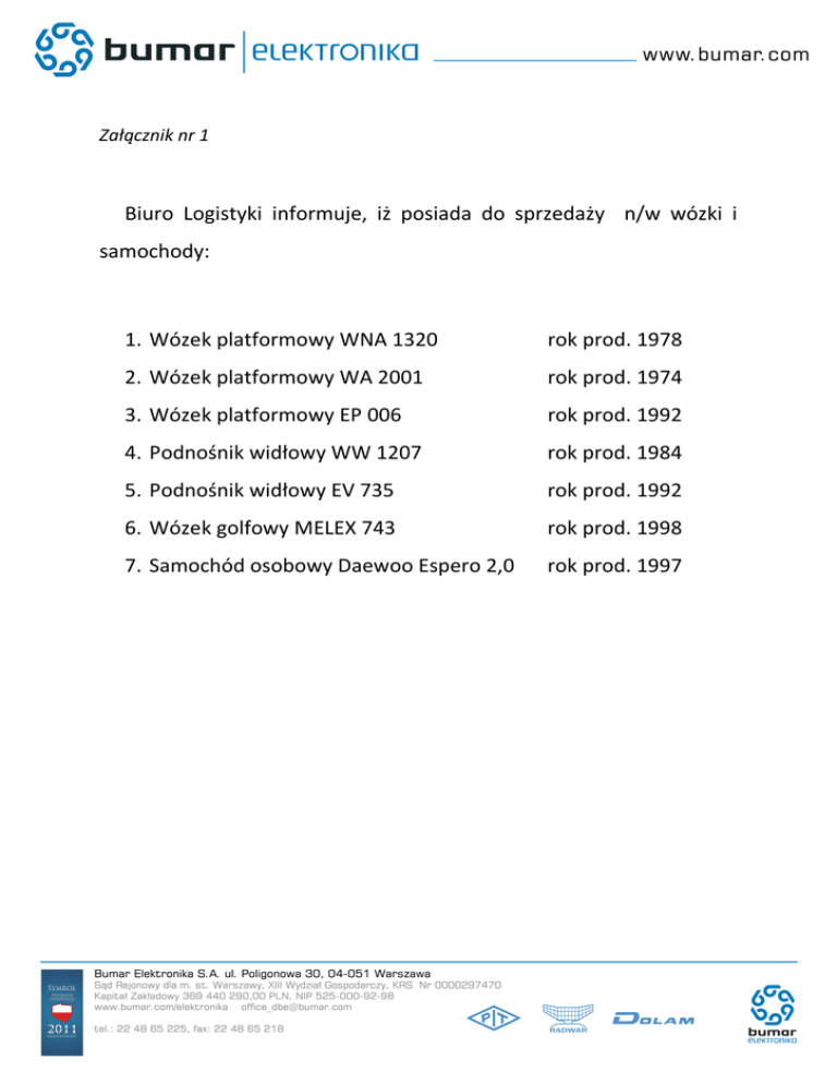 Załącznik nr 1 Biuro Logistyki informuje, iż posiada do sprzedaży n/w wózki i samochody: 1. Wózek platformowy WNA 1320 rok prod. 1978 2. Wózek platformowy WA 2001 rok prod. 1974 3. Wózek platformowy EP 006 rok prod. 1992 4. Podnośnik widłowy WW 1207 rok prod. 1984 5. Podnośnik widłowy EV 735 rok prod. 1992 6. Wózek golfowy MELEX 743 rok prod. 1998 7. Samochód osobowy Daewoo Espero 2,0 rok prod. 1997