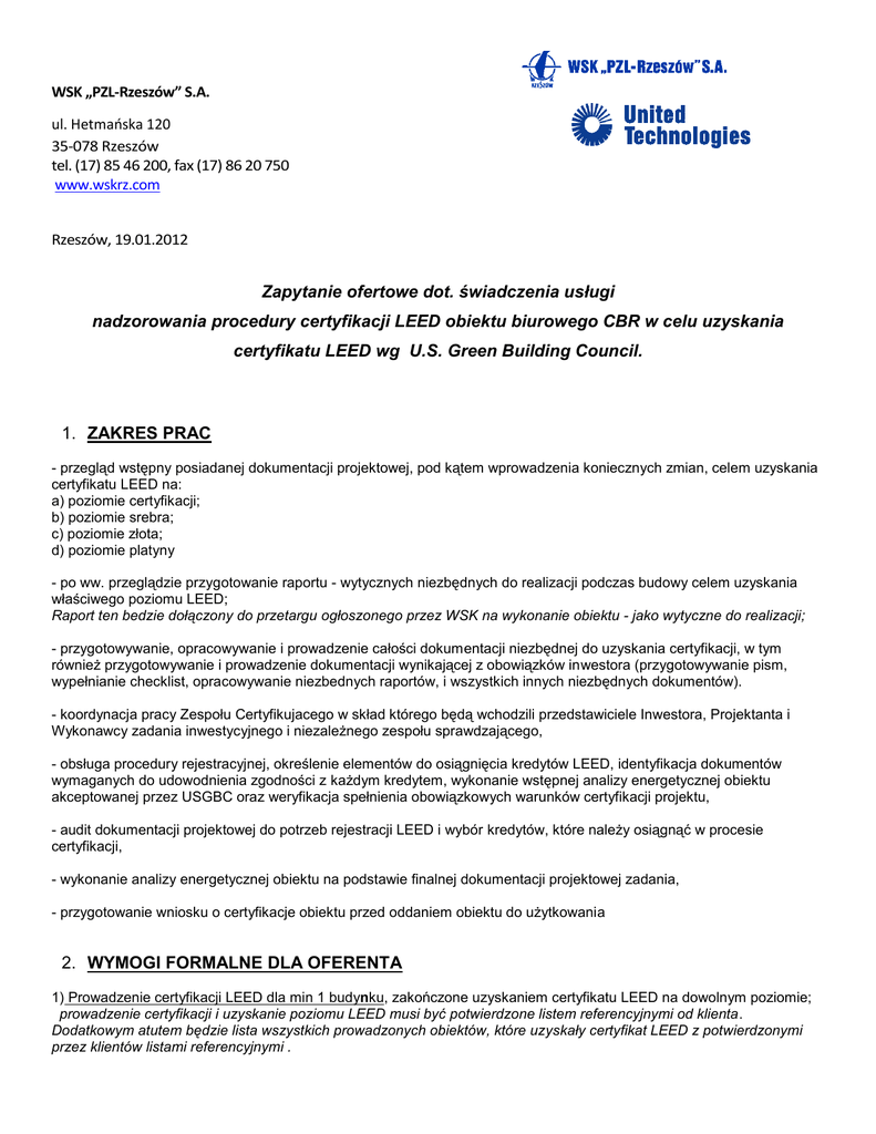 WSK „PZL-Rzeszów” S.A. ul. Hetmańska 120 35-078 Rzeszów tel. (17) 85 46 200, fax (17) 86 20 750 www.wskrz.com Rzeszów, 19.01.2012 Zapytanie ofertowe dot. świadczenia usługi nadzorowania procedury certyfikacji LEED obiektu biurowego CBR w celu uzyskania certyfikatu LEED wg U.S. Green Building Council. 1. ZAKRES PRAC - przegląd wstępny posiadanej dokumentacji projektowej, pod kątem wprowadzenia koniecznych zmian, celem uzyskania certyfikatu LEED na: a) poziomie certyfikacji; b) poziomie srebra; c) poziomie złota; d) poziomie platyny - po ww. przeglądzie przygotowanie raportu - wytycznych niezbędnych do realizacji podczas budowy celem uzyskania właściwego poziomu LEED; Raport ten bedzie dołączony do przetargu ogłoszonego przez WSK na wykonanie obiektu - jako wytyczne do realizacji; - przygotowywanie, opracowywanie i prowadzenie całości dokumentacji niezbędnej do uzyskania certyfikacji, w tym również przygotowywanie i prowadzenie dokumentacji wynikającej z obowiązków inwestora (przygotowywanie pism, wypełnianie checklist, opracowywanie niezbednych raportów, i wszystkich innych niezbędnych dokumentów). - koordynacja pracy Zespołu Certyfikujacego w skład którego będą wchodzili przedstawiciele Inwestora, Projektanta i Wykonawcy zadania inwestycyjnego i niezależnego zespołu sprawdzającego, - obsługa procedury rejestracyjnej, określenie elementów do osiągnięcia kredytów LEED, identyfikacja dokumentów wymaganych do udowodnienia zgodności z każdym kredytem, wykonanie wstępnej analizy energetycznej obiektu akceptowanej przez USGBC oraz weryfikacja spełnienia obowiązkowych warunków certyfikacji projektu, - audit dokumentacji projektowej do potrzeb rejestracji LEED i wybór kredytów, które należy osiągnąć w procesie certyfikacji, - wykonanie analizy energetycznej obiektu na podstawie finalnej dokumentacji projektowej zadania, - przygotowanie wniosku o certyfikacje obiektu przed oddaniem obiektu do użytkowania 2. WYMOGI FORMALNE DLA OFERENTA 1) Prowadzenie certyfikacji LEED dla min 1 budynku, zakończone uzyskaniem certyfikatu LEED na dowolnym poziomie; prowadzenie certyfikacji i uzyskanie poziomu LEED musi być potwierdzone listem referencyjnymi od klienta. Dodatkowym atutem będzie lista wszystkich prowadzonych obiektów, które uzyskały certyfikat LEED z potwierdzonymi przez klientów listami referencyjnymi . 2) Zatrudnienie certyfikowanego konsultanta LEED Wymagane kwalifikacje potwierdzone kopią (skan) certyfikatu 3) Plan prowadzenia certyfikacji LEED dla budowanego przez WSK obiektu biurowego CBR, Plan powinien zawierać podział na etapy: - niezbędnych prac do wykonania z zakresie rejestracji, prowadzenia budowy, weryfikacji wymogów LEED, itp. - niezbędnych dokumentów do opracowania ( z czasookresem), z podziałem na role dla certyfikowanego konsultanta, firmy prowadzącej LEED, Wykonawcy budowlanego i Inwestora (przygotowywanie wszystkich dokumentów dla inwestora po stronie firmy prowadzącej certyfikację). 3. SKRÓCONY OPIS INWESTYCJI 1. Przedmiot zadania: realizacja inwestycji pod nazwą „Budowa Centrum Badawczo Rozwojowego Napędów Lotniczych / Budowa budynku biurowego wraz z niezbędną infrastrukturą biura konstrukcyjnego Centrum Badawczo Rozwojowego na terenie WSK „PZL- Rzeszów S.A w Rzeszowie” 2. Zakres zamierzenia inwestycyjnego W zakres zamierzenia inwestycyjnego wchodzi: realizacja nowego obiektu biurowego biura konstrukcyjnego CBR wraz z niezbędną infrastrukturą na terenie WSK „PZL - Rzeszów S.A. w Rzeszowie realizacja zagospodarowania terenu oraz elementów małej architektury w granicach opracowania zgodnie z rysunkiem projektu zagospodarowania terenu nr 09-21A-BA-PZT-01 (załącznik dostępny po podpisaniu umowy NDA) wykonanie częściowej przebudowy istniejących dróg, budowa parkingu w tylnej części założenia, budowa chodników wokół obiektu. przebudowa i budowa nowych odcinków sieci infrastrukturalnych projektowane obiekty i ich rozmieszczenie przedstawiono na rysunku projektu zagospodarowania terenu nr 09-21ABA-PZT-01 ((załącznik dostępny po podpisaniu umowy NDA) Przewidywane roboty budowlane związane z projektowanym obiektem: a) prace terenowe - budowa dróg wewnętrznych oraz parkingu dla samochodów osobowych (nawierzchnia kostka betonowa). - budowa chodników (nawierzchnia kostka betonowa) - ukształtowanie terenu związane z budową nowego budynku i obiektów towarzyszących oraz prowadzonymi drogami wewnętrznymi. - budowa pochylni zewnętrznej dla niepełnosprawnych - budowa małej architektury – ławki, śmietniki, lampy, stojaki na rowery - budowa sieci i przyłączy oraz budowa obiektów infrastruktury technicznej: kanalizacji deszczowej, kanalizacji sanitarnej, c.o., wody zimnej, elektroenergetyczne SN i NN, b) budowlano - konstrukcyjne fundamentowanie stawianie słupów i trzpieni żelbetowych budynku właściwego roboty murarskie montaż stropów i stropodachów posadzki ogólne stawianie ścianek w systemie suchej zabudowy montaż stolarki drzwiowej i okiennej montaż fasad aluminiowych montaż klap dymowych budowa szybu windowego i montaż windy roboty ociepleniowe roboty wykończeniowe c) instalacyjne instalacja c.o. instalacja ciepła grzewczego z grzejnikami płytowymi instalacja ciepła grzewczego z klimakonwektorami instalacja ciepła wentylacyjnego węzeł cieplny instalacja wody zimnej w projektowanym budynku instalacja ppoż. instalacja wody ciepłej w projektowanym budynku instalacja kanalizacji sanitarnej instalacja kanalizacji deszczowej poprzez podciśnieniowy system odwodnienia dachu instalacje wentylacji mechanicznej nawiewno-wywiewnej i klimatyzacji, instalacje wentylacji wywiewnej, urządzenia chłodzące i grzewcze instalacji wodnych systemu 4-rurowego, urządzenia dla chłodzenia wody dla klimatyzacji i instalacji chłodniczej serwerowni, indywidualne urządzenia klimatyzacyjne systemu SPLIT. Instalacja tryskaczowa - sieć rurociągów wraz z uzbro