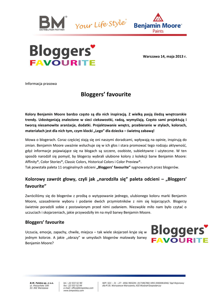 Warszawa 14, maja 2013 r. Informacja prasowa Bloggers’ favourite Kolory Benjamin Moore bardzo często są dla nich inspiracją. Z wielką pasją śledzą wnętrzarskie trendy. Udostępniają znalezione w sieci ciekawostki, radzą, wymyślają. Często sami projektują i tworzą niesamowite aranżacje, dodatki. Projektowanie wnętrz, przebieranie w stylach, kolorach, materiałach jest dla nich tym, czym klocki „Lego” dla dziecka – świetną zabawą! Mowa o blogerach. Coraz częściej stają się oni naszymi doradcami, wpływają na opinie, inspirują do zmian. Benjamin Moore uważnie wsłuchuje się w ich głos i stara promować tego rodzaju aktywność, gdyż informacje pojawiające się na blogach są szczere, osobiste, subiektywne i użyteczne. W ten sposób narodził się pomysł, by blogerzy wybrali ulubione kolory z kolekcji barw Benjamin Moore: Affinity®, Color Stories®, Classic Colors, Historical Colors i Color Preview®. Tak powstała paleta 11 oryginalnych odcieni „Bloggers’ favourite” sygnowanych przez blogerów. Kolorowy zawrót głowy, czyli jak „narodziła się” paleta odcieni – „Bloggers’ favourite” Zwróciliśmy się do blogerów z prośbą o wytypowanie jednego, ulubionego koloru marki Benjamin Moore, uzasadnienie wyboru i podanie dwóch przymiotników z nim się kojarzących. Blogerzy świetnie poradzili sobie z postawionym przed nimi zadaniem. Niezwykle miło nam było czytać o uczuciach i skojarzeniach, jakie przywodziły im na myśl barwy Benjamin Moore. Bloggers’ favourite Uczucia, emocje, zapachy, chwile, miejsca – tak wiele skojarzeń kryje się w jednym kolorze. A jakie „obrazy” w umysłach blogerów malowały barwy Benjamin Moore? LIGHT PISTACHIO 2034-60 - smakowity, vintage „To jasny, pastelowy odcień zieleni, pięknie komponujący się z szarościami, beżami, czekoladowym brązem, ale też z bielą i truskawkową czerwienią. Z jednej strony kojarzy się ze słodkościami: paryskimi makaronikami i włoskimi lodami pistacjowymi; z drugiej z retro sprzętem AGD-lodówkami i mikserami, czy też z motoryzacyjnymi hitami lat pięćdziesiątych takimi, jak kultowe "ogórki", garbusy i skutery. – blog www.summerhousekalinki.blogspot.com EBONY SLATE 2118-30 - wyrafinowany, niepokojący „Wybrałam ten kolor za jego głębię - kojarzy mi się z niezbadaną przestrzenią, jest równie niedopowiedziany i tajemniczy jak kosmiczna otchłań. Urzekło mnie także to, że nie jest jednoznaczny, gra światła wydobywa z niego najróżniejsze tony, a zastosowany na jednej ścianie genialnie powiększy przestrzeń. „Ebony Stale” widziałabym albo w klasycznych wnętrzach, jako tło do wydobycia urody unikalnych obiektów, albo we wnętrzu nowoczesnym, na dużej płaszczyźnie - w roli samowystarczalnego minimalistycznego obrazu”. – blog www.wmaju2.blogspot.com PALE IRIS 2073-60 - pozytywny, energetyczny „Jako mama zwracam uwagę by kolory w bezpośrednim otoczeniu mojego dziecka były radosne, a jednocześnie stonowane. Pastelowy "Pale Iris" to mój faworyt – przywodzi na myśl powiew wiosny przez cały rok.” – blog www.parentingowy.com Blog prowadzony przez 2 blogerki – www.mood-board.pl CLOUD WHITE – 967 - niezawodny, uniwersalny „Wspaniale zestawia się z zarówno ciepłą, jak i chłodną gamą błękitów i metalicznych szarości.” SANDY HOOK GRAY - HC-108 - klasyczny, ciepły „Odcień szarości z elementami barw ziemi, działa kojąco we wnętrzu i fantastycznie sprawdza się w stylowych salonach.” SPRINGTIME PEACH 2014-50 – apetyczny i soczysty „Kojarzy się z latem, zachodem słońca czy ulubionymi tropikalnymi owocami. Ze wszystkim co dostarcza nam energii, ciepła czy promieni słońca. Jako akcent, wystarczy tylko jedna ściana, w ponurym wnętrzu, od razu ożywia nasze otoczenie. Idealny wybór na szybką, letnią metamorfozę, pochłoniętego zimą pokoju :) dzięki temu, lato zagości w naszych czterech kątach szybciej i na dłużej:) - blog www.apetycznewnetrze.blogspot.com METROPOLITAN AF-690 – szlachetny, naturalny „To kolor delikatnej płowej szarości, który jest dla mnie jednym z piękniejszych kolorów z palety Affinity®. Wnętrza, w których ściany pomalowane są w odcieniu „Metropolitan AF-690” tworzą wyciszoną, stonowaną a zarazem szlachetną bazę, na której można budować zarówno aranżacje w klasycznym stylu, stylu vintage ale też stylu nowoczesnym. Wspaniałym uzupełnieniem tego koloru stają się zarówno meble z jasnego drewna, często spotykane we wnętrzach skandynawskich, ale też np. ciemne orzechowe drewno, czy też dąb palony. Subtelność tego koloru daje nam wiele możliwości stylistycznych oraz ułatwia tworzenie harmonijnych przestrzeni uzupełnionych innymi barwami i fakturami.” – blog www.stylistawnetrz.pl SPRING LEAF 2030-40 - delikatny, spokojny „Gdy przez dłuższą chwilę wpatrywałam się w odcień „Spring leaf” to wyobraziłam sobie wiosenny, słoneczny dzień, budzącą się do życia przyrodę, łąkę pełną kwiatów, delikatny powiew wiatru, wolność, lekkość, ale także i energię do działania. To właśnie widzę w tym kolorze i tymi słowami mogłabym uzasadnić swój wybór.” – blog www.szafa-artystyczna.pl HEATHER GRAY 2139-40 - spokój, przestrzeń „Kolor ten jest moim zdaniem bardzo szlachetny, pełen elegancji, jest zaproszeniem do wielu ciekawych historii kolorystycznych.” - blog www.portretwnetrza.blogspot.com COOL MINT 582 - elegancki, odświeżający „Pięknie się sprawdza we wnętrzach zarówno nowoczesnych jak i vintage, więc określiłabym go jako elegancki, odświeżający i vintage!” – blog www.conchitahome.blogspot.com DOUGLAS FIR 2028-20 - wiosenny, żywy „Kolor kojarzący się z zielenią roślin i wypoczynkiem na łonie przyrody. Myślę, że zastosowany w połączeniu z bielą znakomicie ożywi wnętrza i nada im charakter. Sprawi, że będą ciekawe, ale nie męczące. Nie p