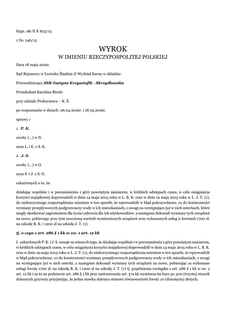Sygn. akt II K 623/15 1 Ds. 246/15 WYROK W IMIENIU RZECZYPOSPOLITEJ POLSKIEJ Dnia 18 maja 2016r. Sąd Rejonowy w Lwówku Śląskim II Wydział Karny w składzie: Przewodniczący SSR Justyna Krzysztofik - Skrzydłowska Protokolant Karolina Birulo przy udziale Prokuratora – K. Ś. po rozpoznaniu w dniach: 06.04.2016r. i 18.05.2016r. sprawy : 1. P. K. urodz. (...) w N. syna L. i E. z d. K. 2. J. S. urodz. (...) w O. syna S. i J. z d. O. oskarżonych o to, że: działając wspólnie i w porozumieniu z góry powziętym zamiarem, w krótkich odstępach czasu, w celu osiągnięcia korzyści majątkowej doprowadzili w dniu 14 maja 2015 roku w L. B. K. oraz w dniu 19 maja 2015 roku w L. J. T. (1), do niekorzystnego rozporządzenia mieniem w ten sposób, że wprowadzili w błąd pokrzywdzone, co do konieczności wymiany przepływowych podgrzewaczy wody w ich mieszkaniach, z uwagi na występujące już w nich usterkach, które mogły skutkować zagrożeniem dla życia i zdrowia dla ich użytkowników, a następnie dokonali wymiany tych urządzeń na nowe, pobierając przy tym zawyżoną wartość wymienionych urządzeń oraz wykonanych usług w kwotach 1700 zł. na szkodę B. K. i 1200 zł na szkodę J. T. (1) tj. o czyn z art. 286 § 1 kk w zw. z art. 12 kk I. oskarżonych P. K. i J. S. uznaje za winnych tego, że działając wspólnie i w porozumieniu z góry powziętym zamiarem, w krótkich odstępach czasu, w celu osiągnięcia korzyści majątkowej doprowadzili w dniu 14 maja 2015 roku w L. B. K. oraz w dniu 19 maja 2015 roku w L. J. T. (1), do niekorzystnego rozporządzenia mieniem w ten sposób, że wprowadzili w błąd pokrzywdzone, co do konieczności wymiany przepływowych podgrzewaczy wody w ich mieszkaniach, z uwagi na występujące już w nich usterki, a następnie dokonali wymiany tych urządzeń na nowe, pobierając za wykonane usługi kwotę 1700 zł. na szkodę B. K. i 1200 zł na szkodę J. T. (1) tj. popełnienia występku z art. 286 § 1 kk w zw. z art. 12 kk i za to na podstawie art. 286 § 1 kk przy zastosowaniu art. 37a kk wymierza im kary po 300 (trzysta) stawek dziennych grzywny przyjmując, że jedna stawka dzienna stanowi równowartość kwoty 10 (dziesięciu) złotych; II. na podstawie art. 63 § 1 kk zalicza oskarżonemu P. K. na poczet orzeczonej kary grzywny okres zatrzymania od dnia 19.05.2015r. godz. 18.25 do dnia 21.05.2015r. godz. 12.45 przyjmując, że jeden dzień zatrzymania odpowiada dwóm stawkom dziennym grzywny; III. na podstawie art. 63 § 1 kk zalicza oskarżonemu J. S. na poczet orzeczonej kary grzywny okres zatrzymania od dnia 19.05.2015r. godz. 18.25 do dnia 21.05.2015r. godz. 11.25 przyjmując, że jeden dzień zatrzymania odpowiada dwóm stawkom dziennym grzywny; IV. na podstawie art. 627 kpk zasądza od oskarżonych na rzecz Skarbu Państwa koszty sądowe po ½ części w kwotach po 80,00 złotych i na podstawie art. 3 ust 1 Ustawy z dnia 23.06.1973 r o opłatach w sprawach karnych wymierza im opłaty w kwocie po 300 złotych. Sygn. akt II K 623/15 UZASADNIENIE SĄD REJONOWY USTALIŁ NASTĘPUJĄCY STAN FAKTYCZNY: J. S. i P. K. są zatrudnieni w firmie (...) z siedzibą w B. prowadzonej przez synową J. J. (...). Przedmiotem działalności firmy jest wykonywanie instalacji wodno-kanalizacyjnych, cieplnych, gazowych i klimatyzacyjnych. J. S. jest upoważniony do zawierania umów zlecenia na wymianę urządzeń gazowych, pobierania zadatków i wpłat gotówkowych za wykonaną usługę. Wymieniony posiada także uprawnienia w zakresie instalacji urządzeń gazowych. P. K. z kolei jest zatrudniony od 9 lat na podstawie umowy o pracę na czas nieokreślony na stanowisku przedstawiciela handlowego i zajmuje się akwizycją. Zgodnie z poleceniem szefowej Firmy mogli ustalić koszty wymiany podgrzewacza z każdym klientem na sumę do 1500 zł. ( dowód: wyjaśnienia oskarżonego J. S. – k. 69, 114 verte-115 verte, wyjaśnienia oskarżonego P. K.-k. 63-64, 115 verte-117 verte ) W dniu 14 maja 2015r. J. S. i P. K. przybyli razem do miejscowości L. z zamiarem pozyskania osób chętnych na zamontowanie w ich mieszkaniach nowych przepływowych gazowych podgrzewaczy wody. Mężczyźni posiadali przy sobie podgrzewacze włoskiej firmy (...) modele Z., których średnia cena na rynku kształtowała się między 500, a 600 zł. ( dowód: wyjaśnienia oskarżonego J. S. – k. 69, 114 verte-115 verte, wyjaśnienia oskarżonego P. K.-k. 63-64, 115 verte-117 verte, zeznania świadka M. B. – k. 110, 121- 122 verte, zeznania świadka D. K. – k. 120-121 ) Mężczyźni zapukali do drzwi liczącej 77 lat B. K.. Oferując możliwość sprzedaży wraz z montażem nowego piecyka, po wskazaniu przez właścicielkę mieszkania miejsca, w którym znajdował się junkers, stwierdzili, że ten który posiada wymaga wymiany wobec występujących w nim rzekomo usterek nie pozwalających na dalszą bezpieczną eksploatację. Wprowadzona w błąd kobieta zgodziła się na wymianę piecyka za łączną wartość usługi tj. cenę nowego podgrzewacza oraz montaż - 1500 zł. Mężczyźni po wymianie pieca, zabrali zdemontowany ze sobą i razem z kobietą udali się do miejscowego banku, gdzie ta dokonała wypłaty ze swojego konta kwoty 1700 zł. Sumę tą wydała mężczyznom, którzy stwierdzili, że ponad umówione 1500 zł domagają się zapłaty 200 zł za podwiezienie kobiety do banku. ( dowód: zeznania świadka B. K.- k. 136-138, 139, zeznania świadka D. D. – k. 112 verte, 119 verte-120, zlecenie wymiany pieca – k. 54, historia rachunku bankowego - k. 123 ) Po powrocie do domu B. K. skontaktowała się telefonicznie ze znanym jej z terenu miasta instalatorem i serwisantem urządzeń gazowych M. B.. Mężczyzna po oglądnięciu nowo zamontowanego pieca stwierdził, że jest on gorszej jakości aniżeli posiadany przez kobietę wcześniej, a który to pamiętał, gdyż przez niego był montowany. Poradził, by odstąpiła od umowy. Istotnie B. K. pismem z dnia 15 maja 