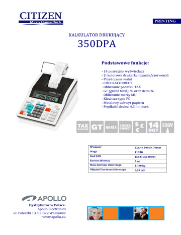 PRINTING KALKULATOR DRUKUJĄCY 350DPA Podstawowe funkcje: - 14 pozycyjny wyświetlacz - 2- kolorowa drukarka (czarny/czerwony) - Przeliczanie walut - CHECK&CORRECT - Obliczanie podatku TAX - GT (grand total), % oraz delta % - Obliczanie marży MU - Klawisze typu PC - Metalowy uchwyt papieru - Prędkość druku: 4,3 linii/sek Dystrybutor w Polsce: Apollo Electronics ul. Poleczki 13, 02-822 Warszawa www.apollo.eu Wymiary 226,4x 300,5x 70mm Waga 1193G Kod EAN 4562195130604 Karton zbiorczy 5 szt Masa kartonu zbiorczego 11,90 kg Objętość kartonu zbiorczego 0,09 m3