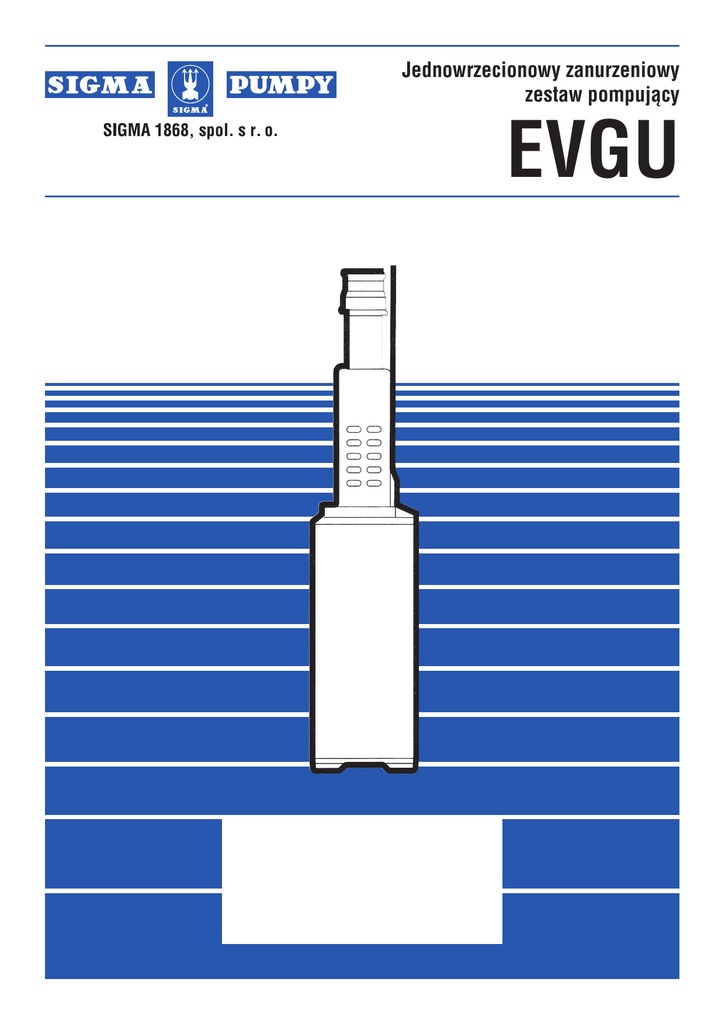 Jednowrzecionowy zanurzeniowy zestaw pompujący EVGU Zastosowanie Wykonanie Zestaw zanurzeniowy EVGU jest przeznaczony do pompowania wody użytkowej do temperatury 35 stopni Celsiusza i kwasowości w zakresie 6,5 – 12 pH. Pompa sprawdza się szczególnie w przypadku pompowania wody głębinowej z większych głębokości niż 8 metrów. Małe rozmiary pompy umożliwiają wykorzystane go do wąskich wywiertów. Pompa pracować może zarówno w swoim normalnym położeniu, czyli pionowo, ale również doskonale sprawdza się w położeniu poziomym pod warunkiem, że zawór będzie na górze a uzwojenie silnika będzie przykryte wodą. Zestaw doskonale nadaje się przy budowie wodociągów w domach rodzinnych, domkach letniskowych, szkołach, żłobkach lub innych pomieszczeniach zarówno do zaopatrywania w wodę, jak również do zwilżania ogródków, krzewów, boisk sportowych itp. Główne części pompy składają się z następujących materiałów: Korpus ssący – żeliwo szare Korpus tłoczący – żeliwo hartowane Wrzeciono – stal nierdzewna Wał łączący – stal nierdzewna Sprzęgło – stal węglowa Stojan – stal i guma Przekrój informacyjny pompy Konstrukcja Zestaw EVGU składa się z zanurzeniowego silnika elektrycznego i pompy jednowrzecionowej, które są bardzo prosto skontruowane z minimalną ilością części. Główne części pompy to: stojan z wkładką gumową o kształcie zwoju okrągłego. W jego zagłębieniu obraca się wrzeciono wraz ze zwojem. Diagram informacyjny pompy 700 – sprzęgło 1130 – stojan 1200 – korpus ssący 1310 – szyjka tłocząca 2180 – kołnierz łączący 2500 – wrzeciono 6544.1– pierścień zabezpieczający 7000 – sprzęgło 6570 – śruba M8x25 4510 – podkładka 8 4510.1– podkładka 6570.1– śruba M6x8 8100 – silnik elektryczny Dane techniczne Zestaw pompujący Maksymalne ciśnienie transportowe Wysokość transportowa Przepływ Średnica przyłączki tłoczącej Silnik elektryczny Moc znamionowa Obroty Napięcie Częstotliwość Prąd silnika Kabel zasilający Długość kabla podle życzenie Zewnętrzna średnica zestawu Wysokość zestawu Minimalna średnica wywiertu (studni) Zanurzenie maksymalne zestawu pod powierzchnią Waga zestawu wraz z 1 metrowym kablem Typy Pdo (mPa) Hmax (m) Qr (l.s–1) ∅D P (kW) n (min–1) U (V) f (Hz) i (A) (mm2) (m) (mm) L (mm) (mm) (m) (kg) 1"-EVGU-16-8-GU-080 0,8 80 0,65 G1" 1-P60-112-01 1,1 2810 400 50 3,4 4x1,5 25; 35; 50 142 680 150 30 21 1 1/4"-EVGU-25-6-GU-080 0,6 60 1,3 G 1 1/4" 1-P60-112-06 2,2 2820 400 50 6,4 4x1,5 25; 35; 50 142 748 150 30 32 1 – pompa 2 – kabel siłowy 3 – widełki, gniazdo 4 – skrzynka sterująca i elektryczna 5 – puszka 6 – sonda górnej powierzchni 7 – sonda dolnej powierzchni 8 – kable regulatorów powierzchni 9 – klips nośny 10 – wentyl zabezpieczający 11 – rurociąg tłoczący 12 – pasy ściągające 13 – kołnierz 14 – klapa zwrotna Pozycja 2 jest dostarczana z zestawem pompującym jako wyposażenie standardowe. W przypadku zastosowania ochraniacza elektrycznego w celu zapewnienia większej ochrony przed niebezpiecznym napięciem dotykowym należy użyć ochraniacz prądowy ze spóźnieniem minimalnie 10 ms (oznaczenie G, ewentualnie S). Produkt nie zagraża środowisku naturalnemu Jak poznają Państwo oryginalne pompy 1" – EVGU, producent SIGMA 1868 spółka z o.o. Na stojanie znajdują się cztery rowki o kształcie okręgów, wyznaczające możliwość kontaktu gumowych wkładek z wodą pitną. Dane producenta SIGMA, data produkcji i klasa jakości gumy jest wskazana na nalepce umieszczonej wokół stojana. Strzałka na odlewie wskazuje kierunek obrotu elementów hydraulicznych. Korpus ssący jest skonstruowany w taki sposób, aby można go było zawiesić we wywiertach i studniach za pomocą linek – posiada otwory na linki. Na korpusie ssącym są odlane podkładki w celu łatwego demontażu stojana i korpusu ssącego. Korpus ssący jest oznaczony numerem identyfikacyjnym 16 608. Na części hydraulicznej umieszczona została etykieta SIGMA 1868, spółka z o.o. wraz z numerem produkcyjnym (kombinacja ośmiu cyfr) oraz z danymi technicznymi. Na silniku elektrycznym znajduje się etykieta firmy SIGMA PUMPY ze znakiem ochronnym NAUTILA „jediný originál“ (jedyny oryginał). Silnik elektryczny jest oznaczony etykietą od naszego dostawcy KOVO Konice spółdzielnia pracy wraz z numerem silnika elektrycznego i danymi technicznymi. Kolor pompy jest zwykle szary Na korpusie ssącym jest odlane logo producenta SIGMA 1868 spółka z o.o. Sigma 1868 spol. s r. o. J. Sigmunda 79 783 50 Lutín Czech Republic Tel.:+420 585 651 302 Fax: +420 585 651 339 www.sigma1868.cz www.sigmapumpy.com