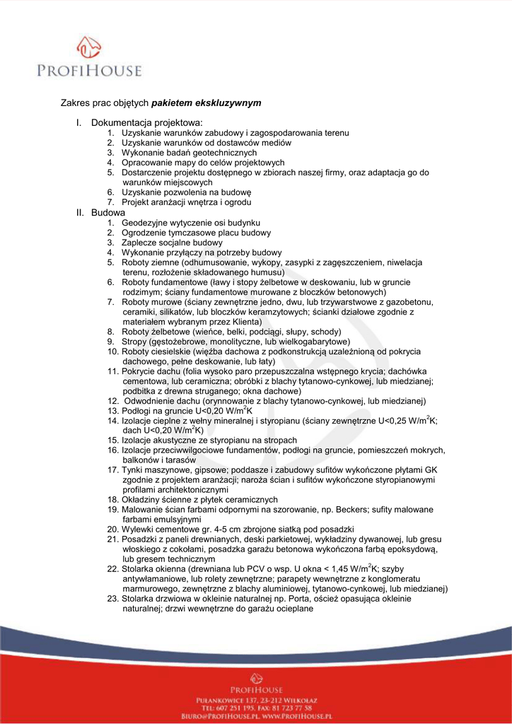 Zakres prac objętych pakietem ekskluzywnym I. Dokumentacja projektowa: 1. 2. 3. 4. 5. Uzyskanie warunków zabudowy i zagospodarowania terenu Uzyskanie warunków od dostawców mediów Wykonanie badań geotechnicznych Opracowanie mapy do celów projektowych Dostarczenie projektu dostępnego w zbiorach naszej firmy, oraz adaptacja go do warunków miejscowych 6. Uzyskanie pozwolenia na budowę 7. Projekt aranżacji wnętrza i ogrodu II. Budowa 1. 2. 3. 4. 5. 6. 7. 8. 9. 10. 11. 12. 13. 14. 15. 16. 17. 18. 19. 20. 21. 22. 23. Geodezyjne wytyczenie osi budynku Ogrodzenie tymczasowe placu budowy Zaplecze socjalne budowy Wykonanie przyłączy na potrzeby budowy Roboty ziemne (odhumusowanie, wykopy, zasypki z zagęszczeniem, niwelacja terenu, rozłożenie składowanego humusu) Roboty fundamentowe (ławy i stopy żelbetowe w deskowaniu, lub w gruncie rodzimym; ściany fundamentowe murowane z bloczków betonowych) Roboty murowe (ściany zewnętrzne jedno, dwu, lub trzywarstwowe z gazobetonu, ceramiki, silikatów, lub bloczków keramzytowych; ścianki działowe zgodnie z materiałem wybranym przez Klienta) Roboty żelbetowe (wieńce, belki, podciągi, słupy, schody) Stropy (gęstożebrowe, monolityczne, lub wielkogabarytowe) Roboty ciesielskie (więźba dachowa z podkonstrukcją uzależnioną od pokrycia dachowego, pełne deskowanie, lub łaty) Pokrycie dachu (folia wysoko paro przepuszczalna wstępnego krycia; dachówka cementowa, lub ceramiczna; obróbki z blachy tytanowo-cynkowej, lub miedzianej; podbitka z drewna struganego; okna dachowe) Odwodnienie dachu (orynnowanie z blachy tytanowo-cynkowej, lub miedzianej) 2 Podłogi na gruncie U<0,20 W/m K 2 Izolacje cieplne z wełny mineralnej i styropianu (ściany zewnętrzne U<0,25 W/m K; 2 dach U<0,20 W/m K) Izolacje akustyczne ze styropianu na stropach Izolacje przeciwwilgociowe fundamentów, podłogi na gruncie, pomieszczeń mokrych, balkonów i tarasów Tynki maszynowe, gipsowe; poddasze i zabudowy sufitów wykończone płytami GK zgodnie z projektem aranżacji; naroża ścian i sufitów wykończone styropianowymi profilami architektonicznymi Okładziny ścienne z płytek ceramicznych Malowanie ścian farbami odpornymi na szorowanie, np. Beckers; sufity malowane farbami emulsyjnymi Wylewki cementowe gr. 4-5 cm zbrojone siatką pod posadzki Posadzki z paneli drewnianych, deski parkietowej, wykładziny dywanowej, lub gresu włoskiego z cokołami, posadzka garażu betonowa wykończona farbą epoksydową, lub gresem technicznym 2 Stolarka okienna (drewniana lub PCV o wsp. U okna < 1,45 W/m K; szyby antywłamaniowe, lub rolety zewnętrzne; parapety wewnętrzne z konglomeratu marmurowego, zewnętrzne z blachy aluminiowej, tytanowo-cynkowej, lub miedzianej) Stolarka drzwiowa w okleinie naturalnej np. Porta, oścież opasująca okleinie naturalnej; drzwi wewnętrzne do garażu ocieplane 24. Bramy garażowe, np. Hormann 25. Elewacje (tynk cienkowarstwowy ze styropianowymi elementami architektonicznymi; zabudowa z drewna struganego na ruszcie, blachy tytanowo-cynkowej, miedzianej, lub kaset aluminiowych; cokoły z kamienia łamanego, lub płytek klinkierowych) 26. Instalacje wod-kan bez obiegu cyrkulacji, z osprzętem, ceramika – Koło, Cersanit, Sanitec; baterie – Oras, KFA; wc podwieszane na zabudowywanych GK stelażach 27. Instalacja C.O. grzejniki płytowe, w łazienkach ogrzewanie podłogowe 28. Instalacja kotłowni, rodzaj kotła i odprowadzenia spalin uzależniony od dostępnego paliwa, w wyposażeniu zasobnik ciepłej wody użytkowej o poj. 100 l 29. Instalacje elektryczne, antenowa, telefoniczna, Internetowa wraz z osprzętem, np. Berker 2 30. Nawierzchnie, tarasy i opaski wokół budynku z kostki brukowej 75 m 31. Przyłącza do budynku, gdy sieci dostawców przebiegają w odległości nie większej niż 15 m 32. Ogrodzenie murowane z cegły klinkierowej, lub kamienia łamanego z kratami kutymi o długości 5x obwodu budynku 33. Brama przesuwna lub dwuskrzydłowa w linii ogrodzenia sterowana automatycznie 34. Zagospodarowanie terenu działki o powierzchni 5x powierzchni użytkowej budynku zgodnie z projektem aranżacji ogrodu III. Odbiory końcowe 1. Inwentaryzacja geodezyjna 2. Świadectwo charakterystyki energetycznej 3. Odbiory końcowe i uzyskanie pozwolenia na użytkowanie