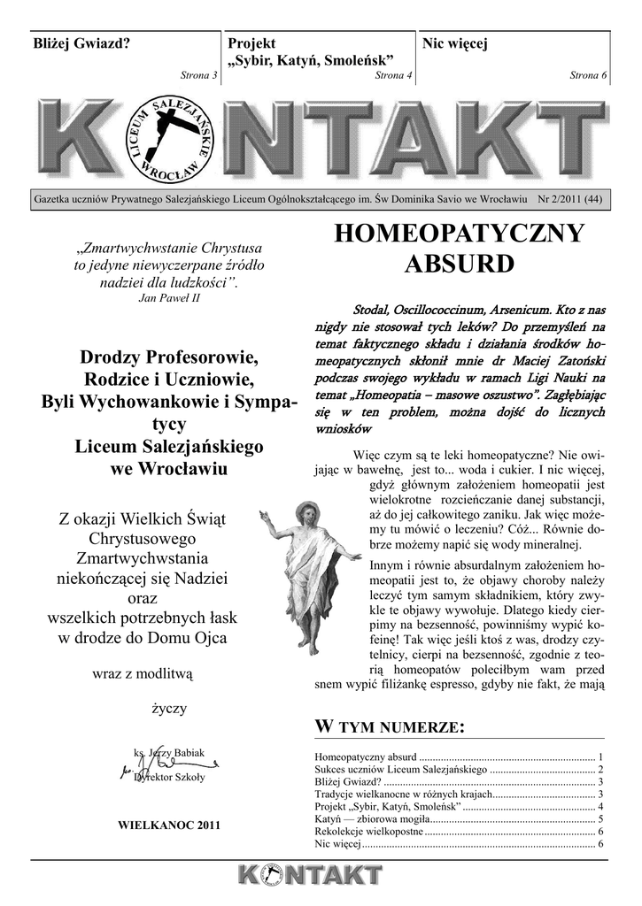 Bliżej Gwiazd? Projekt „Sybir, Katyń, Smoleńsk” Strona 3 Nic więcej Strona 4 Strona 6 Gazetka uczniów Prywatnego Salezjańskiego Liceum Ogólnokształcącego im. Św Dominika Savio we Wrocławiu Nr 2/2011 (44) „Zmartwychwstanie Chrystusa to jedyne niewyczerpane źródło nadziei dla ludzkości”. Jan Paweł II Drodzy Profesorowie, Rodzice i Uczniowie, Byli Wychowankowie i Sympatycy Liceum Salezjańskiego we Wrocławiu Z okazji Wielkich Świąt Chrystusowego Zmartwychwstania niekończącej się Nadziei oraz wszelkich potrzebnych łask w drodze do Domu Ojca wraz z modlitwą życzy ks. Jerzy Babiak Dyrektor Szkoły WIELKANOC 2011 HOMEOPATYCZNY ABSURD Stodal, Oscillococcinum, Arsenicum. Kto z nas nigdy nie stosował tych leków? Do przemyśleń na temat faktycznego składu i działania środków homeopatycznych skłonił mnie dr Maciej Zatoński podczas swojego wykładu w ramach Ligi Nauki na temat „Homeopatia – masowe oszustwo”. Zagłębiając się w ten problem, można dojść do licznych wniosków Więc czym są te leki homeopatyczne? Nie owijając w bawełnę, jest to... woda i cukier. I nic więcej, gdyż głównym założeniem homeopatii jest wielokrotne rozcieńczanie danej substancji, aż do jej całkowitego zaniku. Jak więc możemy tu mówić o leczeniu? Cóż... Równie dobrze możemy napić się wody mineralnej. Innym i równie absurdalnym założeniem homeopatii jest to, że objawy choroby należy leczyć tym samym składnikiem, który zwykle te objawy wywołuje. Dlatego kiedy cierpimy na bezsenność, powinniśmy wypić kofeinę! Tak więc jeśli ktoś z was, drodzy czytelnicy, cierpi na bezsenność, zgodnie z teorią homeopatów poleciłbym wam przed snem wypić filiżankę espresso, gdyby nie fakt, że mają W TYM NUMERZE: Homeopatyczny absurd ................................................................. 1 Sukces uczniów Liceum Salezjańskiego ....................................... 2 Bliżej Gwiazd? .............................................................................. 3 Tradycje wielkanocne w różnych krajach...................................... 3 Projekt „Sybir, Katyń, Smoleńsk” ................................................. 4 Katyń — zbiorowa mogiła............................................................. 5 Rekolekcje wielkopostne ............................................................... 6 Nic więcej ...................................................................................... 6 HOMEOPATYCZNY ABSURD oni jeszcze jedną ważną zasadę, o której już wcześniej wspomniałem. Otóż sądzą oni, że im mniejsze stężenie leczniczego składnika w leku, tym większa jego skuteczność. Zatem kawa przed snem to może być nie najlepszy sposób na wyleczenie bezsenności – po prostu okaże się ona zbyt słaba, gdyż stężenie będzie zbyt duże. Nic więc dziwnego, że zgodnie z założeniem, jeśli rozcieńczymy kofeinę do tego stopnia, że ona całkowicie zaniknie – mamy większe szanse na to, że tej nocy zaśniemy. że lek tak silnie rozcieńczony może działać, jest fakt, że woda ma pamięć. Zgodnie z tą zasadą nie wystarczy rozcieńczyć substancję – (taka woda jeszcze nie wyleczy)... musimy nią potrząsnąć i dopiero wtedy woda „zapamięta” wartości, jakie daje składnik, by mógł leczyć. informacyjny dla organizmu, a nie działanie materialnej substancji chemicznej. Ilość nośnika jest nieważna.” Tak więc nasuwa się pytanie – po co brać leki co kilka godzin, jak zaleca ulotka, i do czego ma służyć informacja, ile tabletek należy wziąć jednorazowo? Przecież to nie ma znaczenia, gdyż liczy się tylko impuls... tak więc, skoro liczy się impuls, to po co brać całą tabletkę, a nie połowę? Albo ćwiartkę? Bodziec zostanie przekazany, a my zaoszczędzimy. Poza tym ćwierć pigułki powinna działać lepiej, gdyż im mniejsze stężenie, Mało? Mamy kolejny ab- tym skuteczniejsze działanie. surd... Otóż według homeopatów Homeopatyczne absurdy ogromnym atutem ich leków jest można by mnożyć, gdyż jest to tefakt, że środków tych NIE MOŻNA mat-rzeka. Jednak na tym już zaPRZEDAWKOWAĆ. Zgodnie z kończę, żeby was nie zanudzać. wypowiedzią pani prezes Polskiego Stowarzyszenia Homeopatów Chciałbym tylko, byście zapamię„Niezależnie od przyjęcia dziesię- tali sobie jedno – HOMEOPATIA Ale to jeszcze nic... według ciu czy jednej tabletki efekt jest ten TO OSZUSTWO! homeopatów uzasadnieniem na to, sam, ponieważ chodzi o bodziec Maciej Strzyżewski, kl. IIb SUKCES UCZNIÓW LICEUM SALEZJAŃSKIEGO 8 kwietnia 2011 roku w Zespole Szkół nr 23 we Wrocławiu odbył się finał konkursu „Magnum Praemium Wratislaviae”. Już po raz czwarty uczestnicy zmagali się w konkursach wiedzy, literackich czy fotograficznych dotyczących stolicy Dolnego Śląska. Reprezentanci Liceum Salezjańskiego we Wrocławiu odnieśli duży sukces. Trójka uczniów – Aleksandra Dołęga (IIb), Katarzyna Dudek (Ib) oraz Samuel Bałdysz (IIb) – została zakwalifikowana do finału po etapie międzyszkolnym, który polegał na wypełnieniu testu sprawdzającego wiedzę o 2. Strona Wrocławiu. W końcowych zmaganiach wzięło udział 7 drużyn. Każda z nich miała za zadanie przedstawić opracowaną przez siebie prezentację na jeden z dwóch tematów („Wydarzenia historyczne związane z Wrocławiem po 1945 r.” lub „Rozwój kultury i sztuki we Wrocławiu”). ny wynik z testu, który uczniowie wypełniali w etapie międzyszkolnym. Dodatkowo Ola zdobyła również wyróżnienie w konkursie fotograficznym pt. „Wieże Wrocławia”. Nagrodami indywidualnymi były albumowe wydania książek. Poza tym jako jedna z najlepszych szkół we Wrocławiu otrzymaliśmy nagrodę w postaci lekcji plenerowej, która będzie zorganizowana dla uczniów naszej szkoły przez Towarzystwo Miłośników Wrocławia. Po zakończeniu prezentacji jury ogłosiło werdykt. Reprezentanci