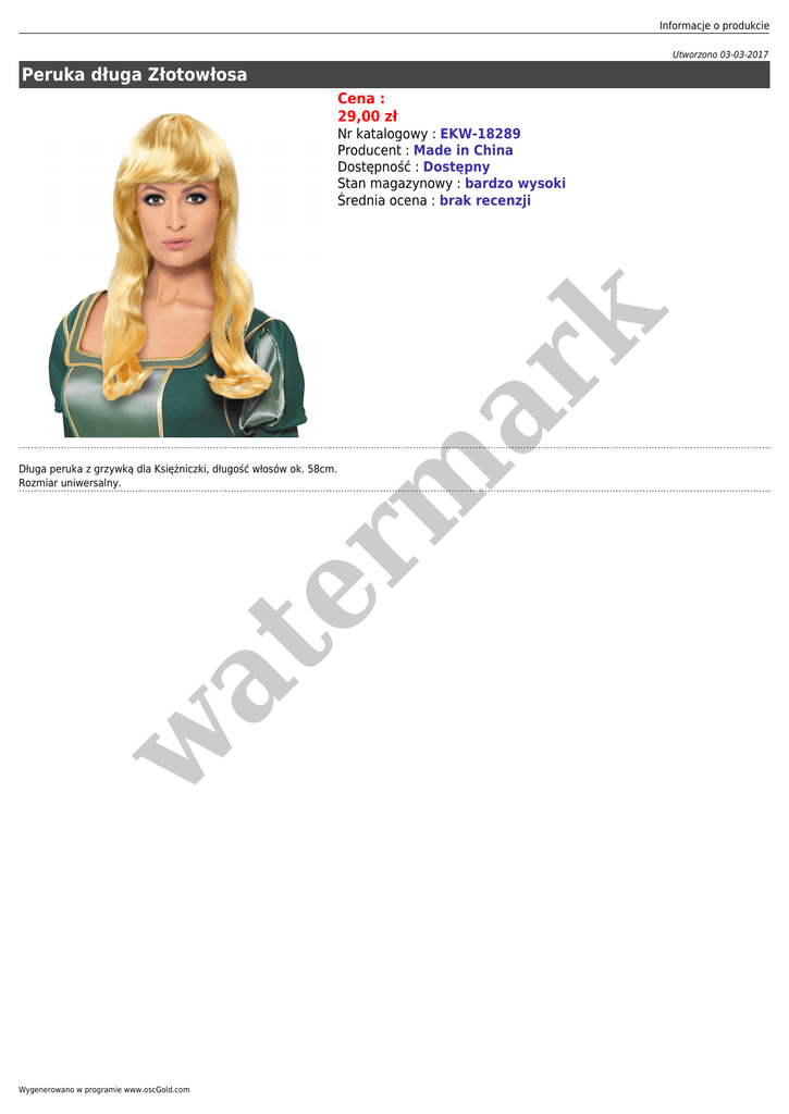 Informacje o produkcie Utworzono 03-03-2017 Peruka długa Złotowłosa Cena : 29,00 zł er m ar k Nr katalogowy : EKW-18289 Producent : Made in China Dostępność : Dostępny Stan magazynowy : bardzo wysoki Średnia ocena : brak recenzji w at Długa peruka z grzywką dla Księżniczki, długość włosów ok. 58cm. Rozmiar uniwersalny. Wygenerowano w programie www.oscGold.com