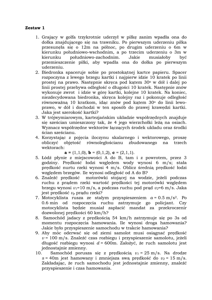 Zestaw 1 1. Grający w golfa trzykrotnie uderzył w piłkę zanim wpadła ona do dołka znajdującego się na trawniku. Po pierwszym uderzeniu piłka przesunęła się o 12m na północ, po drugim uderzeniu o 6m w kierunku południowo-wschodnim, a po trzecim uderzeniu o 3m w kierunku południowo-zachodnim. Jakie musiałoby być przemieszczenie piłki, aby wpadła ona do dołka po pierwszym uderzeniu. 2. Biedronka spaceruje sobie po prostokątnej kartce papieru. Spacer rozpoczyna z lewego brzegu kartki i najpierw idzie 10 kratek po linii prostej na prawo. Następnie skręca pod kątem 30o w dół i dalej po linii prostej przebywa odległość o długości 10 kratek. Następnie znów wykonuje zwrot i idzie w górę kartki, kolejne 10 kratek. Na koniec, niezdecydowana biedronka, skręca kolejny raz i pokonuje odległość równoważną 10 kratkom, idąc znów pod kątem 30o do linii lewoprawo, w dół i dochodzi w ten sposób do prawej krawędzi kartki. Jaka jest szerokość kartki? 3. W trójwymiarowym, kartezjańskim układzie współrzędnych znajduje się sześcian umieszczony tak, że 4 jego wierzchołki leżą na osiach. Wyznacz współrzędne wektorów łączących środek układu oraz środki ścian sześcianu. 4. Korzystając z pojęcia iloczynu skalarnego i wektorowego, proszę obliczyć objętość równoległościanu zbudowanego na trzech wektorach: a = (1,1,0), b = (0,1,2), c = (2,1,1). 5. Łódź płynie z miejscowości A do B, tam i z powrotem, przez 3 godziny. Prędkość łodzi względem wody wynosi 6 m/s; stała prędkość nurtu rzeki wynosi 4 m/s. Oblicz średnią prędkość łodzi względem brzegów. Ile wynosi odległość od A do B? 6. Znaleźć prędkość motorówki stojącej na wodzie, jeżeli podczas ruchu z prądem rzeki wartość prędkości tej motorówki względem brzegu wynosi v1=10 m/s, a podczas ruchu pod prąd v2=6 m/s. Jaka jest prędkość vp prądu rzeki? 7. Motocyklista rusza ze stałym przyspieszeniem a = 0.5 m/s2. Po 0.6 min od rozpoczęcia ruchu zatrzymuje go policjant. Czy motocyklista będzie musiał zapłacić mandat za przekroczenir dozwolonej prędkości 60 km/h? 8. Samochód jadacy z prędkością 54 km/h zatrzymuje się po 3s od momentu rozpoczęcia hamowania. Ile wynosi droga hamowania? Jakie było przyspieszenie samochodu w trakcie hamowania? 9. Aby móc oderwać się od ziemi samolot musi osiągnać prędkość v = 100 m/s. Znaleźć czas rozbiegu i przyspieszenie samolotu, jeżeli długość rozbiegu wynosi d = 600m. Założyć, że ruch samolotu jest jednostajnie zmienny. 10. Samochód porusza się z prędkością v1 = 25 m/s. Na drodze s = 40m jest hamowany i zmniejsza swą prędkość do v2 = 15 m/s. Zakładając, że ruch samochodu jest jednostajnie zmienny, znaleźć przyspieszenie i czas hamowania.