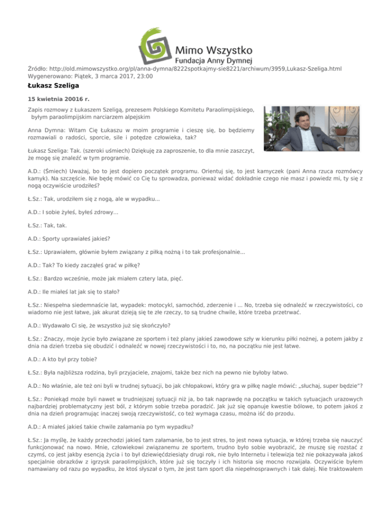 Źródło: http://old.mimowszystko.org/pl/anna-dymna/8222spotkajmy-sie8221/archiwum/3959,Lukasz-Szeliga.html Wygenerowano: Piątek, 3 marca 2017, 23:00 Łukasz Szeliga 15 kwietnia 20016 r. Zapis rozmowy z Łukaszem Szeligą, prezesem Polskiego Komitetu Paraolimpijskiego, byłym paraolimpijskim narciarzem alpejskim Anna Dymna: Witam Cię Łukaszu w moim programie i cieszę się, bo będziemy rozmawiali o radości, sporcie, sile i potędze człowieka, tak? Łukasz Szeliga: Tak. (szeroki uśmiech) Dziękuję za zaproszenie, to dla mnie zaszczyt, że mogę się znaleźć w tym programie. A.D.: (Śmiech) Uważaj, bo to jest dopiero początek programu. Orientuj się, to jest kamyczek (pani Anna rzuca rozmówcy kamyk). Na szczęście. Nie będę mówić co Cię tu sprowadza, ponieważ widać dokładnie czego nie masz i powiedz mi, ty się z nogą oczywiście urodziłeś? Ł.Sz.: Tak, urodziłem się z nogą, ale w wypadku... A.D.: I sobie żyłeś, byłeś zdrowy... Ł.Sz.: Tak, tak. A.D.: Sporty uprawiałeś jakieś? Ł.Sz.: Uprawiałem, głównie byłem związany z piłką nożną i to tak profesjonalnie... A.D.: Tak? To kiedy zacząłeś grać w piłkę? Ł.Sz.: Bardzo wcześnie, może jak miałem cztery lata, pięć. A.D.: Ile miałeś lat jak się to stało? Ł.Sz.: Niespełna siedemnaście lat, wypadek: motocykl, samochód, zderzenie i ... No, trzeba się odnaleźć w rzeczywistości, co wiadomo nie jest łatwe, jak akurat dzieją się te złe rzeczy, to są trudne chwile, które trzeba przetrwać. A.D.: Wydawało Ci się, że wszystko już się skończyło? Ł.Sz.: Znaczy, moje życie było związane ze sportem i też plany jakieś zawodowe szły w kierunku piłki nożnej, a potem jakby z dnia na dzień trzeba się obudzić i odnaleźć w nowej rzeczywistości i to, no, na początku nie jest łatwe. A.D.: A kto był przy tobie? Ł.Sz.: Była najbliższa rodzina, byli przyjaciele, znajomi, także bez nich na pewno nie byłoby łatwo. A.D.: No właśnie, ale też oni byli w trudnej sytuacji, bo jak chłopakowi, który gra w piłkę nagle mówić: „słuchaj, super będzie”? Ł.Sz.: Poniekąd może byli nawet w trudniejszej sytuacji niż ja, bo tak naprawdę na początku w takich sytuacjach urazowych najbardziej problematyczny jest ból, z którym sobie trzeba poradzić. Jak już się opanuje kwestie bólowe, to potem jakoś z dnia na dzień programując inaczej swoją rzeczywistość, co też wymaga czasu, można iść do przodu. A.D.: A miałeś jakieś takie chwile załamania po tym wypadku? Ł.Sz.: Ja myślę, że każdy przechodzi jakieś tam załamanie, bo to jest stres, to jest nowa sytuacja, w której trzeba się nauczyć funkcjonować na nowo. Mnie, człowiekowi związanemu ze sportem, trudno było sobie wyobrazić, że muszę się rozstać z czymś, co jest jakby esencją życia i to był dziewięćdziesiąty drugi rok, nie było Internetu i telewizja też nie pokazywała jakoś specjalnie obrazków z igrzysk paraolimpijskich, które już się toczyły i ich historia się mocno rozwijała. Oczywiście byłem namawiany od razu po wypadku, że ktoś słyszał o tym, że jest tam sport dla niepełnosprawnych i tak dalej. Nie traktowałem tego poważnie, raczej pukałem się po głowie palcem mówiąc, że to jest bez sensu, jak? Sport dla niepełnosprawnych? Przecież to jest wykluczające się. I przewartościowałem pewne rzeczy, zająłem się bardziej nauką, wróciłem do szkoły, do liceum medycznego. Tam też koleżanki, koledzy, nauczycielka, pomogli mi jakby przejść z powrotem do codzienności. Jest ważne żeby wrócić szybko do tego, co się robiło, bo wypadek to nie jest koniec świata, tylko konieczność odnalezienia się w nowej rzeczywistości. A.D.: Skończyłeś liceum medyczne? Ł.Sz.: Bez dyplomu, bo to tam, matura wcześniej, jeszcze rok, już nie traciłem tego czasu, bo wiedziałem już, że nie będę pracować w zawodzie pielęgniarza, bo to ciężka aktywność, przechodziłem praktyki i tak dalej, i zrozumiałem, że ... A.D.: ... że nie... Ł.Sz.: ... to trzeba coś innego. A.D.: I co innego wymyśliłeś wtedy? Ł.Sz.: Wymyśliłem studia. Miała być psychologia, ale się nie udało. Potem w efekcie pedagogika, no i jak rozpoczynałem studia to spotkałem człowieka, który zmienił trochę moją wizję przyszłości, zachęcał mnie tak na to, żebym pojechał z nim spróbować pojeździć na nartach w tej nowej rzeczywistości na jednej nodze. Był to, jest to Mirek Jakubczyk, znany w środowisku jako Kuba, trener pływania, który na tyle skutecznie mnie namawiał, że zgodziłem się dla świętego spokoju, żeby mi dał święty spokój i mówię: "pojadę, spróbuję, zobaczę". A.D.: Jak wy jeździcie na nartach? Ł.Sz.: Tak samo (uśmiech), tylko... A.D.: No ale jak? Ł.Sz.:... to jest tak, że trzeba nagle zrobić, trzeba przeskoczyć te dwa pierwsze kroki i zrobić trzeci. A.D.: To nartę masz w tej nodze, a druga co? Ł.Sz.: Nic, w ręku są jeszcze kulonarty... A.D.: Na jednej nodze jedziesz? Ł.Sz.: Tak. A.D.: Ona to wytrzymuje? Ł.Sz.: Wytrzymuje, no właśnie jak pojechałem pierwszy raz, to zrozumiałem, że na pewno muszę bardzo wzmocnić nogę. Też parę lat nie uprawiałem sportu, bo zająłem się nauką i jakoś nie kojarzyłem siebie w tej rzeczywistości jako sportowca. I po pierwszym wyjeździe zrozumiałem, że to jest możliwe, tylko muszę znaleźć właściwych ludzi, trenera, który będzie potrafił mnie nauczyć sprawnie przemieszczać się na stoku i założyłem, że pójdę w kierunku nart, bo na nartach też jeździłem od dziecka i bardzo to lubiłem robić, żeby wrócić do czegoś, za czym zdążyłem się stęsknić przez kilka lat. A.D.: Powiedz, a tak umiesz na przykład na jednej nodze przysiady robić? Ł.Sz.: Swobodnie (szeroki uśmiech). A.D.: Tak? Wariat, muszę się za siebie zabrać... (śmiech). Ł.Sz.: Znaczy, skoro jeżdżę na jednej nodze to... A.D.: Właśnie, bo tak głupio się pytam, ale