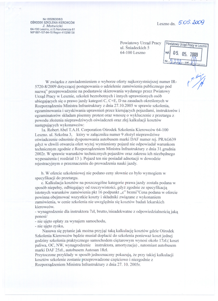 Nr 00263063 OSRODEK SZKOLENIA KIEROWCÓW Leszno dn. J. Motwicki 5: 05. J;CXY} 64-100 Leszno, ul.G.Narutowicza 61 NIP697.107-94.15Regon410296138 Powiatowy Urzad ul. Sniadeckich 5 Pracy 64-100 Leszno IPowiatowy UrzadPracyw Lesznie r- w zwiazku z zawiadomieniem o wyborze oferty najkorzystniejszej numer IR5720-8/2009 dotyczacej postepowania o udzielenie zamówienia publicznego pod nazwa" przeprowadzenie na podastawie skierowania wydanego przez Pwiatowy Urzad Pracy w Lesznie, szkolen bezrobotnych i innych uprawnionych osób ubiegajacych sie o prawo jazdy kategori C, C+E, D na zasadach okreslonych w Rozporzadzeniu Ministra Infrastruktury z dnia 27.10.2005 w sprawie szkolenia, egzaminowania i uzyskiwania uprawnien przez kierujacych pojazdami, instruktorów i egzaminatorów skladam pisemny protest oraz wnosze o wykluczenie z przetargu z powodu zlozenia nieprawdziwych oswiadczen oraz zlej kalkulacji kosztów nastepujacych wykonawców: 1a. Robert Abel T.A.H. Corporation Osrodek Szkolenia Kierowców 64-100 Leszno. ul. Szkolna 3, który w zalaczniku numer 9 zlozyl nieprawdziwe oswiadczenie odnosnie dysponowania autobusem marki DAF numer rej. PRAG639 gdyz w chwili otwarcia ofert wyzej wymieniony pojazd nie odpowiadal warunkom technicznym zgodnie z Rozporzadzeniem Ministra Infrastruktury z dnia 31.grudnia 2002r. W sprawie warunków technicznych pojazdów oraz zakresu ich niezbednego wyposazenia (rozdzial 13 ). Pojazd ten nie posiadal adnotacji w dowodzie rejestracyjnym o przeznaczeniu do prowadzenia nauki jazdy. b. W ofercie szkoleniowej nie podano ceny slownie co bylo wymogiem w specyfikacji do przetargu. c. Kalkulacja kosztów na poszczególne kategorie prawa jazdy zostala podana w sposób niepelny, odbiegajacy od rzeczywistosci, gdyz zgodnie ze specyfikacja istotnych warunków zamówienia pkt 16 podpunkt "c" brzmi"Cena podana w ofercie powinna obejmowac wszystkie koszty i skladniki zwiazane z wykonaniem zamówienia, w cenie szkolenia nie uwzglednia sie kosztów badan lekarskich kierowców. - wynagrodzenie dla instruktora 7zl, brutto,lnieadekwatne z odpowiedzialnosciajaka ponosi/ - nie ujeto oplaty za wynajem samochodu, - nie ujeto zysku, Nasuwa sie pytanie jak mozna przyjac taka kalkulacje kosztów gdzie Osrodek Szkolenia Kierowców bedzie musial doplacic do szkolenia poniewaz koszt jednej godziny szkolenia praktycznego samochodem ciezarowym wynosi okolo 17zl.( koszt paliwa, OC, NW, wynagrodzenie instruktora, amortyzacja) , natomiast autobusem marki DAF 25zl., autobusem Autosan 18zl. Przytoczone przyklady w sposób jednoznaczny pokazuja, ze przy takiej kalkulacji kosztów szkolenie zostanie !przeprowadzoneczesciowo i niezgodnie z Rozporzadzeniem Ministra Infrastruktury z dnia 27. 10. 2005r. --- 2. Wykonawca Jakub Szkudlarczyk Osrodek Szkolenia Kierowców "U Jakuba" zlozyl nieprawdziwy wykaz niezbednych do wykonania zamówienia narzedzi, urzadzen i pojazdów mechanicznych którymi dysponuje lub bedzie dysponowal wykonawca, zalacznik numer 3 gdyz niw pojazdy nie maja adnotacji w dowodzie rejestracyjnym o przystosowaniu pojazdu do prowadzenia nauki jazdy zgodnie z Rozp. Ministra Infratruktury z dnia 31.grudnia 2002r w sprawie warunków technicznychpojazdóworazzakresuich niezbednegowyposazenia- rozdzial13. - samochó ciezarowy MAN o nr rej. PLE83RA - przyczepa o nr rej PLEP716 - przyczepa o nr rej PLEU523 - przyczepa o nr rej LEM7859 - przyczepa o nr rej PLEU869 a. Kalkulacja kosztów jest niewlasciwa poniewaz - nie ujeto zysku - skoro zawarto urnowe na pozyczenie pojazdów ( 5 sztuk z miejscowosci Dabcze, odplatnosc 100zl za dobe, z miejscowosci Poznan 3 sztuki, odplatnosc 150zl za dobe) dlaczego tych oplat nie ujeto w kalkulacji kosztów o czym mówi punkt 16 podpunkt "c" specyfikacji istotnych warunków zamówienia. W interesie Urzedu Pracy oraz wszystkich przedsiebiorców prowadzacych szkolenie jest dobre przygotowanie do wykonywania trudnego i wiazacego sie z duza odpowiedzialnoscia zawodu kierowcy. W/w przyklady poddaja pod watpliwosc solidnosc przeprowadzenia szkolenia. ~~A III a> Mot icki