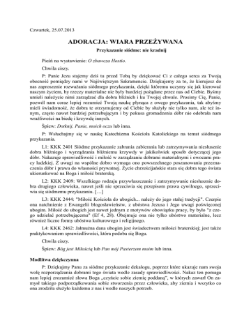 Czwartek, 25.07.2013 ADORACJA: WIARA PRZEśYWANA Przykazanie siódme: nie kradnij Pieśń na wystawienie: O zbawcza Hostio. Chwila ciszy. P: Panie Jezu stajemy dziś tu przed Tobą by dziękować Ci z całego serca za Twoją obecność pomiędzy nami w Najświętszym Sakramencie. Dziękujemy za to, Ŝe kierujesz do nas zaproszenie rozwaŜania siódmego przykazania, dzięki któremu uczymy się jak kierować naszym Ŝyciem, by rzeczy materialne nie były bardziej poŜądane przez nas od Ciebie. Byśmy umieli naleŜycie nimi zarządzać dla dobra bliźnich i ku Twojej chwale. Prosimy Cię, Panie, pozwól nam coraz lepiej rozumieć Twoją naukę płynąca z owego przykazania, tak abyśmy mieli świadomość, Ŝe dobra te otrzymujemy od Ciebie by słuŜyły nie tylko nam, ale teŜ innym, często nawet bardziej potrzebującym i by pokusa gromadzenia dóbr nie odebrała nam wraŜliwości na biedę i krzywdę innych. Śpiew: Dotknij, Panie, moich oczu lub inna. P: Wsłuchajmy się w naukę Katechizmu Kościoła Katolickiego na temat siódmego przykazania. L1: KKK 2401 Siódme przykazanie zabrania zabierania lub zatrzymywania niesłusznie dobra bliźniego i wyrządzania bliźniemu krzywdy w jakikolwiek sposób dotyczącej jego dóbr. Nakazuje sprawiedliwość i miłość w zarządzaniu dobrami materialnymi i owocami pracy ludzkiej. Z uwagi na wspólne dobro wymaga ono powszechnego poszanowania przeznaczenia dóbr i prawa do własności prywatnej. śycie chrześcijańskie stara się dobra tego świata ukierunkować na Boga i miłość braterską. L2: KKK 2409: Wszelkiego rodzaju przywłaszczanie i zatrzymywanie niesłusznie dobra drugiego człowieka, nawet jeśli nie sprzeciwia się przepisom prawa cywilnego, sprzeciwia się siódmemu przykazaniu. […] L3: KKK 2444: "Miłość Kościoła do ubogich... naleŜy do jego stałej tradycji". Czerpie ona natchnienie z Ewangelii błogosławieństw, z ubóstwa Jezusa i Jego uwagi poświęconej ubogim. Miłość do ubogich jest nawet jednym z motywów obowiązku pracy, by było "z czego udzielać potrzebującemu" (Ef 4, 28). Obejmuje ona nie tylko ubóstwo materialne, lecz równieŜ liczne formy ubóstwa kulturowego i religijnego. L4: KKK 2462: JałmuŜna dana ubogim jest świadectwem miłości braterskiej; jest takŜe praktykowaniem sprawiedliwości, która podoba się Bogu. Chwila ciszy. Śpiew: Bóg jest Miłością lub Pan mój Pasterzem moim lub inna. Modlitwa dziękczynna P: Dziękujmy Panu za siódme przykazanie dekalogu, poprzez które ukazuje nam swoja wolę rozporządzania dobrami tego świata wedle zasady sprawiedliwości. Nakaz ten pomaga nam lepiej zrozumieć słowa Boga „czyńcie sobie ziemię poddaną”, w których zawarł On zamysł takiego podporządkowania sobie stworzenia przez człowieka, aby ziemia i wszytko co ona zrodziła słuŜyło kaŜdemu z nas i wedle naszych potrzeb. Śpiew: Dzięki, o Panie, składamy dzięki, o wszechmogący nasz Królu w niebie lub inny L1: Dziękujemy Ci Ojcze nasz za to, Ŝe dbasz o potrzeby doczesne człowieka i obdarzasz go licznymi dobrami duchowymi i materialnymi potrzebnymi w ziemskim bytowaniu. L2: Dziękujemy Ci BoŜe, za siódme przykazanie, w którym pouczasz nas jak mamy zarządzać dobrami materialnymi, aby słuŜyły nie tylko nam, ale teŜ wszelkiemu stworzeniu. L1: Dziękujemy Ci Panie za to, Ŝe stwarzając świat uczyniłeś człowieka zdolnego do pracy oraz rozporządzania i dzielenia z bliźnimi się jej owocami. L2: Dziękujemy Panie za Nauczycielski Urząd Kościoła, który głosząc naukę społeczną w oparciu o Ewangelię i przykazania uczy nas sprawiedliwości i solidarności z innymi. P: Stojąc przed Tobą BoŜe wszechmogący pragniemy dziękować z całego naszego serca za to, Ŝe o nas pamiętasz i idziesz nam z pomocą w potrzebach materialnych, aby nam i naszym bliźnim nigdy nie brakło „chleba powszedniego”. Wielbimy Cię Panie Twą dobroć teraz i na wieki wieków. Amen. Chwila ciszy. Śpiew: BoŜe w dobroci... lub Ojcze chwała Tobie... Modlitwa prośby P: W Psalmie 127 czytamy: JeŜeli Pan domu nie zbuduje, na próŜno się trudzą ci, którzy go wznoszą. JeŜeli Pan miasta nie ustrzeŜe, straŜnik czuwa daremnie. Daremnym jest dla was wstawać przed świtem, wysiadywać do późna dla was, którzy jecie chleb zapracowany cięŜko; tyle daje On i we śnie tym, których miłuje. /Ps. 127 1-2/ Prośmy więc Boga Ojca, aby pomógł nam naleŜycie rozumieć Jego nakaz wynikający z siódmego przykazania i byśmy pamiętali, Ŝe własną mocą człowiek nic nie moŜe. Wszystko zaś, co otrzymuję, otrzymuje od Najlepszego Boga Ojca, by słuŜyło dla dobra wszystkich. Śpiew: Twej miłości pełni, wiarą umocnieni, Panie, prosimy Cię lub Jezu ufam Tobie (3x) inny L1: Spraw Panie byśmy umieli dziękować Ci za wszystkie dary, jakimi nas obdarzasz i chętnie dzielili się nimi z potrzebującymi zgodnie z zasadą sprawiedliwości. L2: Spraw Ojcze nasz, by wzorem naszego postępowania wobec braci w dzieleniu się chlebem był zawsze sam Jezus Chrystus nadzieja ubogich i potrzebujących. L3: Prosimy Cię Panie przepuść nam wszystkie nasze grzechy zachłanności, zawłaszczenia i zaniechania jałmuŜny i czyń nam nie według Twej sprawiedliwości a według Twego miłosierdzia. L4: Prosimy Cię BoŜe, by nasz PapieŜ Franciszek i Święty Kościół Powszechny był czytelnym znakiem sprzeciwu wobec wyzysku i niesprawiedliwości społecznej. P: Pokornie prosimy Panie, BoŜe nasz, przyjdź nam z pomocą i wysłuchaj próśb, które Ci przedstawiamy ufni w twoje miłosierdzie, teraz i na wieki wieków. Amen. 2 Chwila ciszy. Śpiew: Szukajcie wpierw królestwa BoŜego... lub Wy jesteście na ziemi... P: Módlmy się teraz przez wstawiennictwo Matki BoŜej Dobrej Rady, by wspierała nas we wszelkich trudnościach i pomagała właściwie postępować wobec innych. Prośmy niech Najświętsza Matka Jezusa i nasza Matka uczy nas kierować się zasadą miłości i sprawiedliwo