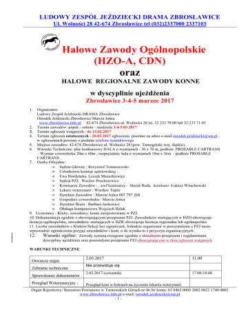 LUDOWY ZESPÓŁ JEŹDZIECKI DRAMA ZBROSŁAWICE Ul. Wolności 28 42-674 Zbrosławice tel (032)2337000 2337103 Halowe Zawody Ogólnopolskie (HZO-A, CDN) oraz HALOWE REGIONALNE ZAWODY KONNE w dyscyplinie ujeżdżenia Zbrosławice 3-4-5 marzec 2017 1. Organizator: Ludowy Zespół Jeździecki DRAMA Zbrosławice Ośrodek Jeździecki Zbrosławice Marcin Jońca www.zbroslawice.info.pl 42-674 Zbrosławice ul. Wolności 28 tel. 32 233 70 00 lub 32 233 71 03 2. Termin zawodów: piątek - sobota – niedziela 3-4-5.03.2017 3. Termin zgłoszeń wstępnych : do 15.02.2017 4. Termin zgłoszeń ostatecznych - 20.02.2017 zgłoszenia pisemne na adres e-mail [email protected] , w zgłoszeniach prosimy o podanie telefonu kontaktowego 5. Miejsce zawodów: 42-674 Zbrosławice ul. Wolności 28 (pow. Tarnogórski woj. śląskie). 6. Warunki Techniczne: plac konkursowy HALA o wymiarach - 30 x 70 m, podłoże PROSABLE CARTRANS – Wymiar czworoboku 20m x 60m , rozprężalnia: hala o wymiarach 18m x 36m - podłoże PROSABLE CARTRANS , 7. Osoby Oficjalne : • Sędzia Główny : Krzysztof Tomaszewski • Członkowie komisji sędziowskiej : • Ewa Hordyńska, Leszek Mazurkiewicz • Sędzia PZJ: Wacław Pruchniewicz • Komisarze Zawodów : , szef komisarzy – Marek Ruda komisarz Łukasz Wituchowski • Lekarz weterynarii : Wiesław Topór • Dyrektor Zawodów : Marcin Jońca 607 797 268 • Gospodarz czworoboku : Marcin Jońca • Dyrektor Biura : Barbara Jachowicz • Obsługa komputerowa Wojciech Helak 9. Uczestnicy : Kluby, zawodnicy, konie zarejestrowane w PZJ. 10. Dokumentacja zgodnie z obowiązującymi przepisami PZJ. Zawodników startujących w HZO obowiązuje licencja ogólnopolska, zawodników startujących w HZR obowiązuje licencja regionalna lub ogólnopolska 11. Liczba zawodników z Klubów/Sekcji bez ograniczeń. Jednakże organizator w porozumieniu z PZJ może wprowadzić ograniczenia przyjęć zawodników i koni, o ile wynika to z przyczyn organizacyjnych. 12. Warunki ogólne: Zawody zostaną rozegrane zgodnie z aktualnymi przepisami i regulaminami dyscypliny ujeżdżenia oraz pozostałymi przepisami PZJ obowiązującymi w dniu zgłoszeń wstępnych. WARUNKI TECHNICZNE Otwarcie stajni Zebranie techniczne Sprawdzanie dokumentów Przegląd Weterynaryjny : 2.03.2017 11.00 Nie przewiduje się 2.03.2017 (czwartek) 17.00-19.00 Przegląd koni w boksach na życzenie lekarza weterynarii Organ Rejestrowy: Starostwo Powiatowe w Tarnowskich Górach nr 46 Nr konta: 63 8463 0005 2002 0022 1740 0002 www.zbroslawice.info.pl e-mail: [email protected] -1- LUDOWY ZESPÓŁ JEŹDZIECKI DRAMA ZBROSŁAWICE Ul. Wolności 28 42-674 Zbrosławice tel (032)2337000 2337103 PROGRAM ZAWODÓW Ranga Dzień 1 Nr konkursu 3.03 HZR HZR L-2 D-2 1 2 HZR D-1 HZO Dzieci HZR Konie HZO Junior na Kucach HZR HZO HZO YR HZO HZO Dzień 2 4.03 L-3 P-1 Nr konkursu Dzień 2 Nr konkursu Czworobok o wymiarach 5.03 12 13 L-4 P-2 23 24 20x60 20x60 3 D-2 14 D-3 25 20x60 D-1 N-1 N-1 C-1 4 5 6 7 D-2 N-2 N-2* C-2 15 16 17 18 D-3 N-6 N-7 C-3 26 27 28 29 20x60 20x60 20x60 C-1 CC-1 CC-4 CS-1 8 9 10 11 C-2* CC-2* CC-5* CS-2* 19 20 21 22 C-4 CC-6 CC-7 CS-5 30 31 32 33 20x60 20x60 20x60 20x60 * Konkursy kwalifikacyjne do programów dowolnych są konkursy rozgrywane drugiego dnia w których należy uzyskać minimum 60%. Pary, które nie osiągną tego poziomu, mogą wystartować w konkursie pocieszenia z programem z pierwszego dnia. Obowiązują programy edycja 2016 W przypadku nie uzyskania kwalifikacji do programu dowolnego z muzyką zawodnikowi nie przysługuje prawo do zwrotu opłaty. Muzykę do programów KÜR należy przesyłać na adres [email protected] SPRAWY ORGANIZACYJNE 1. Opłaty w zawodach ogólnopolskich: Opłata organizacyjna za całe zawody 285,00 PLN od konia (3 dni po 1 starcie – w tym opłata za program badań antydopingowych – MPC 15,00 PLN od konia) Wpisowe do każdego dodatkowego pojedynczego startu 50 zł. Opłata za boks - 220 PLN. (boksy namiotowe, należy zabrać wiadra i żłoby) 2. Opłaty w zawodach regionalnych Wpisowe za całe zawody 210,00 PLN od konia (3 dni po 1 starcie w tym opłata za fundusz nagród Śląskiego Związku Jeździeckiego – 5,00 PLN od konia) Wpisowe do każdego dodatkowego pojedynczego startu 20 zł. Opłata za boks - 220 PLN. (boksy namiotowe, należy zabrać wiadra i żłoby) 3. W przypadku nie zakwalifikowania się do konkursów finałowych i podjęcia przez zawodnika decyzji w sobotę z rezygnacji ze startów w niedzielnych konkursach informujemy, że jego rezygnacja nie upoważnia do żądania zwrotu pieniędzy za niewykorzystany 1 niedzielny start. Zawodnik nie zakwalifikowany do finałów ma prawo startu w konkursach pocieszenia – konkursy jak w pierwszy dzień Organ Rejestrowy: Starostwo Powiatowe w Tarnowskich Górach nr 46 Nr konta: 63 8463 0005 2002 0022 1740 0002 www.zbroslawice.info.pl e-mail: [email protected] -2- LUDOWY ZESPÓŁ JEŹDZIECKI DRAMA ZBROSŁAWICE Ul. Wolności 28 42-674 Zbrosławice tel (032)2337000 2337103 4. Wszystkie opłaty należy wpłacać na konto i dowód wpłaty przestać e-mailem wraz ze zgłoszeniem ostatecznym Konto klubu: LZJ DRAMA Zbrosławice, ul. Wolności 28, 42-674 Zbrosławice nr 63 8463 0005 2002 0022 1740 0002 UWAGA: Zgłoszenia koni, za które do dnia 20.02.2017 r. nie zostanie wniesiona opłata uważane będą za niepotwierdzone. 5. W ramach opłaty za boks Organizator zapewnia pierwszą słomę. Na terenie zawodów istnieje możliwość nabycia – słoma 1 kostka 10 zł., siano 1 kostka 10 zł. pasza, pojemniki na paszę i wodę we własnym zakresie. W przypadku gdy zawodnik chce innej ściółki niż słoma organizator pozostawia boks pusty, inną ściółkę np. trociny zawodnik przywozi ze sobą. 6. Stajnia dostępna od godziny 10.00 w dniu 2.03.2017. Istnieje możliwość wcześniejszego przyjazdu na zawody lub późniejszego wyjazdu. Opłata za każdy dodatkowy dzień pobytu 50 PLN od konia 7. Wyżywienie we własnym zakresie w restauracjach n