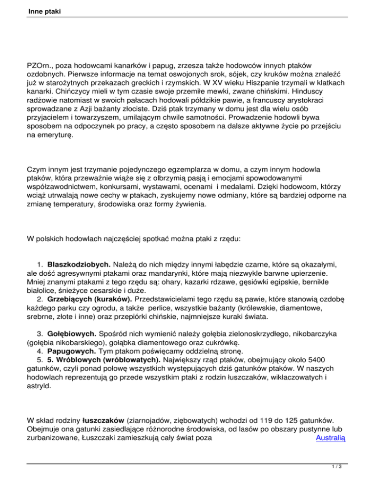 Inne ptaki PZOrn., poza hodowcami kanarków i papug, zrzesza także hodowców innych ptaków ozdobnych. Pierwsze informacje na temat oswojonych srok, sójek, czy kruków można znaleźć już w starożytnych przekazach greckich i rzymskich. W XV wieku Hiszpanie trzymali w klatkach kanarki. Chińczycy mieli w tym czasie swoje przemiłe mewki, zwane chińskimi. Hinduscy radżowie natomiast w swoich pałacach hodowali półdzikie pawie, a francuscy arystokraci sprowadzane z Azji bażanty złociste. Dziś ptak trzymany w domu jest dla wielu osób przyjacielem i towarzyszem, umilającym chwile samotności. Prowadzenie hodowli bywa sposobem na odpoczynek po pracy, a często sposobem na dalsze aktywne życie po przejściu na emeryturę. Czym innym jest trzymanie pojedynczego egzemplarza w domu, a czym innym hodowla ptaków, która przeważnie wiąże się z olbrzymią pasją i emocjami spowodowanymi współzawodnictwem, konkursami, wystawami, ocenami i medalami. Dzięki hodowcom, którzy wciąż utrwalają nowe cechy w ptakach, zyskujemy nowe odmiany, które są bardziej odporne na zmianę temperatury, środowiska oraz formy żywienia. W polskich hodowlach najczęściej spotkać można ptaki z rzędu: 1. Blaszkodziobych. Należą do nich między innymi łabędzie czarne, które są okazałymi, ale dość agresywnymi ptakami oraz mandarynki, które mają niezwykle barwne upierzenie. Mniej znanymi ptakami z tego rzędu są: ohary, kazarki rdzawe, gęsiówki egipskie, bernikle białolice, śnieżyce cesarskie i duże. 2. Grzebiących (kuraków). Przedstawicielami tego rzędu są pawie, które stanowią ozdobę każdego parku czy ogrodu, a także perlice, wszystkie bażanty (królewskie, diamentowe, srebrne, złote i inne) oraz przepiórki chińskie, najmniejsze kuraki świata. 3. Gołębiowych. Spośród nich wymienić należy gołębia zielonoskrzydłego, nikobarczyka (gołębia nikobarskiego), gołąbka diamentowego oraz cukrówkę. 4. Papugowych. Tym ptakom poświęcamy oddzielną stronę. 5. 5. Wróblowych (wróblowatych). Największy rząd ptaków, obejmujący około 5400 gatunków, czyli ponad połowę wszystkich występujących dziś gatunków ptaków. W naszych hodowlach reprezentują go przede wszystkim ptaki z rodzin łuszczaków, wikłaczowatych i astryld. W skład rodziny łuszczaków (ziarnojadów, ziębowatych) wchodzi od 119 do 125 gatunków. Obejmuje ona gatunki zasiedlające różnorodne środowiska, od lasów po obszary pustynne lub zurbanizowane, Łuszczaki zamieszkują cały świat poza Australią 1/3 Inne ptaki , Oceanią , Madagaskarem i Antarktydą . Należą do nich między innymi kanarek (także ma oddzielną stronę), szczygieł, dzwoniec, czyżyk, wszystkie kulczyki, makolągwa, zięba i gil. Rodzina wikłaczowate obejmuje ponad 150 gatunków . Większość z nich żyje w Afryce subsaharyjskiej , pozostałe w Azji i Australii . Najbardziej znanym ptakiem tej rodziny są wróble, które rozprzestrzeniły się na całym świecie. Samce wielu gatunków są kolorowo ubarwione, często żółte lub czerwone. W tej rodzinie spotykamy także wdówkę rajską z pięknym, długim ogonem oraz wikłacza czerwonodzibego, uważanego za najliczniejszego ptaka na świecie, którego populację ocenia się na 1,5 miliarda osobników. Astryldy to małe ptaki, posiadające dzioby przystosowane do miażdżenia ziaren. Do rodziny należy sto kilkadziesiąt gatunków ptaków występujących w tropikach Starego Świata oraz Australazji . Z powodu barwnego upierzenia niektóre gatunki astryldów są chętnie trzymane w niewoli jako ptaki ozdobne. Do najpopularniejszych należy zeberka . W jej hodowli uzyskano wiele odmian barwnych, a nawet opracowano specjalne standardy. Do astryld należą także wszystkie amadyny i amadynki, motyliki i mniszki, w tym mewka japońska. Mewki japońskie nie występują w przyrodzie. Jest to udomowiona przez Chińczyków kilkaset lat temu forma mniszki brązowej. Jest łatwa w hodowli, bo zawsze była rozmnażana w warunkach, jakich zapewnił jej człowiek. Do Europy została sprowadzona w 1860 r. Przedstawicielami rzędu wróblowych są także słowiki, drozdy, błyszczaki, szpaki oraz kos i gwarek. Ten ostatni posiada duże zdolności naśladowania różnych dźwięków, w tym ludzkiej mowy, w związku z czym jest cenionym ptakiem hodowlanym. Przewyższa pod tym względem papugi . Na wolności nigdy nie naśladuje głosów innych gatunków, a jedynie śpiew innych gwarków. 2/3 Inne ptaki Większość z wymienionych powyżej ptaków można spotkać w hodowlach naszych członków. Oczywiście tylko te, które nie są objęte ochroną. Po latach poświęconych tym małym istotkom, po oddaniu im każdej wolnej chwili trudno wyobrazić sobie bez nich dalsze życie. W dowód wdzięczności za opiekę i przyjaźń nasi skrzydlaci przyjaciele obdarowują opiekunów swym potomstwem. Pozwalają jeszcze nieupierzone pisklaki wziąć do ręki, obejrzeć je, a nawet, jeśli zachodzi taka potrzeba, dokonać zabiegu. Jest to wielkie zaufanie okazane opiekunowi. Ptasia mama i tata wiedzą, że przy tym człowieku ich dziecku nie stanie się krzywda. On ich przecież też wychował i pomagał, gdy zaszła potrzeba, Zaufanie i przyjaźń, którą obdarzają ludzi, jest najcenniejszą rzeczą jaką może dostać człowiek od ptaka. Każdy, kto kocha ptaki zrobi wszystko, aby na to sobie zasłużyć. Tym bardziej, że z roku na rok ginie coraz więcej ptaków. Nie powinniśmy dopuścić do tego, że będziemy żyć w „betonowej dżungli”, a nieliczne gatunki ptaków będziemy oglądać tylko w Ogrodach Zoologicznych. Następne pokolenia nie będą wiedziały, że ptaki żyły kiedyś nie tylko na wolności, ale też w naszych domach, gdzie były traktowane jak członek rodziny. Serdecznie zapraszamy wszystkich, którym leży na sercu dobro ptaków, do odwiedzenia Pzorn. Na pewno spędzicie tu mile czas na interesującej rozmowie. Zachęcamy do założenia hodowli. Jeżeli war