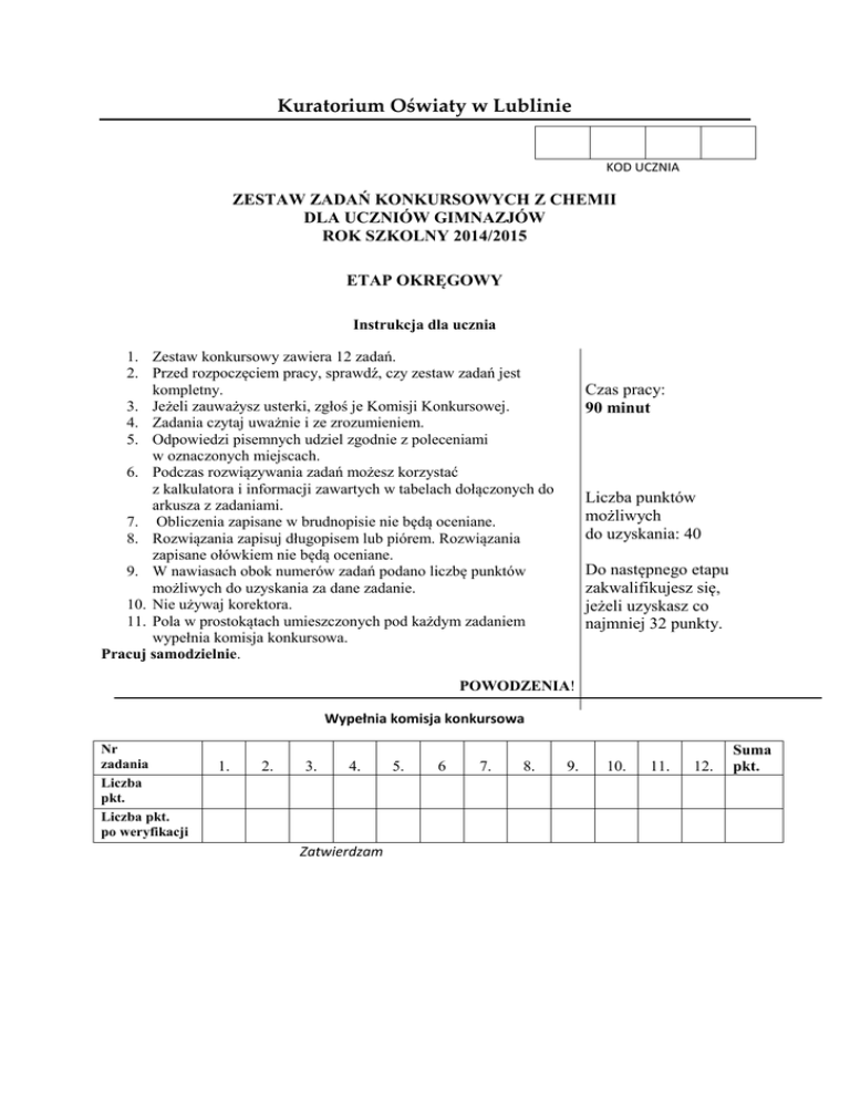 Kuratorium Oświaty w Lublinie KOD UCZNIA ZESTAW ZADAŃ KONKURSOWYCH Z CHEMII DLA UCZNIÓW GIMNAZJÓW ROK SZKOLNY 2014/2015 ETAP OKRĘGOWY Instrukcja dla ucznia 1. Zestaw konkursowy zawiera 12 zadań. 2. Przed rozpoczęciem pracy, sprawdź, czy zestaw zadań jest kompletny. 3. Jeżeli zauważysz usterki, zgłoś je Komisji Konkursowej. 4. Zadania czytaj uważnie i ze zrozumieniem. 5. Odpowiedzi pisemnych udziel zgodnie z poleceniami w oznaczonych miejscach. 6. Podczas rozwiązywania zadań możesz korzystać z kalkulatora i informacji zawartych w tabelach dołączonych do arkusza z zadaniami. 7. Obliczenia zapisane w brudnopisie nie będą oceniane. 8. Rozwiązania zapisuj długopisem lub piórem. Rozwiązania zapisane ołówkiem nie będą oceniane. 9. W nawiasach obok numerów zadań podano liczbę punktów możliwych do uzyskania za dane zadanie. 10. Nie używaj korektora. 11. Pola w prostokątach umieszczonych pod każdym zadaniem wypełnia komisja konkursowa. Pracuj samodzielnie. Czas pracy: 90 minut Liczba punktów możliwych do uzyskania: 40 Do następnego etapu zakwalifikujesz się, jeżeli uzyskasz co najmniej 32 punkty. POWODZENIA! Wypełnia komisja konkursowa Nr zadania Liczba pkt. Liczba pkt. po weryfikacji 1. 2. 3. 4. Zatwierdzam 5. 6 7. 8. 9. 10. 11. 12. Suma pkt. Zadanie 1. [ 3 pkt ] Napisz cząsteczkowe równania reakcji, które trzeba przeprowadzić aby otrzymać wodorotlenek żelaza(III) mając do dyspozycji substancje podane w ramce. tlenek żelaza(II), tlenek żelaza(III), tlenek sodu, kwas siarkowy(VI), siarkowodór, woda ………………………………………………………………………………………………… …………………………………………………………………………………………………... …………………………………………………………………………………………………... ………………………………………………………………………………………………….. …………pkt Zadanie 2. [ 4 pkt ] Uczeń dodał roztwór HCl do trzech probówek zawierających bezbarwne roztwory soli i zapisał obserwacje ale nie zapisał jakie sole rozpuszczone były w roztworach znajdujących się w probówkach. Zaproponuj i zapisz obok probówek wzory związków, których roztwory mogły być w probówkach. roztwór HCl 1. ……… wytrącił się osad ……... wydzielił się bezbarwny, bezwonny gaz 2. 3. ……… nie zaobserwowano zmian Napisz jonowe równania reakcji, które zaszły w probówkach 1. i 2. ………………………………………………………………………………………………… …………………………………………………………………………………………………... ……..pkt. Zadanie 3. [ 5 pkt ] Na zajęciach kółka chemicznego uczniowie otrzymali w kolbkach oznaczonych tylko numerami 1, 2, 3, 4 wodne roztwory następujących soli: NaCl, BaCl2, AgNO3, ZnSO4 w nieznanej kolejności. W celu zidentyfikowania roztworów zbadali ich odczyn za pomocą uniwersalnego papierka wskaźnikowego. W roztworach z kolbki 1 i 3 papierek zabarwił się na kolor różowy, w roztworach z kolbki 2 i 4 - nie zmienił barwy. Następnie mieszali po dwa roztwory z poszczególnych kolbek. Wyniki przeprowadzonych doświadczeń zapisali w poniższej tabeli. 1 2 3 4 1 -----------------wytrącił się osad wytrącił się osad wytrącił się osad Numer probówki 2 3 wytrącił się osad wytrącił się osad brak objawów reakcji -----------------brak objawów reakcji ------------------brak objawów reakcji wytrącił się osad 4 wytrącił się osad brak objawów reakcji wytrącił się osad ------------------ A. Korzystając z powyższej informacji, napisz wzory substancji znajdujących się w probówkach 1–4. 1: ........................... 2: ........................... 3: ........................... 4: ........................... B. Napisz w formie jonowej równania reakcji, które zaszły po zmieszaniu roztworu chlorku baru z innymi roztworami. ....................................................................................................................................................... …………………………………………………………………………………………………... C. Napisz równanie reakcji, w wyniku której uniwersalny papierek wskaźnikowy zmienia barwę na różową w roztworze jednej z dwóch wymienionych soli. ………………………………………………………………………………………………… ……..pkt. Zadanie 4. [ 4 pkt. ] Przygotowano dwa roztwory: - w I zlewce do 200 cm3 wody dodano 2 g Na2SO4 , - w II zlewce do 100 cm3 wody dodano 2 g CaCl2. Oceń prawdziwość poniższych zdań i zaznacz literą P zdania zawierające prawidłowe informacje, a literą N zdania zawierające błędne informacje. A. W I zlewce jest mniej jonów niż w II. zlewce. ……… B. W obu zlewkach jest taka sama liczba jonów. ………. C. W zlewce II jest 6,023 . 1021 jonów Ca2+ . ………. D. W I zlewce jest w przybliżeniu 0,028 mola jonów Na+. ………. ……..pkt. Zadanie 5. [ 3 pkt.] Napisz 3 równania reakcji otrzymywania fosforanu(V) wapnia dobierając substraty tak aby każdy występował tylko w jednej reakcji. ………………………………………………………………………………………………… …………………………………………………………………………………………………... …………………………………………………………………………………………………... ……..pkt. Zadanie 6. [ 2 pkt.] Uwzględniając podane ilości dobierz parami te spośród podanych substancji, które mają równe masy: a) 33,6 dm3 H2 (warunki normalne); b) 0,025 mola atomów Fe; d) 1,2 mola cząsteczek H2O; e) 6,023 . 1022 cząsteczek NO. c) 1,4 g CO2; Zapisz pary używając liter a, b, c,