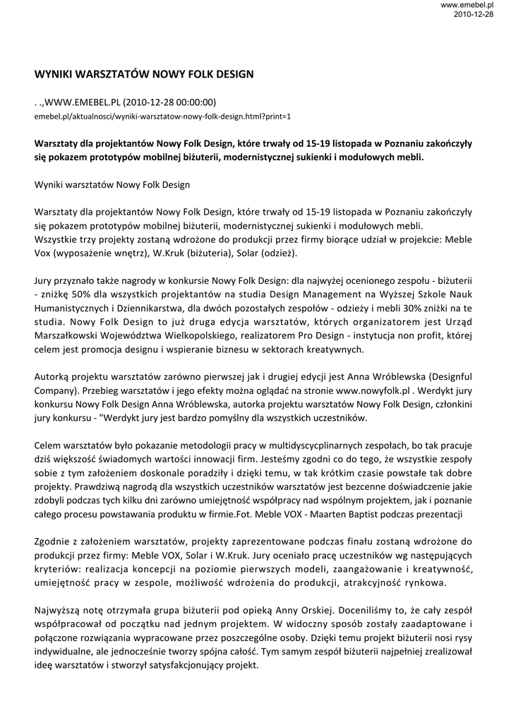 www.emebel.pl 2010-12-28 WYNIKI WARSZTATÓW NOWY FOLK DESIGN . .,WWW.EMEBEL.PL (2010-12-28 00:00:00) emebel.pl/aktualnosci/wyniki-warsztatow-nowy-folk-design.html?print=1 Warsztaty dla projektantów Nowy Folk Design, które trwały od 15-19 listopada w Poznaniu zakończyły się pokazem prototypów mobilnej biżuterii, modernistycznej sukienki i modułowych mebli. Wyniki warsztatów Nowy Folk Design Warsztaty dla projektantów Nowy Folk Design, które trwały od 15-19 listopada w Poznaniu zakończyły się pokazem prototypów mobilnej biżuterii, modernistycznej sukienki i modułowych mebli. Wszystkie trzy projekty zostaną wdrożone do produkcji przez firmy biorące udział w projekcie: Meble Vox (wyposażenie wnętrz), W.Kruk (biżuteria), Solar (odzież). Jury przyznało także nagrody w konkursie Nowy Folk Design: dla najwyżej ocenionego zespołu - biżuterii - zniżkę 50% dla wszystkich projektantów na studia Design Management na Wyższej Szkole Nauk Humanistycznych i Dziennikarstwa, dla dwóch pozostałych zespołów - odzieży i mebli 30% zniżki na te studia. Nowy Folk Design to już druga edycja warsztatów, których organizatorem jest Urząd Marszałkowski Województwa Wielkopolskiego, realizatorem Pro Design - instytucja non profit, której celem jest promocja designu i wspieranie biznesu w sektorach kreatywnych. Autorką projektu warsztatów zarówno pierwszej jak i drugiej edycji jest Anna Wróblewska (Designful Company). Przebieg warsztatów i jego efekty można oglądać na stronie www.nowyfolk.pl . Werdykt jury konkursu Nowy Folk Design Anna Wróblewska, autorka projektu warsztatów Nowy Folk Design, członkini jury konkursu - "Werdykt jury jest bardzo pomyślny dla wszystkich uczestników. Celem warsztatów było pokazanie metodologii pracy w multidyscycplinarnych zespołach, bo tak pracuje dziś większość świadomych wartości innowacji firm. Jesteśmy zgodni co do tego, że wszystkie zespoły sobie z tym założeniem doskonale poradziły i dzięki temu, w tak krótkim czasie powstałe tak dobre projekty. Prawdziwą nagrodą dla wszystkich uczestników warsztatów jest bezcenne doświadczenie jakie zdobyli podczas tych kilku dni zarówno umiejętność współpracy nad wspólnym projektem, jak i poznanie całego procesu powstawania produktu w firmie.Fot. Meble VOX - Maarten Baptist podczas prezentacji Zgodnie z założeniem warsztatów, projekty zaprezentowane podczas finału zostaną wdrożone do produkcji przez firmy: Meble VOX, Solar i W.Kruk. Jury oceniało pracę uczestników wg następujących kryteriów: realizacja koncepcji na poziomie pierwszych modeli, zaangażowanie i kreatywność, umiejętność pracy w zespole, możliwość wdrożenia do produkcji, atrakcyjność rynkowa. Najwyższą notę otrzymała grupa biżuterii pod opieką Anny Orskiej. Doceniliśmy to, że cały zespół współpracował od początku nad jednym projektem. W widoczny sposób zostały zaadaptowane i połączone rozwiązania wypracowane przez poszczególne osoby. Dzięki temu projekt biżuterii nosi rysy indywidualne, ale jednocześnie tworzy spójna całość. Tym samym zespół biżuterii najpełniej zrealizował ideę warsztatów i stworzył satysfakcjonujący projekt. www.emebel.pl 2010-12-28 Doceniając świetną pracę wszystkich grup, jury powiększyło wartość przyznawanych nagród: 50 % zniżki na studia Design Management w Wyższej Szkole Nauk Humanistycznych i Dziennikarstwa otrzymuje zespół biżuterii pod opieką Anny Orskiej w składzie : Justyna Szymczak, Karolina Pytlakowska, Kuba Stobiecki, Sara Gackowska, Michał Włodarczyk. 30% zniżki na studia Design Management w Wyższej Szkole Nauk Humanistycznych i Dziennikarstwa otrzymuje zespół odzieży pod opieką Moniki Jakubiak w składzie: Elżbieta Maksimiuk, Monika Jankowska, Martyna Montewska, Jakub Haber, Anna Nowakowska. 30% zniżki na studia Design Management w Wyższej Szkole Nauk Humanistycznych i Dziennikarstwa otrzymuje zespół mebli pod opieką Maartena Baptista w składzie: Katarzyna Bukowska-Wcisło, Katarzyna Hofman, Malgorzata Mozolewska, Aganieszka Bartosiewicz, Tomasz Pydo". Przebieg warsztatów: Uczestnicy pracowali w multidyscyplinarnych zespołach nad innowacyjnymi projektami produktów inspirowanych folkiem dla branży jubilerskiej, odzieżowej i wyposażenia wnętrz. Opiekunami kreatywnymi poszczególnych grup byli doświadczeni projektanci: Monika Jakubiak, Anna Orska oraz Maarten Baptist. W pierwszych dwóch dniach projektanci uczestniczyli w warsztatach innowacji i kreatywności prowadzone przez Annę Wróblewską (Designful Company) i Sylwię HullWosiek. Odbyły się też prezentacje etnologów o tradycji projektowania odzieży, jubilerstwa oraz wyposażenia wnętrz - to niezbędna porcja wiedzy, którą projektanci wykorzystali w dalszej pracy nad innowacyjnymi produktami inspirowanymi folkiem. Wyzwaniem była wspólna praca zespołu nad jednym projektem - po indywidualnych poszukiwaniach koncepcji i ich prezentacji, projektanci połączyli najlepsze rozwiązania w jeden projekt, który rozwijali przez kolejne trzy dni warsztatów pracując w firmach pod okiem technologów i konstruktorów. W warsztatach wzięli udział studenci ASP z wydziałów wzornictwa, oraz projektanci, którzy zostali wybrani na podstawie przesłanych portfolio z prezentacjami ich projektów. Ideą warsztatów Nowy Folk Design jest wymiana doświadczeń projektowych charakterystycznych dla trzech różnych branż odzieżowej, jubilerskiej i wnętrzarskiej, wzajemne inspiracje i wykorzystanie ich w nowych projektach. Służy temu praca w multidyscyplinarnych zespołach. Połączenie folku ze współczesnym designem i technologią, to także próba ocalenia przed zapomnieniem osiągnięć polskiej sztuki i rzemiosła, a jednocześnie tworzenie nowej wartości w projektowaniu. W projekcie Nowy Folk Design ważna jest rola komunikacji. Wykorzystanie co-creation czyli innowacyjnego narzędzia projektowania polegaj