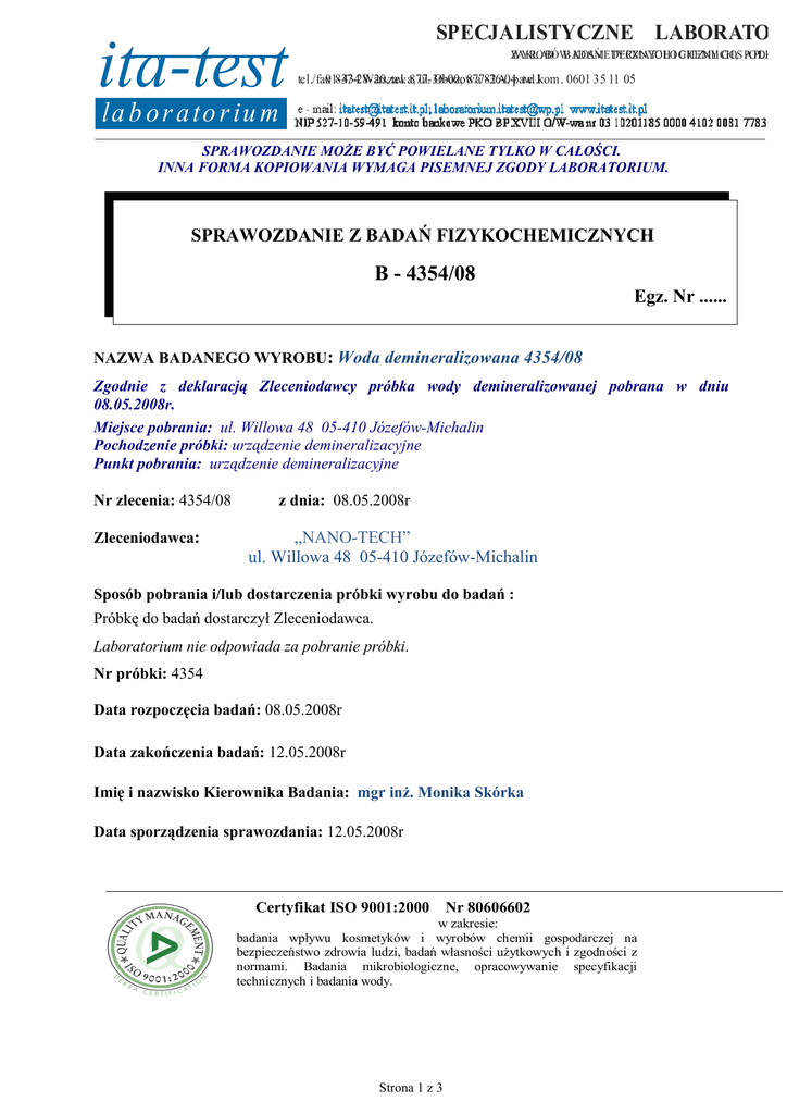 ita-test SPECJALISTYCZNE LABORATORI ZAKŁ AD BADAŃ WYROBÓW KOSMETYCZNYCH DERMATOLOGICZNYCH, I CHEMII GOS PODARC APLIKAC tel./fax01-434 837-28-20, Warszawa, tel. 877-36-00; ul. Obozowa 877-36-04 82 A, paw.1 tel.kom. 0601 35 11 05 la b o r a t o r iu m SPRAWOZDANIE MOŻE BYĆ POWIELANE TYLKO W CAŁOŚCI. INNA FORMA KOPIOWANIA WYMAGA PISEMNEJ ZGODY LABORATORIUM. SPRAWOZDANIE Z BADAŃ FIZYKOCHEMICZNYCH B - 4354/08 Egz. Nr ...... NAZWA BADANEGO WYROBU: Woda demineralizowana 4354/08 Zgodnie z deklaracją Zleceniodawcy próbka wody demineralizowanej pobrana w dniu 08.05.2008r. Miejsce pobrania: ul. Willowa 48 05-410 Józefów-Michalin Pochodzenie próbki: urządzenie demineralizacyjne Punkt pobrania: urządzenie demineralizacyjne Nr zlecenia: 4354/08 Zleceniodawca: z dnia: 08.05.2008r „NANO-TECH” ul. Willowa 48 05-410 Józefów-Michalin Sposób pobrania i/lub dostarczenia próbki wyrobu do badań : Próbkę do badań dostarczył Zleceniodawca. Laboratorium nie odpowiada za pobranie próbki. Nr próbki: 4354 Data rozpoczęcia badań: 08.05.2008r Data zakończenia badań: 12.05.2008r Imię i nazwisko Kierownika Badania: mgr inż. Monika Skórka Data sporządzenia sprawozdania: 12.05.2008r Certyfikat ISO 9001:2000 Nr 80606602 w zakresie: badania wpływu kosmetyków i wyrobów chemii gospodarczej na bezpieczeństwo zdrowia ludzi, badań własności użytkowych i zgodności z normami. Badania mikrobiologiczne, opracowywanie specyfikacji technicznych i badania wody. Strona 1 z 3 WYNIKI BADAŃ Rodzaj/nazwa oznaczenia Lp Jednostka miary Wynik oznaczania (z oszacowanym odchyleniem standardowym) Najwyższa dopuszczalna wartość wg Farmakopea Polska VI (2002) Najwyższa dopuszczalna wartość wg PN-EN ISO 3696 Stopień czystości 3 Metoda oznaczania PB 57/ChM ITA TEST PB 58/ChM ITA TEST 1 Mętność NTU 0 - - 2 Barwa mgPt/l 0 - - 3 Zapach - akceptowalny - - PN-54/C-04585 4 pH w temp. +250C - 6,1±0,1 - 5,0 – 7,5 PB 64/ChM ITA TEST 5 Przewodność właściwa w temp. +200C µS/cm 1,6±0,1 nie więcej niż 4,7 nie więcej niż 5 PN-EN 27888:1999 6 Twardość ogólna (związki wapnia i magnezu) mg CaCO3/l 0 - - PN-91/C-04551/01 7 Żelazo og. mg Fe/l poniżej 0,01 - - PB 19/ChM ITA TEST 8 Mangan mg Mn/l poniżej 0,01 - - PB 17/ChM ITA TEST 9 Chlorki mg Cl/l 0,2±0,1 - - PB 21/ChM ITA TEST 10 Sole amonowe µg NH4/ml poniżej 0,05 nie więcej niż 0,2 - PB 62/ChM ITA TEST 11 Azotyny µg NO2/ml poniżej 0,01 - - PB 63/ChM ITA TEST 12 Azotany µg NO3/ml poniżej 0,01 nie więcej niż 0,2 - PB 18/ChM ITA TEST 13 Indeks nadmanganianowy µg O2/ml 0 - nie więcej niż 0,4 PN-EN-ISO 8467:2001 14 Sucha pozostałość w temp. +1050C µg/ml 0 nie więcej niż 10 nie więcej niż 2 FP VI (2002) str. 236 15 Metale ciężkie µg Pb+2/ml 0,17±0,01 nie więcej niż 1 - FP VI (2002) str. 236 OCENA, OMÓWIENIE WYNIKÓW BADAŃ i WNIOSKI W zakresie oznaczanych wskaźników badana próbka wody demineralizowanej spelnia wymagania ustalone w: • Farmakopei Polska VI (2002) dla wody oczyszczonej • PN-EN ISO 3696:1999 „Woda stosowana w laboratoriach analitycznych. Wymagania i metody badań.” dla stopnia czystości 3 (woda do ogólnego laboratoryjnego zastosowania) Nazwisko i podpis Osoby wykonującej badania Strona 2 z 3 Oświadczenie Kierownika Badania: Oświadczam, że badania wykonano zgodnie z zasadami Dobrej Praktyki Laboratoryjnej, a sprawozdanie końcowe odpowiada danym źródłowym. Data i podpis Kierownika Badania Warszawa, dnia ................................. Sprawozdanie sporządzono w 3 identycznych egzemplarzach. Sprawozdanie otrzymują: Egz. nr 1 i nr 2 – Zleceniodawca Egz. Nr 3 – Archiwum Specjalistycznego Laboratorium Badawczego„ITA – TEST”. Próbka badanego wyrobu pozostaje w Archiwum Specjalistycznego Laboratorium Badawczego „ITA – TEST” przez okres 2 tygodni od daty przystąpienia do badań, po czym jest likwidowana. Wyniki badania odnoszą się wyłącznie do badanej próbki. K O N I E C S P R A W O Z D A N I A Strona 3 z 3
