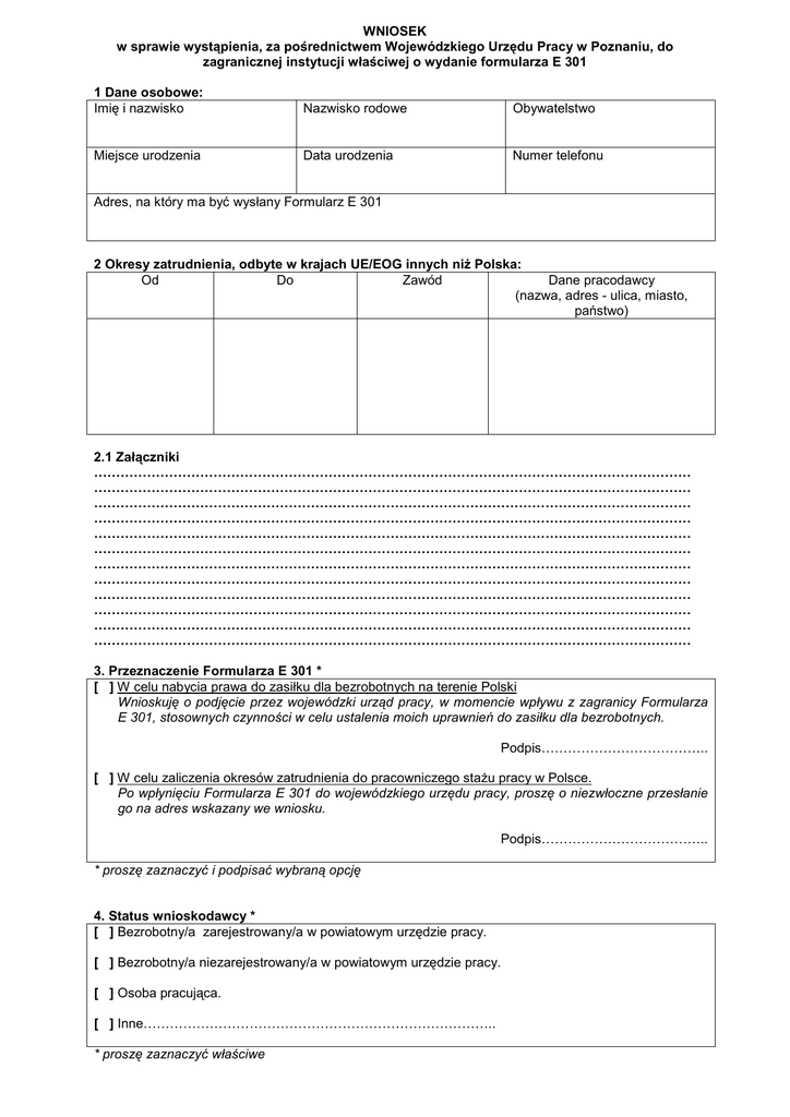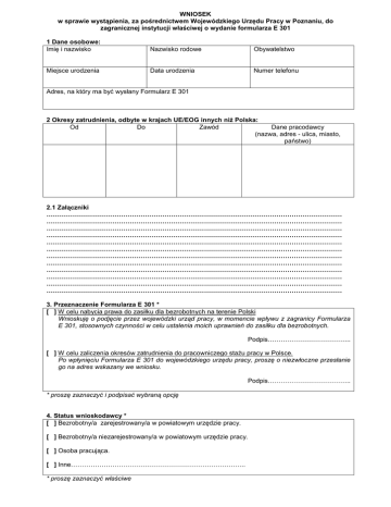 WNIOSEK w sprawie wystąpienia, za pośrednictwem Wojewódzkiego Urzędu Pracy w Poznaniu, do zagranicznej instytucji właściwej o wydanie formularza E 301 1 Dane osobowe: Imię i nazwisko Nazwisko rodowe Obywatelstwo Miejsce urodzenia Data urodzenia Numer telefonu Adres, na który ma być wysłany Formularz E 301 2 Okresy zatrudnienia, odbyte w krajach UE/EOG innych niŜ Polska: Od Do Zawód Dane pracodawcy (nazwa, adres - ulica, miasto, państwo) 2.1 Załączniki ……………………………………………………………………………………………………………………… ……………………………………………………………………………………………………………………… ……………………………………………………………………………………………………………………… ……………………………………………………………………………………………………………………… ……………………………………………………………………………………………………………………… ……………………………………………………………………………………………………………………… ……………………………………………………………………………………………………………………… ……………………………………………………………………………………………………………………… ……………………………………………………………………………………………………………………… ……………………………………………………………………………………………………………………… ……………………………………………………………………………………………………………………… ……………………………………………………………………………………………………………………… 3. Przeznaczenie Formularza E 301 * [ ] W celu nabycia prawa do zasiłku dla bezrobotnych na terenie Polski Wnioskuję o podjęcie przez wojewódzki urząd pracy, w momencie wpływu z zagranicy Formularza E 301, stosownych czynności w celu ustalenia moich uprawnień do zasiłku dla bezrobotnych. Podpis……………………………….. [ ] W celu zaliczenia okresów zatrudnienia do pracowniczego staŜu pracy w Polsce. Po wpłynięciu Formularza E 301 do wojewódzkiego urzędu pracy, proszę o niezwłoczne przesłanie go na adres wskazany we wniosku. Podpis……………………………….. * proszę zaznaczyć i podpisać wybraną opcję 4. Status wnioskodawcy * [ ] Bezrobotny/a zarejestrowany/a w powiatowym urzędzie pracy. [ ] Bezrobotny/a niezarejestrowany/a w powiatowym urzędzie pracy. [ ] Osoba pracująca. [ ] Inne…………………………………………………………………….. * proszę zaznaczyć właściwe 5. Oświadczenie: Oświadczam, Ŝe wyraŜam zgodę na przetwarzanie moich danych osobowych, dla celów koordynacji systemów zabezpieczenia społecznego, na podstawie ustawy z dnia 29 października 1997 r. o ochronie danych osobowych (tekst jednolity z 2002r. Nr 101 poz. 926 ze zm.). Data ………………………… Podpis …………………………… 6. Adnotacje wojewódzkiego urzędu pracy: Data i podpis osoby przyjmującej wniosek ………………………………………………………………………. POUCZENIE 1. 2. Proszę wypełnić wniosek czytelnie drukowanymi literami. Obowiązek udokumentowania okresów ubezpieczenia lub zatrudnienia przebytych w innym państwie członkowskim zgodnie z art. 80 ust. 1 Rozporządzenia Rady EWG nr 574/72 spoczywa na osobie, która pracę świadczyła. Gdy bezrobotny nie posiada Formularza E 301, wojewódzki urząd pracy zwraca się na wniosek osoby o wystawienie Formularza E 301 do instytucji państwa, w którym dany okres ubezpieczenia (zatrudnienia) został przebyty. Oznacza to, Ŝe wojewódzki urząd pracy nie ponosi odpowiedzialności za udokumentowanie tego okresu. 3. Wybranie w pkt. 3 pierwszej opcji powoduje wszczęcie postępowania administracyjnego (art. 61 § 1 kodeksu postępowania administracyjnego) Procedura postępowania wojewódzkiego urzędu pracy przedstawia się wtedy następująco: - z chwilą wpłynięcia do wojewódzkiego urzędu pracy Formularza E 301 wysyłane jest zawiadomienie do wnioskodawcy oraz właściwego ze względu na miejsce zamieszkania powiatowego urzędu pracy, - powiatowy urząd pracy przysyła do wojewódzkiego urzędu pracy dokumenty niezbędne do podjęcia decyzji administracyjnej dotyczącej przyznania/odmowy przyznania prawa do zasiłku, - decyzja wysyłana jest do wnioskodawcy wraz z oryginałem Formularza E 301, oraz do powiatowego urzędu pracy wraz z kopią Formularza E 301. - jeśli Formularz E 301 zostanie przesłany przez instytucję zagraniczną na adres wnioskodawcy, naleŜy go niezwłocznie dostarczyć do wojewódzkiego urzędu pracy. 2.1 Wybranie w pkt. 3 drugiej opcji powoduje: - przesłanie przez wojewódzki urząd pracy Formularza pozyskanego z instytucji zagranicznej na adres wskazany we wniosku. INFORMACJE DODATKOWE - KaŜdy bezrobotny po ustaniu zatrudnienia za granicą niezaleŜnie od tego, czy posiada Formularz E 301, jeŜeli chce otrzymać zasiłek dla bezrobotnych musi koniecznie zarejestrować się w powiatowym urzędzie pracy jako osoba bezrobotna. - Data rejestracji w powiatowym urzędzie pracy ma znaczenie w momencie podejmowania decyzji administracyjnej o przyznaniu zasiłku (bierze się wtedy pod uwagę okres 18 miesięcy poprzedzających dzień rejestracji w powiatowym urzędzie pracy i aby otrzymać zasiłek dla bezrobotnych naleŜy w tym okresie przepracować, co najmniej 365 dni) – art. 71 ust. 1 i 2 ustawy z dnia 20 kwietnia 2004r. o promocji zatrudnienia 