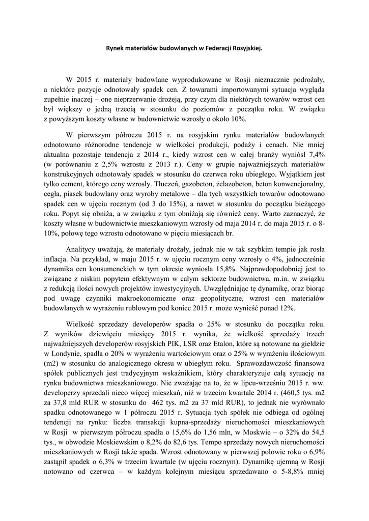 Rynek materiałów budowlanych w Federacji Rosyjskiej. W 2015 r. materiały budowlane wyprodukowane w Rosji nieznacznie podrożały, a niektóre pozycje odnotowały spadek cen. Z towarami importowanymi sytuacja wygląda zupełnie inaczej – one nieprzerwanie drożeją, przy czym dla niektórych towarów wzrost cen był większy o jedną trzecią w stosunku do poziomów z początku roku. W związku z powyższym koszty własne w budownictwie wzrosły o około 10%. W pierwszym półroczu 2015 r. na rosyjskim rynku materiałów budowlanych odnotowano różnorodne tendencje w wielkości produkcji, podaży i cenach. Nie mniej aktualna pozostaje tendencja z 2014 r., kiedy wzrost cen w całej branży wyniósł 7,4% (w porównaniu z 2,5% wzrostu z 2013 r.). Ceny w grupie najważniejszych materiałów konstrukcyjnych odnotowały spadek w stosunku do czerwca roku ubiegłego. Wyjątkiem jest tylko cement, którego ceny wzrosły. Tłuczeń, gazobeton, żelazobeton, beton konwencjonalny, cegła, piasek budowlany oraz wyroby metalowe – dla tych wszystkich towarów odnotowano spadek cen w ujęciu rocznym (od 3 do 15%), a nawet w stosunku do początku bieżącego roku. Popyt się obniża, a w związku z tym obniżają się również ceny. Warto zaznaczyć, że koszty własne w budownictwie mieszkaniowym wzrosły od maja 2014 r. do maja 2015 r. o 810%, połowę tego wzrostu odnotowano w pięciu miesiącach br. Analitycy uważają, że materiały drożały, jednak nie w tak szybkim tempie jak rosła inflacja. Na przykład, w maju 2015 r. w ujęciu rocznym ceny wzrosły o 4%, jednocześnie dynamika cen konsumenckich w tym okresie wyniosła 15,8%. Najprawdopodobniej jest to związane z niskim popytem efektywnym w całym sektorze budownictwa, m.in. w związku z redukcją ilości nowych projektów inwestycyjnych. Uwzględniając tę dynamikę, oraz biorąc pod uwagę czynniki makroekonomiczne oraz geopolityczne, wzrost cen materiałów budowlanych w wyrażeniu rublowym pod koniec 2015 r. może wynieść ponad 12%. Wielkość sprzedaży developerów spadła o 25% w stosunku do początku roku. Z wyników dziewięciu miesięcy 2015 r. wynika, że wielkość sprzedaży trzech najważniejszych developerów rosyjskich PIK, LSR oraz Etalon, które są notowane na giełdzie w Londynie, spadła o 20% w wyrażeniu wartościowym oraz o 25% w wyrażeniu ilościowym (m2) w stosunku do analogicznego okresu w ubiegłym roku. Sprawozdawczość finansowa spółek publicznych jest tradycyjnym wskaźnikiem, który charakteryzuje całą sytuację na rynku budownictwa mieszkaniowego. Nie zważając na to, że w lipcu-wrześniu 2015 r. ww. developerzy sprzedali nieco więcej mieszkań, niż w trzecim kwartale 2014 r. (460,5 tys. m2 za 37,8 mld RUR w stosunku do 462 tys. m2 za 37 mld RUR), to jednak nie wyrównało spadku odnotowanego w 1 półroczu 2015 r. Sytuacja tych spółek nie odbiega od ogólnej tendencji na rynku: liczba transakcji kupna-sprzedaży nieruchomości mieszkaniowych w Rosji w pierwszym półroczu spadła o 15,6% do 1,56 mln, w Moskwie – o 32% do 54,5 tys., w obwodzie Moskiewskim o 8,2% do 82,6 tys. Tempo sprzedaży nowych nieruchomości mieszkaniowych w Rosji także spada. Wzrost odnotowany w pierwszej połowie roku o 6,9% zastąpił spadek o 6,3% w trzecim kwartale (w ujęciu rocznym). Dynamikę ujemną w Rosji notowano od czerwca – w każdym kolejnym miesiącu sprzedawano o 5-8,8% mniej nieruchomości mieszkaniowych niż w analogicznych okresach 2014 r. Wg danych Rosstat (Urzędu Statystycznego Federacji Rosyjskiej) wartość prac w budownictwie w styczniusierpniu 2015 r. wyniosła 3,32 bilionów RUR (47 mld EUR), czyli o 8,1% mniej niż w analogicznym okresie ubiegłego roku. Ogólny spadek w branży budownictwa powoduje, że nasila się konkurencja pomiędzy producentami materiałów budowlanych, producenci zmniejszają narzut, zależy im na każdym kliencie, szczególnie w dziedzinie materiałów izolacyjnych. Z tego też względu większość producentów stara się zachować ceny na poziomie ubiegłego roku. Jednym z podstawowych wskaźników zmian na rynku materiałów budowlanych jest cement, który jest najważniejszym składnikiem do mieszanek budowlanych i wykończeniowych oraz materiałów i konstrukcji budowlanych. Do głównych towarów w Rosji zaliczamy także cegłę ceramiczną i silikatową. Rynek cementu w 2015 r. charakteryzuje się zmianą udziałów poszczególnych firm: niektórzy najważniejsi gracze zmniejszają udział wielkość produkcji cementu, inni zwiększają. Jednocześnie odnotowano spadek produkcji cementu o 10-12% w stosunku do wskaźników z drugiego półrocza ubiegłego roku. Redukcja jest spowodowana zmniejszeniem wartości importu i eksportu oraz wskaźników popytu krajowego (-12% rok do roku). Podczas kryzysu w 2008 r. podobnie odnotowano spadek produkcji cementu, który jednak był związany z wwozem tańszych surowców zagranicznych, natomiast sytuację obecną wywołuje przede wszystkim zmniejszenie popytu na rynku krajowym. Poza tym ogólna destabilizacja geopolityczna obniża atrakcyjność sektora pod względem inwestycji. Spadek wielkości inwestycji, obniżenie popytu na cement, wzrost taryf na źródła energii spowodowały wzrost cen cementu w pierwszym półroczu 2015 r. o 1,5% miesięcznie. Eksperci zakładają, że do końca 2015 r. cena cementu wzrośnie o 15-17% w stosunku do grudnia 2014 r. Interesujące zmiany zachodzą również w sektorze produkcji cegły. W pierwszym półroczu 2015 r. odnotowano spadek produkcji czerwonej cegły ceramicznej o 1,5% w ujęciu rocznym, szczególnie potężny spadek nastąpił w Centralnym okręgu Federacji Rosyjskiej (-4%). Z tego powodu przez sześć miesięcy ceny producentów cegły ceramicznej wzrosły o 4,5% (w całym 2014 r. przyrost wyniósł 5%). Z drugiej strony, produkcja tańszej cegły silikatowej w styczniu-czerwcu 2015 wzrosła o 10% w stosunku do wyników odnotowanych w pierwszym półroczu 2014