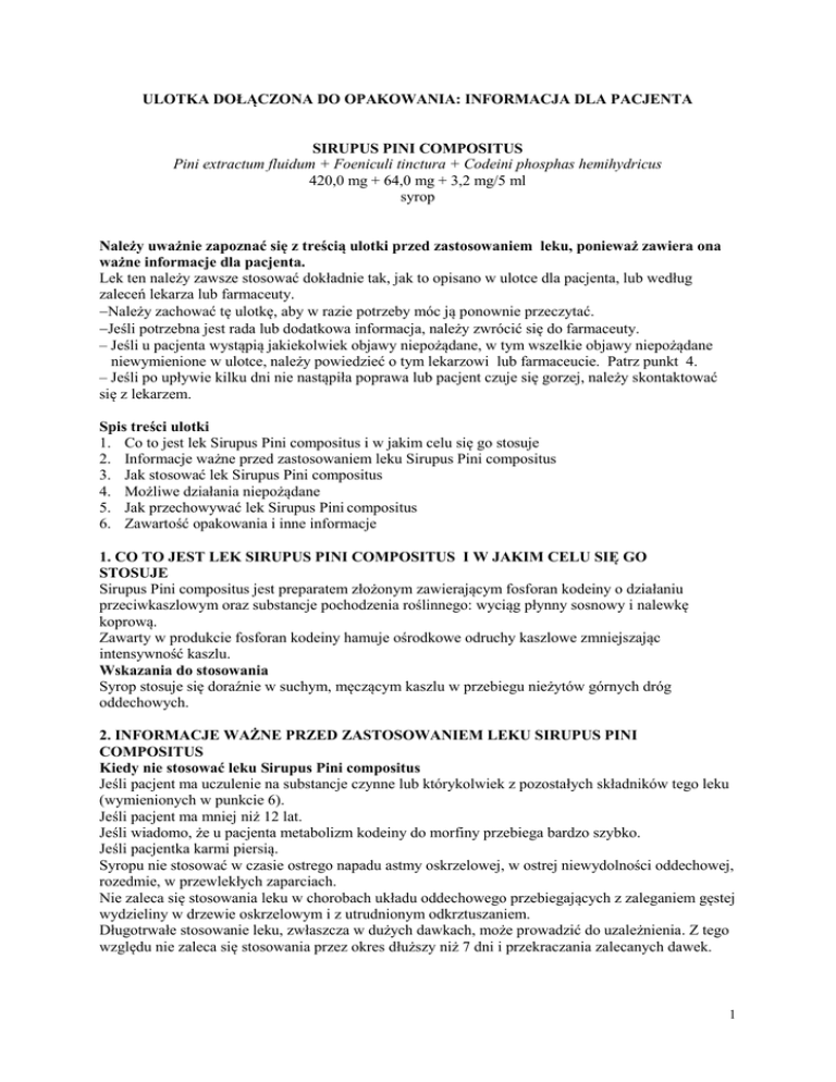ULOTKA DOŁĄCZONA DO OPAKOWANIA: INFORMACJA DLA PACJENTA SIRUPUS PINI COMPOSITUS Pini extractum fluidum + Foeniculi tinctura + Codeini phosphas hemihydricus 420,0 mg + 64,0 mg + 3,2 mg/5 ml syrop Należy uważnie zapoznać się z treścią ulotki przed zastosowaniem leku, ponieważ zawiera ona ważne informacje dla pacjenta. Lek ten należy zawsze stosować dokładnie tak, jak to opisano w ulotce dla pacjenta, lub według zaleceń lekarza lub farmaceuty. Należy zachować tę ulotkę, aby w razie potrzeby móc ją ponownie przeczytać. Jeśli potrzebna jest rada lub dodatkowa informacja, należy zwrócić się do farmaceuty. – Jeśli u pacjenta wystąpią jakiekolwiek objawy niepożądane, w tym wszelkie objawy niepożądane niewymienione w ulotce, należy powiedzieć o tym lekarzowi lub farmaceucie. Patrz punkt 4. – Jeśli po upływie kilku dni nie nastąpiła poprawa lub pacjent czuje się gorzej, należy skontaktować się z lekarzem. Spis treści ulotki 1. Co to jest lek Sirupus Pini compositus i w jakim celu się go stosuje 2. Informacje ważne przed zastosowaniem leku Sirupus Pini compositus 3. Jak stosować lek Sirupus Pini compositus 4. Możliwe działania niepożądane 5. Jak przechowywać lek Sirupus Pini compositus 6. Zawartość opakowania i inne informacje 1. CO TO JEST LEK SIRUPUS PINI COMPOSITUS I W JAKIM CELU SIĘ GO STOSUJE Sirupus Pini compositus jest preparatem złożonym zawierającym fosforan kodeiny o działaniu przeciwkaszlowym oraz substancje pochodzenia roślinnego: wyciąg płynny sosnowy i nalewkę koprową. Zawarty w produkcie fosforan kodeiny hamuje ośrodkowe odruchy kaszlowe zmniejszając intensywność kaszlu. Wskazania do stosowania Syrop stosuje się doraźnie w suchym, męczącym kaszlu w przebiegu nieżytów górnych dróg oddechowych. 2. INFORMACJE WAŻNE PRZED ZASTOSOWANIEM LEKU SIRUPUS PINI COMPOSITUS Kiedy nie stosować leku Sirupus Pini compositus Jeśli pacjent ma uczulenie na substancje czynne lub którykolwiek z pozostałych składników tego leku (wymienionych w punkcie 6). Jeśli pacjent ma mniej niż 12 lat. Jeśli wiadomo, że u pacjenta metabolizm kodeiny do morfiny przebiega bardzo szybko. Jeśli pacjentka karmi piersią. Syropu nie stosować w czasie ostrego napadu astmy oskrzelowej, w ostrej niewydolności oddechowej, rozedmie, w przewlekłych zaparciach. Nie zaleca się stosowania leku w chorobach układu oddechowego przebiegających z zaleganiem gęstej wydzieliny w drzewie oskrzelowym i z utrudnionym odkrztuszaniem. Długotrwałe stosowanie leku, zwłaszcza w dużych dawkach, może prowadzić do uzależnienia. Z tego względu nie zaleca się stosowania przez okres dłuższy niż 7 dni i przekraczania zalecanych dawek. 1 Ostrzeżenia i środki ostrożności Produkt zawiera ok. 12 g sacharozy w 15 ml. Należy to wziąć pod uwagę u pacjentów z cukrzycą. Jeżeli stwierdzono wcześniej u pacjenta nietolerancję niektórych cukrów, przed zastosowaniem leku należy skontaktować się z lekarzem. Produkt leczniczy zawiera do 5,0 % m/m etanolu (alkoholu), tzn. do 975 mg alkoholu w pojedynczej dawce 15 ml, co jest równoważne 20 ml piwa i 8 ml wina . Ze względu na zawartość etanolu syrop nie powinien być stosowany u osób z chorobą alkoholową oraz u pacjentów z chorobami wątroby lub padaczką. Kodeina jest przekształcana w morfinę w wątrobie z udziałem enzymu. Morfina jest substancją, która warunkuje działanie kodeiny. U niektórych osób występuje odmiana tego enzymu, co może powodować u nich różne działanie. U niektórych osób morfina nie powstaje lub powstaje w bardzo małych ilościach i wówczas nie będzie miała działania przeciwkaszlowego. U innych osób jest bardziej prawdopodobne wystąpienie ciężkich działań niepożądanych ze względu na bardzo duże ilości powstającej morfiny. Jeśli u pacjenta wystąpi którykolwiek z następujących objawów niepożądanych, należy przerwać stosowanie tego leku i natychmiast zasięgnąć porady lekarza: powolny lub płytki oddech, dezorientacja, senność, zwężenie źrenic, nudności lub wymioty, zaparcia, brak apetytu. Młodzież w wieku powyżej 12 lat Nie zaleca się stosowania leku Sirupus Pini compositus u młodzieży z zaburzeniami czynności układu oddechowego w leczeniu kaszlu lub przeziębienia. Lek Sirupus Pini compositus a inne leki Należy powiedzieć lekarzowi lub farmaceucie o wszystkich lekach stosowanych przez pacjenta obecnie lub ostatnio, a także o lekach, które pacjent planuje stosować. Fosforan kodeiny może nasilać depresyjne działanie na ośrodkowy układ nerwowy niektórych leków przeciwdepresyjnych (z grupy benzodiazepiny), nasennych (pochodnych kwasu barbiturowego), neuroleptyków. Może zwiększać depresyjne działanie na ośrodek oddechowy innych leków opioidowych oraz nasilać działanie etanolu. Stosowany równocześnie z kodeiną glutetymid może wywołać stan euforii. Kodeina może też wchodzić w interakcje z inhibitorami MAO (monoaminooksydazy), lekami przeciwhistaminowymi i lekami obniżającymi ciśnienie tętnicze krwi. Ciąża, karmienie piersią i wpływ na płodność Nie należy przyjmować leku Sirupus Pini compositus w czasie ciąży oraz w okresie karmienia piersią. Kodeina i morfina przenikają do mleka matki. Jeśli pacjentka przypuszcza że może być w ciąży lub gdy planuje mieć dziecko, powinna poradzić się lekarza lub farmaceuty przed zastosowaniem leku. Prowadzenie pojazdów i obsługiwanie maszyn Lek może zaburzać sprawność psychofizyczną, dlatego podczas leczenia pacjenci nie powinni prowadzić pojazdów i obsługiwać maszyn. 3. JAK STOSOWAĆ LEK SIRUPUS PINI COMPOSITUS Ten lek należy zawsze stosować dokładnie tak, jak to opisano w ulotce dla pacjenta lub według zaleceń lekarza lub farmaceuty. W razie wątpliwości należy zwrócić się do lekarza lub farmaceuty. Lek dawkować dołączoną do opakowania miarką. Stosować doustnie. Dorośli i młodzież powyżej 12 lat: 3 