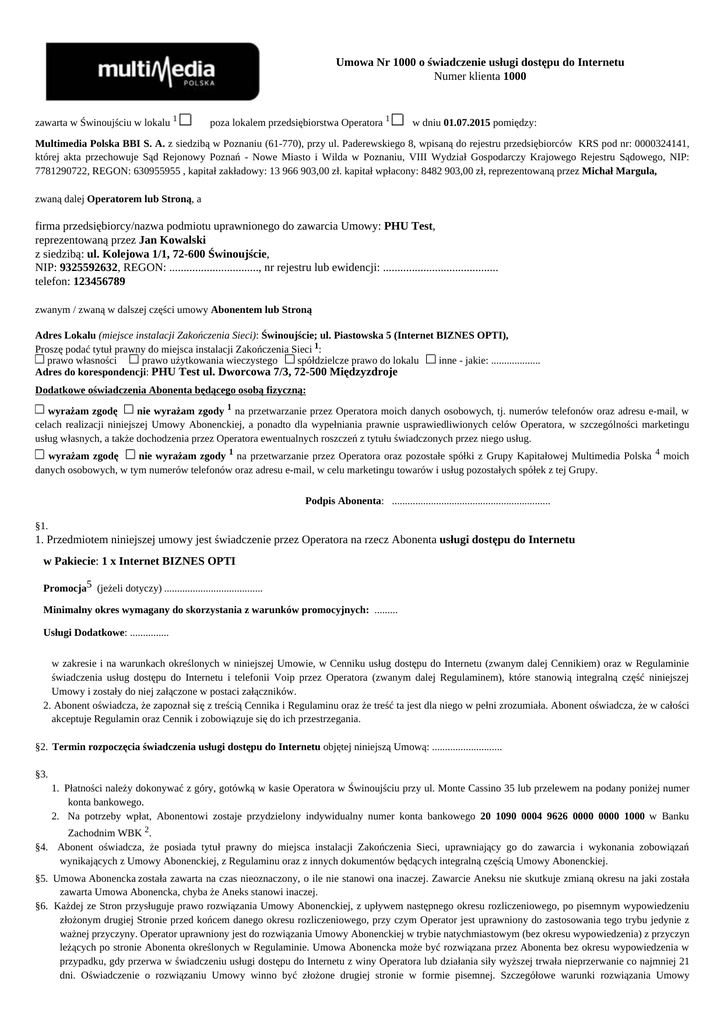 Umowa Nr 1000 o świadczenie usługi dostępu do Internetu Numer klienta 1000 zawarta w Świnoujściu w lokalu 1 poza lokalem przedsiębiorstwa Operatora 1 w dniu 01.07.2015 pomiędzy: Multimedia Polska BBI S. A. z siedzibą w Poznaniu (61770), przy ul. Paderewskiego 8, wpisaną do rejestru przedsiębiorców KRS pod nr: 0000324141, której akta przechowuje Sąd Rejonowy Poznań Nowe Miasto i Wilda w Poznaniu, VIII Wydział Gospodarczy Krajowego Rejestru Sądowego, NIP: 7781290722, REGON: 630955955 , kapitał zakładowy: 13 966 903,00 zł. kapitał wpłacony: 8482 903,00 zł, reprezentowaną przez Michał Margula, zwaną dalej Operatorem lub Stroną, a firma przedsiębiorcy/nazwa podmiotu uprawnionego do zawarcia Umowy: PHU Test, reprezentowaną przez Jan Kowalski z siedzibą: ul. Kolejowa 1/1, 72600 Świnoujście, NIP: 9325592632, REGON: ..............................., nr rejestru lub ewidencji: ........................................ telefon: 123456789 zwanym / zwaną w dalszej części umowy Abonentem lub Stroną Adres Lokalu (miejsce instalacji Zakończenia Sieci): Świnoujście; ul. Piastowska 5 (Internet BIZNES OPTI), Proszę podać tytuł prawny do miejsca instalacji Zakończenia Sieci 1: prawo własności prawo użytkowania wieczystego spółdzielcze prawo do lokalu inne jakie: ................... Adres do korespondencji: PHU Test ul. Dworcowa 7/3, 72500 Międzyzdroje Dodatkowe oświadczenia Abonenta będącego osobą fizyczną: wyrażam zgodę nie wyrażam zgody 1 na przetwarzanie przez Operatora moich danych osobowych, tj. numerów telefonów oraz adresu email, w celach realizacji niniejszej Umowy Abonenckiej, a ponadto dla wypełniania prawnie usprawiedliwionych celów Operatora, w szczególności marketingu usług własnych, a także dochodzenia przez Operatora ewentualnych roszczeń z tytułu świadczonych przez niego usług. wyrażam zgodę nie wyrażam zgody 1 na przetwarzanie przez Operatora oraz pozostałe spółki z Grupy Kapitałowej Multimedia Polska 4 moich danych osobowych, w tym numerów telefonów oraz adresu email, w celu marketingu towarów i usług pozostałych spółek z tej Grupy. Podpis Abonenta: ............................................................. §1. 1. Przedmiotem niniejszej umowy jest świadczenie przez Operatora na rzecz Abonenta usługi dostępu do Internetu w Pakiecie: 1 x Internet BIZNES OPTI Promocja5 (jeżeli dotyczy) ...................................... Minimalny okres wymagany do skorzystania z warunków promocyjnych: ......... Usługi Dodatkowe: ............... w zakresie i na warunkach określonych w niniejszej Umowie, w Cenniku usług dostępu do Internetu (zwanym dalej Cennikiem) oraz w Regulaminie świadczenia usług dostępu do Internetu i telefonii Voip przez Operatora (zwanym dalej Regulaminem), które stanowią integralną część niniejszej Umowy i zostały do niej załączone w postaci załączników. 2. Abonent oświadcza, że zapoznał się z treścią Cennika i Regulaminu oraz że treść ta jest dla niego w pełni zrozumiała. Abonent oświadcza, że w całości akceptuje Regulamin oraz Cennik i zobowiązuje się do ich przestrzegania. §2. Termin rozpoczęcia świadczenia usługi dostępu do Internetu objętej niniejszą Umową: ........................... §3. 1. Płatności należy dokonywać z góry, gotówką w kasie Operatora w Świnoujściu przy ul. Monte Cassino 35 lub przelewem na podany poniżej numer konta bankowego. 2. Na potrzeby wpłat, Abonentowi zostaje przydzielony indywidualny numer konta bankowego 20 1090 0004 9626 0000 0000 1000 w Banku Zachodnim WBK 2. §4. Abonent oświadcza, że posiada tytuł prawny do miejsca instalacji Zakończenia Sieci, uprawniający go do zawarcia i wykonania zobowiązań wynikających z Umowy Abonenckiej, z Regulaminu oraz z innych dokumentów będących integralną częścią Umowy Abonenckiej. §5. Umowa Abonencka została zawarta na czas nieoznaczony, o ile nie stanowi ona inaczej. Zawarcie Aneksu nie skutkuje zmianą okresu na jaki została zawarta Umowa Abonencka, chyba że Aneks stanowi inaczej. §6. Każdej ze Stron przysługuje prawo rozwiązania Umowy Abonenckiej, z upływem następnego okresu rozliczeniowego, po pisemnym wypowiedzeniu złożonym drugiej Stronie przed końcem danego okresu rozliczeniowego, przy czym Operator jest uprawniony do zastosowania tego trybu jedynie z ważnej przyczyny. Operator uprawniony jest do rozwiązania Umowy Abonenckiej w trybie natychmiastowym (bez okresu wypowiedzenia) z przyczyn leżących po stronie Abonenta określonych w Regulaminie. Umowa Abonencka może być rozwiązana przez Abonenta bez okresu wypowiedzenia w przypadku, gdy przerwa w świadczeniu usługi dostępu do Internetu z winy Operatora lub działania siły wyższej trwała nieprzerwanie co najmniej 21 dni. Oświadczenie o rozwiązaniu Umowy winno być złożone drugiej stronie w formie pisemnej. Szczegółowe warunki rozwiązania Umowy Abonenckiej zawarte są w Regulaminie. §7. Abonent, o ile uregulował wszystkie wymagalne należności wobec Operatora, ma prawo do zmiany zakresu świadczonej usługi dostępu do Internetu, w tym do zmiany Pakietu lub/i zamówienia Usług Dodatkowych, na zasadach określonych w Regulaminie i Cenniku, zgodnie z istniejącymi możliwościami technicznymi. Zmiana zakresu świadczonej usługi dostępu do Internetu wymaga zawarcia aneksu do Umowy Abonenckiej. §8. Operator doręcza Abonentowi na piśmie treść każdej proponowanej zmiany warunków Umowy Abonenckiej, a w przypadku zmiany warunków określonych w Regulaminie doręcza Abonentowi na piśmie oraz podaje do publicznej wiadomości treść każdej proponowanej zmiany warunków Umowy Abonenckiej, z wyprzedzeniem co najmniej jednego miesiąca przed wprowadzeniem tych zmian w życie. Na żądanie Abonenta, Operator dostarcza treść każdej proponowanej zmiany warunków Umowy Abonenckiej, w tym określonych w Regulaminie, drogą elektroniczną na wskazany przez Abonenta w tym c